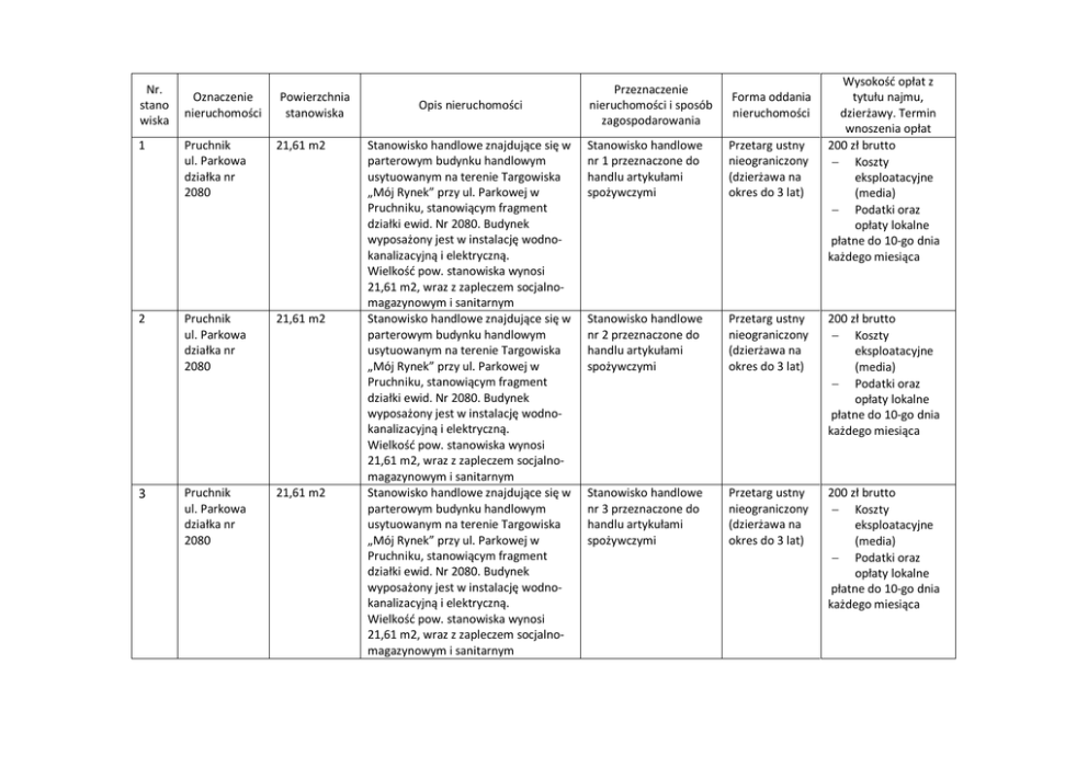 Nr. stano wiska Oznaczenie nieruchomości Powierzchnia stanowiska 1 Pruchnik ul. Parkowa działka nr 2080 21,61 m2 2 Pruchnik ul. Parkowa działka nr 2080 21,61 m2 3 Pruchnik ul. Parkowa działka nr 2080 21,61 m2 Opis nieruchomości Stanowisko handlowe znajdujące się w parterowym budynku handlowym usytuowanym na terenie Targowiska „Mój Rynek” przy ul. Parkowej w Pruchniku, stanowiącym fragment działki ewid. Nr 2080. Budynek wyposażony jest w instalację wodnokanalizacyjną i elektryczną. Wielkość pow. stanowiska wynosi 21,61 m2, wraz z zapleczem socjalnomagazynowym i sanitarnym Stanowisko handlowe znajdujące się w parterowym budynku handlowym usytuowanym na terenie Targowiska „Mój Rynek” przy ul. Parkowej w Pruchniku, stanowiącym fragment działki ewid. Nr 2080. Budynek wyposażony jest w instalację wodnokanalizacyjną i elektryczną. Wielkość pow. stanowiska wynosi 21,61 m2, wraz z zapleczem socjalnomagazynowym i sanitarnym Stanowisko handlowe znajdujące się w parterowym budynku handlowym usytuowanym na terenie Targowiska „Mój Rynek” przy ul. Parkowej w Pruchniku, stanowiącym fragment działki ewid. Nr 2080. Budynek wyposażony jest w instalację wodnokanalizacyjną i elektryczną. Wielkość pow. stanowiska wynosi 21,61 m2, wraz z zapleczem socjalnomagazynowym i sanitarnym Wysokość opłat z tytułu najmu, dzierżawy. Termin wnoszenia opłat 200 zł brutto Koszty eksploatacyjne (media) Podatki oraz opłaty lokalne płatne do 10-go dnia każdego miesiąca Przeznaczenie nieruchomości i sposób zagospodarowania Forma oddania nieruchomości Stanowisko handlowe nr 1 przeznaczone do handlu artykułami spożywczymi Przetarg ustny nieograniczony (dzierżawa na okres do 3 lat) Stanowisko handlowe nr 2 przeznaczone do handlu artykułami spożywczymi Przetarg ustny nieograniczony (dzierżawa na okres do 3 lat) 200 zł brutto Koszty eksploatacyjne (media) Podatki oraz opłaty lokalne płatne do 10-go dnia każdego miesiąca Stanowisko handlowe nr 3 przeznaczone do handlu artykułami spożywczymi Przetarg ustny nieograniczony (dzierżawa na okres do 3 lat) 200 zł brutto Koszty eksploatacyjne (media) Podatki oraz opłaty lokalne płatne do 10-go dnia każdego miesiąca 4 Pruchnik ul. Parkowa działka nr 2080 21,23 m2 5 Pruchnik ul. Parkowa działka nr 2080 21,23 m2 6 Pruchnik ul. Parkowa działka nr 2080 21,61 m2 Stanowisko handlowe znajdujące się w parterowym budynku handlowym usytuowanym na terenie Targowiska „Mój Rynek” przy ul. Parkowej w Pruchniku, stanowiącym fragment działki ewid. Nr 2080. Budynek wyposażony jest w instalację wodnokanalizacyjną i elektryczną. Wielkość pow. stanowiska wynosi 21,23 m2, wraz z zapleczem socjalnomagazynowym i sanitarnym Stanowisko handlowe znajdujące się w parterowym budynku handlowym usytuowanym na terenie Targowiska „Mój Rynek” przy ul. Parkowej w Pruchniku, stanowiącym fragment działki ewid. Nr 2080. Budynek wyposażony jest w instalację wodnokanalizacyjną i elektryczną. Wielkość pow. stanowiska wynosi 21,23 m2, wraz z zapleczem socjalnomagazynowym i sanitarnym Stanowisko handlowe znajdujące się w parterowym budynku handlowym usytuowanym na terenie Targowiska „Mój Rynek” przy ul. Parkowej w Pruchniku, stanowiącym fragment działki ewid. Nr 2080. Budynek wyposażony jest w instalację wodnokanalizacyjną i elektryczną. Wielkość pow. stanowiska wynosi 21,61 m2, wraz z zapleczem socjalnomagazynowym i sanitarnym Stanowisko handlowe nr 4 przeznaczone do handlu artykułami spożywczymi Przetarg ustny nieograniczony (dzierżawa na okres do 3 lat) 200 zł brutto Koszty eksploatacyjne (media) Podatki oraz opłaty lokalne płatne do 10-go dnia każdego miesiąca Stanowisko handlowe nr 5 przeznaczone do handlu artykułami rolno - przemysłowymi Przetarg ustny nieograniczony (dzierżawa na okres do 3 lat) 200 zł brutto Koszty eksploatacyjne (media) Podatki oraz opłaty lokalne płatne do 10-go dnia każdego miesiąca Stanowisko handlowe nr 6 przeznaczone do handlu artykułami rolno - przemysłowymi Przetarg ustny nieograniczony (dzierżawa na okres do 3 lat) 200 zł brutto Koszty eksploatacyjne (media) Podatki oraz opłaty lokalne płatne do 10-go dnia każdego miesiąca 7 Pruchnik ul. Parkowa działka nr 2080 21,61 m2 8 Pruchnik ul. Parkowa działka nr 2080 21,61 m2 Stanowisko handlowe znajdujące się w parterowym budynku handlowym usytuowanym na terenie Targowiska „Mój Rynek” przy ul. Parkowej w Pruchniku, stanowiącym fragment działki ewid. Nr 2080. Budynek wyposażony jest w instalację wodnokanalizacyjną i elektryczną. Wielkość pow. stanowiska wynosi 21,61 m2, wraz z zapleczem socjalnomagazynowym i sanitarnym Stanowisko handlowe znajdujące się w parterowym budynku handlowym usytuowanym na terenie Targowiska „Mój Rynek” przy ul. Parkowej w Pruchniku, stanowiącym fragment działki ewid. Nr 2080. Budynek wyposażony jest w instalację wodnokanalizacyjną i elektryczną. Wielkość pow. stanowiska wynosi 21,61 m2, wraz z zapleczem socjalnomagazynowym i sanitarnym Stanowisko handlowe nr 7 przeznaczone do handlu odzieżą Przetarg ustny nieograniczony (dzierżawa na okres do 3 lat) 200 zł brutto Koszty eksploatacyjne (media) Podatki oraz opłaty lokalne płatne do 10-go dnia każdego miesiąca Stanowisko handlowe nr 8 przeznaczone do handlu odzieżą Przetarg ustny nieograniczony (dzierżawa na okres do 3 lat) 200 zł brutto Koszty eksploatacyjne (media) Podatki oraz opłaty lokalne płatne do 10-go dnia każdego miesiąca