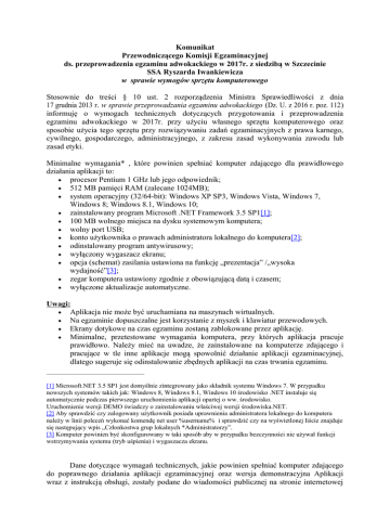 Komunikat Przewodniczącego Komisji Egzaminacyjnej ds. przeprowadzenia egzaminu adwokackiego w 2017r. z siedzibą w Szczecinie SSA Ryszarda Iwankiewicza w sprawie wymogów sprzętu komputerowego Stosownie do treści § 10 ust. 2 rozporządzenia Ministra Sprawiedliwości z dnia 17 grudnia 2013 r. w sprawie przeprowadzania egzaminu adwokackiego (Dz. U. z 2016 r. poz. 112) informuję o wymogach technicznych dotyczących przygotowania i przeprowadzenia egzaminu adwokackiego w 2017r. przy użyciu własnego sprzętu komputerowego oraz sposobie użycia tego sprzętu przy rozwiązywaniu zadań egzaminacyjnych z prawa karnego, cywilnego, gospodarczego, administracyjnego, z zakresu zasad wykonywania zawodu lub zasad etyki. Minimalne wymagania* , które powinien spełniać komputer zdającego dla prawidłowego działania aplikacji to: procesor Pentium 1 GHz lub jego odpowiednik; 512 MB pamięci RAM (zalecane 1024MB); system operacyjny (32/64-bit): Windows XP SP3, Windows Vista, Windows 7, Windows 8; Windows 8.1, Windows 10; zainstalowany program Microsoft .NET Framework 3.5 SP1[1]; 100 MB wolnego miejsca na dysku systemowym komputera; wolny port USB; konto użytkownika o prawach administratora lokalnego do komputera[2]; odinstalowany program antywirusowy; wyłączony wygaszacz ekranu; opcja (schemat) zasilania ustawiona na funkcję „prezentacja” /„wysoka wydajność”[3]; zegar komputera ustawiony zgodnie z obowiązującą datą i czasem; wyłączone aktualizacje automatyczne. Uwagi: Aplikacja nie może być uruchamiana na maszynach wirtualnych. Na egzaminie dopuszczalne jest korzystanie z myszek i klawiatur przewodowych. Ekrany dotykowe na czas egzaminu zostaną zablokowane przez aplikację. Minimalne, przetestowane wymagania komputera, przy których aplikacja pracuje prawidłowo. Należy mieć na uwadze, że zainstalowane na komputerze zdającego i pracujące w tle inne aplikacje mogą spowolnić działanie aplikacji egzaminacyjnej, dlatego sugeruje się odinstalowanie zbędnych aplikacji na czas trwania egzaminu. [1] Microsoft.NET 3.5 SP1 jest domyślnie zintegrowany jako składnik systemu Windows 7. W przypadku nowszych systemów takich jak: Windows 8, Windows 8.1, Windows 10 środowisko .NET instaluje się automatycznie podczas pierwszego uruchomienia aplikacji opartej o ww. środowisko. Uruchomienie wersji DEMO świadczy o zainstalowaniu właściwej wersji środowiska.NET. [2] Aby sprawdzić czy zalogowany użytkownik posiada uprawnienia administratora lokalnego do komputera należy w linii poleceń wykonać komendę net user %username% i sprawdzić czy na wyświetlonej liście znajduje się następujący wpis „Członkostwa grup lokalnych *Administratorzy”. [3] Komputer powinien być skonfigurowany w taki sposób aby w przypadku bezczynności nie używał funkcji wstrzymywania systemu (tryb uśpienia) i wygaszacza ekranu. Dane dotyczące wymagań technicznych, jakie powinien spełniać komputer zdającego do poprawnego działania aplikacji egzaminacyjnej oraz wersja demonstracyjna Aplikacji wraz z instrukcją obsługi, zostały podane do wiadomości publicznej na stronie internetowej Ministerstwa Sprawiedliwości w zakładce „Egzaminy Prawnicze/Zawodowe egzaminy prawnicze/Aplikacja do zdawania egzaminów prawniczych”. Założenia dotyczące zamieszczenia wersji demonstracyjnej Aplikacji: zapoznanie się zdających z funkcjonalnością aplikacji; zebranie uwag celem poprawy funkcjonalności. Aplikacja jest udostępniona w wersji demonstracyjnej i ze względów bezpieczeństwa posiada wyłączone zabezpieczenia oraz funkcję zapisu pracy. Zabronione jest debugowanie, dekompilowanie i jakakolwiek ingerencja w kod programu. Wersję finalną aplikacji zdający otrzymają przed rozpoczęciem egzaminów na nośnikach pamięci – pendrive (nośniki te zapewni Ministerstwo Sprawiedliwości). W celu rozpoczęcia testowania „Aplikacji do zdawania egzaminów prawniczych” należy: Pobrać plik DEMO.zip Rozpakować plik DEMO.zip na dysku lokalnym komputera Uruchomić plik START.exe z katalogu AZEP W przypadku pytań technicznych dotyczących Aplikacji AZEP, prosimy o kontakt: [email protected] INFORMACJE DODATKOWE 1. Przygotowanie sprzętu komputerowego – zgodnie z parametrami, które zostały podane na stronie www.ms.gov.pl – jest obowiązkiem osób, które zadeklarowały taką formę rozwiązywania zadań. 2. Zgodnie § 10 ust. 3 rozporządzenia nie później niż 21 dni przed terminem egzaminu adwokackiego, tj. do dnia 07 marca 2017r. zdający składa przewodniczącemu komisji egzaminacyjnej lub jego zastępcy pisemną informację o wyborze sposobu rozwiązywania zadań egzaminacyjnych w formie odręcznej albo przy użyciu własnego sprzętu komputerowego. W przypadku wyboru rozwiązania zadań przy użyciu sprzętu komputerowego, zdający winien złożyć także pisemne oświadczenie o akceptacji warunków związanych z użyciem sprzętu komputerowego zawierające deklarację, że znane mu są wymienione w § 10 ust. 4 i 5 rozporządzenia zagrożenia związane z użyciem tego sprzętu. 3. Zdający, którzy wybiorą możliwość rozwiązywania zadań przy użyciu sprzętu komputerowego, winni sprzęt ten przynieść na egzamin we własnym zakresie. 4. W przypadku wątpliwości zdających, czy sprzęt komputerowy, na którym zamierzają rozwiązywać zadania spełnia wymagania techniczne, zdający winni – przed egzaminem i we własnym zakresie – skorzystać z pomocy informatyka. SSA Ryszard Iwankiewicz