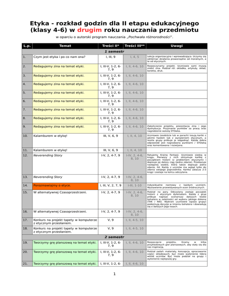Etyka - rozkład godzin dla II etapu edukacyjnego (klasy 4-6) w drugim roku nauczania przedmiotu w oparciu o autorski program nauczania „Pochwała różnorodności”. L.p. Temat Treści II* Treści III** Uwagi 1 semestr 1. Czym jest etyka i po co nam ona? I, III, 9 I, 4, 5 Lekcja organizacyjna i wprowadzająca. Uczymy się odróżniać działania praworządne od moralnych, a te od etycznych. 2. Redagujemy zina na temat etyki. I, III-V, 1-2, 67, 9 I, II, 4-6, 10 Rozpoczynamy projekt. Uczniowie sami muszą zrobić zina. Podział ról: okładka, artykuły, skład, korekta, druk. 3. Redagujemy zina na temat etyki. I, III-V, 1-2, 67, 9 I, II, 4-6, 10 4. Redagujemy zina na temat etyki. I, III-V, 1-2, 67, 9 I, II, 4-6, 10 5. Redagujemy zina na temat etyki. I, III-V, 1-2, 67, 9 I, II, 4-6, 10 6. Redagujemy zina na temat etyki. I, III-V, 1-2, 67, 9 I, II, 4-6, 10 7. Redagujemy zina na temat etyki. I, III-V, 1-2, 67, 9 I, II, 4-6, 10 8. Redagujemy zina na temat etyki. I, III-V, 1-2, 67, 9 I, II, 4-6, 10 9. Redagujemy zina na temat etyki. I, III-V, 1-2, 67, 9 I, II, 4-6, 10 Zakończenie projektu, prezentacja zina i jego dystrybucja. Przyznanie punktów za pracę oraz nagrodzenie walutą STOwka. 10. Kalamburem w etykę! III, V, 6, 9 I, II, 4, 10 Uczniowie (osobiście lub w parach) losują kartki z jakimś hasłem lub z wyrażeniem etycznym, a reszta grupy próbuje je odgadnąć. Każda dobra odpowiedź jest nagradzana punktami / STOwką oraz komentowana i rozwijana. 11. Kalamburem w etykę! III, V, 6, 9 I, II, 4, 10 12. Neverending Story I-V, 2, 4-7, 9 I-IV, 2, 4-6, 8, 10 13. Neverending Story I-V, 2, 4-7, 9 I-IV, 2, 4-6, 8, 10 14. Porozmawiajmy o etyce. I, III, V, 2, 7, 9 I-III, 1-10 Indywidualne rozmowy z każdym uczniem. Wystawienie przewidywanych ocen śródrocznych. 15. W alternatywnej Czasoprzestrzeni. I-V, 2, 4-7, 9 I-IV, 2, 4-6, 8, 10 Podział na pary. Odczytany zostaje początek historii z etycznym dylematem. Każda z grup próbuje napisać scenariusz dalszych losów bohatera w zależności od wyboru jakiego dokona (TAK / NIE). Wybrani uczniowie (spoza grupy) podejmują decyzje w imieniu bohatera i dowiadują się o dalszych jego losach. 16. W alternatywnej Czasoprzestrzeni. I-V, 2, 4-7, 9 I-IV, 2, 4-6, 8, 10 17. Konkurs na projekt tapety w komputerze z etycznym przesłaniem. V, 9 I, II, 4-5, 10 18. Konkurs na projekt tapety w komputerze z etycznym przesłaniem. V, 9 I, II, 4-5, 10 Ratujemy Krainę Fantazji. Uczniowie siedzą w kręgu. Pierwszy z nich otrzymuje kartkę z początkiem historii (z problemem etycznym) i dopisuje jej dalszy ciąg (jedno zdanie). Przekazuje następnej osobie, która także dopisuje jedno zdanie, itd. Każdy z uczniów ma wgląd tylko do zdania swojego poprzednika. Kartka zatacza 2-3 kręgi i zostaje na końcu odczytana. 2 semestr 19. Tworzymy grę planszową na temat etyki. I, III-V, 1-2, 67, 9 I, II, 4-6, 10 Rozpoczęcie projektu. Gramy w kilka przykładowych gier planszowych, aby stały się dla nas inspiracją. 20. Tworzymy grę planszową na temat etyki. I, III-V, 1-2, 67, 9 I, II, 4-6, 10 Podział zadań: materiały, koncepcja, opracowanie części składowych; być może wyłonienie lidera wśród uczniów. Być może podział na grupy i wyłonienie najlepszej gry. 21. Tworzymy grę planszową na temat etyki. I, III-V, 1-2, 6- I, II, 4-6, 10 1 L.p. Temat Treści II* Treści III** Uwagi 7, 9 22. Tworzymy grę planszową na temat etyki. I, III-V, 1-2, 67, 9 I, II, 4-6, 10 23. Tworzymy grę planszową na temat etyki. I, III-V, 1-2, 67, 9 I, II, 4-6, 10 24. Tworzymy grę planszową na temat etyki. I, III-V, 1-2, 67, 9 I, II, 4-6, 10 25. Prezentacja gotowej gry planszowej. I, III-V, 1-2, 67, 9 I, II, 4-6, 10 Zakończenie projektu. 26. Gramy w etykę. I, III-V, 1-2, 67, 9 I, II, 4-6, 10 Testujemy w praktyce utworzoną grę. 27. Porozmawiajmy o etyce. I, III, V, 2, 7, 9 I-III, 1-10 Indywidualne rozmowy z uczniami na temat etyki oraz wystawienie przewidywanych ocen końcoworocznych. 28. Tworzymy komiks na temat etyki. I, III-V, 1-2, 67, 9 I, II, 4-6, 10 Rozpoczęcie projektu. Każdy uczeń ustala tematykę komiksu. Nauczyciel ustala maksymalną i minimalną ilość stron. 29. Tworzymy komiks na temat etyki. I, III-V, 1-2, 67, 9 I, II, 4-6, 10 30. Tworzymy komiks na temat etyki. I, III-V, 1-2, 67, 9 I, II, 4-6, 10 31. Tworzymy komiks na temat etyki. I, III-V, 1-2, 67, 9 I, II, 4-6, 10 32. Prezentacja komiksów. I, III-V, 1-2, 67, 9 I, II, 4-6, 10 33. Czego nauczyliśmy się na lekcjach etyki? I, III, V, 2, 7, 9 I-III, 1-10 Skanujemy najlepszy komiks i drukujemy go. Także pomysły tematów na przyszły rok. Uwagi: Kolejność realizacji tematów może ulec zmianie w wyniku nieprzewidzianych okoliczności. Możliwe jest łączenie tematów. Zagadnienia zostały poddane unifikacji ze względu na różny wiek uczniów. * Numery celów i treści nauczania z podstawy programowej dla II etapu edukacyjnego. ** Numery celów i treści nauczania z podstawy programowej dla III etapu edukacyjnego (opcjonalnie, gdy w zajęciach uczestniczą uczniowie z gimnazjum). 2