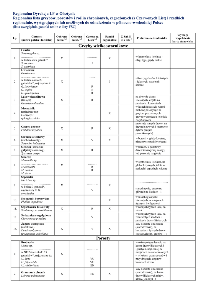 Regionalna Dyrekcja LP w Olsztynie Regionalna lista grzybów, porostów i roślin chronionych, zagrożonych (z Czerwonych List) i rzadkich regionalnie, występujących lub możliwych do odnalezienia w północno-wschodniej Polsce (lista uwzględnia gatunki roślin z listy FSC) Lp. Gatunek (nazwa polska i łacińska) Ochrona ścisła 1,2 Ochrona część. 1,2 Czerwona Lista 3,4 Rzadki regionalnie Z Zał. II i IV DS 5 Preferowane środowisko Grzyby wielkoowocnikowe 1. 2. 3. Czarka Sarcoscypha sp. ………………………….. w Polsce dwa gatunki* S. coccinea S. austriaca Gwiazdosz Geastrumsp. …………………………… w Polsce około 20 gatunków*, najczęstsze to G. fimbriatum G. triplex G. quadrifidum Lakownica żółtawa (lśniąca) Ganodermalucidum 4. Maczużnik nasięźrzałowy Cordyceps ophioglossoides 5. Ozorek dębowy Fistulina hepatica 6. 7. 8. 9. Sarniak świerkowy (dachówkowaty) Sarcodon imbricatus Siedzuń (szmaciak) gałęzisty (sosnowy) Sparassis crispa Smardz Morchella sp. ………………………….. M.esculenta M. conica M. elata Soplówka Hericium sp. …………………………. w Polsce 3 gatunki*, najczęstszy to H. coralloides X ……….. X wilgotne lasy liściaste olsy, łęgi, grądy niskie ? różne typy lasów liściastych i iglastych, na ziemi i ściółce I …… X R E R X R X X R X X V X X R X ……… R R X Sromotnik bezwstydny Phallus impudicus 11. Szyszkowiec łuskowaty Strobilomyces strobilaceus ………... wilgotne lasy liściaste, na glebach żyznych, także w parkach i ogrodach, wiosną ……………………………. X starodrzewia, buczyny, głównie na kłodach - ! 12. Świecznica rozgałęziona Clavicorona pyxidata 13. Żagiew wielogłowa (okółkowa) Dendropolyporus (Polyporus) umbellatus 1. Brodaczka Usnea sp. ………………………….. w NE Polsce około 35 gatunków*, najczęstsze to: U. hirta U. filipendula U. subfloridana X Granicznik płucnik Lobaria pulmonaria X X X R X V X w borach - gleby kwaśne, piaszczyste,pod świerkami w borach, u podstawy drzew (zazwyczaj sosny), lub pozornie na glebie V 10. na drewnie drzew liściastych, często na pniakach i korzeniach w lasach iglastych, wśród mchów; pasożytuje na grzybni podziemnych grzybów z rodzaju jeleniak Elaphomyces przestoje starych drzew, na drewnie żywych i martwych dębów (często pomnikowych) V X w lasach iglastych i liściastych, w miejscach żyznych i wilgotnych w różnych typach lasu, na ziemi w różnych typach lasu, na zmurszałych kłodach i pniakach drzew liściastych lasy liściaste i mieszane (starodrzewia), na korzeniach żywych drzew liściastych (np. grabów) - ! Porosty 2. w różnego typu lasach, na korze drzew liściastych i iglastych, najliczniej w miejscach nasłonecznionych – w lukach drzewostanów i przy drogach, częstow koronach drzew ………... VU VU EN EN X lasy liściaste i mieszane (starodrzewia), na korze drzew liściastych (dęby, klony, jesiony) - ! Wymaga wypełnienia karty stanowiska 3. Nibypłucnik Cetrelia sp. ………………………….. w Polsce kilka gatunków* o podobnym statusie i ekologii X EN 4. Pałecznik zielony Calicium viride 5. Pawężnica łuseczkowata Peltigerapraetextata 6. Płucnica islandzka Cetraria islandica 7. Płucnica płotowa Cetraria sepincola X EN 8. Płucnica zielona Cetraria chlorophylla X VU X EN 9. 10. Przystrumycznik pustułkowy Hypotrachyna revoluta Włostka Bryoriasp. ………………………….. w NE Polsce około 12 gatunków*, najczęstszy to B. fuscescens X X lasy liściaste i mieszane (starodrzewia), na korze drzew liściastych - ! X VU X VU X w lasach liściastych i mieszanych (starodrzewia), na korze starych drzew liściastych (najczęściej dębów) - ! wilgotne lasy liściaste i mieszane (starodrzewia), na mchach u nasady pni drzew liściastych, rzadko na murszejącym drewnie suche bory sosnowe, na glebie w borach sosnowych, zwykle na cienkich gałązkach drzew, w luźnych drzewostanach lub przy drogach, także na drewnie w terenie otwartym (ogrodzenia pastwisk) bory sosnowe oraz drzewa rosnące przy drogach, miejsca eksponowane, najczęściej na brzozach wilgotne lasy liściaste (olsy, łęgi), zwykle rosnące wzdłuż cieków, na korze drzew liściastych (głównie olszy) - ! w różnego typu lasach, na korze drzew liściastych i iglastych, najliczniej w miejscach nasłonecznionych – w lukach drzewostanów i przy drogach, często w koronach drzew w lasach liściastych i mieszanych (starodrzewia), na korze (w spękaniach) starych drzew – głównie dębów - ! w borach sosnowych, na korze drzew (najczęściej brzóz) lub drewnie wilgotne lasy liściaste (grądy, łęgi, olsy), na korze drzew liściastych (dąb, jesion, olsza, grab), często w wyższych partiach drzew VU X X ………... X VU 11. Złociszek jaskrawy Chrysothrix candelaris X CR 12. Złotlinka jaskrawa Vulpicida pinastri X NT 13. Żółtlica chropowata Flavoparmelia caperata X EN X X Mchy 1. 2. 3. 4. 5. Bezlist okrywowy Buxbaumia viridis Bezlist zwyczajny Buxbaumia aphylla Haczykowiec błyszczący Hamatocaulis vernicosus = Sierpowiec błyszczący Drepanocladus vernicosus Prostoząbek wiciowaty Dicranum flagellare Widłoząb zielony Dicranum viride X X epiksyl X epiksyl X X torfowiska X X epifit/epiksyl X X epifit/epiksyl X X wilgotne lasy, olsy, łęgi, brzegi rzek X X wilgotne łąki, zarośla X X X X X Paprotniki 1. 2. 3. 4. Długosz królewski Osmunda regalis Nasięźrzał pospolity Ophioglossum vulgatum Paprotka zwyczajna Polypodium vulgare Pióropusznik strusi Matteucia struthiopteris X X 5. Podejźrzon Botrychium sp. X 6. Poryblin jeziorny Isoëtes lacustris X X VU X skarpy, strome zbocza, wykroty drzew łęgi, brzegi strumieni, żyzne grądy polany śródleśne, ubogie pastwiska, murawy bliźniczkowe oligotroficzne zbiorniki – jeziora lobeliowe X X X X 7. 8. 9. 10. 11. 12. 13. 14. Skrzyp olbrzymi Equisetum telmateia Skrzyp zimowy Equisetum hyemale Widlicz cyprysowy Diphasiastrum tristac