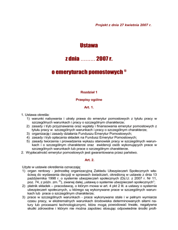 Projekt z dnia 27 kwietnia 2007 r. Ustawa z dnia ......... 2007 r. o emeryturach pomostowych 1) Rozdział 1 Przepisy ogólne Art. 1. 1. Ustawa określa: 1) warunki nabywania i utraty prawa do emerytur pomostowych z tytułu pracy w szczególnych warunkach i pracy o szczególnym charakterze; 2) zasady i tryb przyznawania oraz wypłaty i finansowania emerytur pomostowych z tytułu pracy w szczególnych warunkach i pracy o szczególnym charakterze; 3) organizację i zasady działania Funduszu Emerytur Pomostowych; 4) zasady i tryb opłacania składek na Fundusz Emerytur Pomostowych; 5) zasady tworzenia i prowadzenia wykazu stanowisk pracy w szczególnych warunkach i o szczególnym charakterze oraz ewidencji osób wykonujących prace w szczególnych warunkach lub prace o szczególnym charakterze. 2. Wypłacalność emerytur pomostowych jest gwarantowana przez państwo. Art. 2. UŜyte w ustawie określenia oznaczają: 1) organ rentowy - jednostkę organizacyjną Zakładu Ubezpieczeń Społecznych właściwą do wydawania decyzji w sprawach świadczeń, określoną w ustawie z dnia 13 października 1998 r. o systemie ubezpieczeń społecznych (Dz.U. z 2007 r. Nr 11, poz. 74, z późn. zm. 2)), zwanej dalej „ustawą o systemie ubezpieczeń społecznych”; 2) płatnik składek – pracodawcę, o którym mowa w art. 4 pkt 2 lit. a ustawy o systemie ubezpieczeń społecznych, u którego są wykonywane prace w szczególnych warunkach lub prace o szczególnym charakterze; 3) prace w szczególnych warunkach - prace wykonywane stale i w pełnym wymiarze czasu pracy, w ekstremalnych warunkach środowiska determinowanych siłami natury lub procesami technologicznymi, które mogą powodować trwałe, negatywne skutki zdrowotne i którym nie moŜna zapobiec stosując odpowiednie środki profi- 4) 5) 6) 7) 8) laktyki technicznej, organizacyjnej i medycznej; przez ekstremalne warunki środowiska pracy naleŜy rozumieć nagromadzenie takich czynników ryzyka, które występując łącznie, z duŜym prawdopodobieństwem mogą spowodować trwałe uszkodzenie zdrowia pracowników zatrudnionych w tych warunkach; prace o szczególnym charakterze - prace związane ze szczególną odpowiedzialnością oraz wymagające szczególnej sprawności psychofizycznej, których moŜliwość naleŜytego wykonywania w sposób nie zagraŜający bezpieczeństwu publicznemu, zdrowiu lub Ŝyciu własnemu lub innych osób obniŜa się przed osiągnięciem wieku emerytalnego na skutek pogorszenia sprawności psychofizycznej spowodowanego naturalnym procesem starzenia się; ubezpieczeni – osoby podlegające ubezpieczeniu społecznemu z tytułu pracy w szczególnych warunkach lub pracy o szczególnym charakterze, a takŜe osoby, które przed dniem wejścia w Ŝycie ustawy z tytułu takiej pracy podlegały ubezpieczeniu społecznemu lub zaopatrzeniu emerytalnemu, z wyłączeniem ubezpieczenia społecznego rolników; uprawniony – osobę mającą ustalone prawo do emerytury pomostowej; zainteresowany – osobę ubiegającą się o emeryturę pomostową, spełniającą warunki do nabycia prawa do tej emerytury; Zakład – Zakład Ubezpieczeń Społecznych. Art. 3. Ubezpieczonymi uprawnionymi do emerytury pomostowej są osoby, które spełniają łącznie następujące warunki: 1) urodziły się po dniu 31 grudnia 1948r., a przed dniem 1 stycznia 1969r.; 2) były pracownikami wykonującymi prace w szczególnych warunkach lub prace o szczególnym charakterze; 3) przed dniem 1 stycznia 1999r. wykonywały prace w szczególnych warunkach lub prace w szczególnym charakterze, w rozumieniu ustawy z dnia 17 grudnia 1998r. o emeryturach i rentach z Funduszu Ubezpieczeń Społecznych (Dz. U. z 2004r. Nr 39, poz. 353, z późn. zm.3) ), zwanej dalej „ustawą o emeryturach i rentach z FUS”; 4) nastąpiło rozwiązanie stosunku pracy. Art. 4. 1. Za pracowników, wykonujących prace w szczególnych warunkach, uwaŜa się pracowników, wykonujących od dnia 1 stycznia 2008r., stale i w pełnym wymiarze czasu pracy, prace, o których mowa w art. 2 pkt 3. 2. Za pracowników, wykonujących prace o szczególnym charakterze, uwaŜa się pracowników, wykonujących od dnia 1 stycznia 2008r., stale i w pełnym wymiarze czasu pracy, prace, o których mowa w art. 2 pkt 4. 3. Za pracowników, wykonujących prace w szczególnych warunkach lub prace o szczególnym charakterze, uwaŜa się równieŜ pracowników, wykonujących do dnia 31 grudnia 2007r., stale i w pełnym wymiarze czasu pracy, prace w szczególnych warunkach lub w szczególnym charakterze, w rozumieniu przepisów ustawy o emeryturach i rentach z FUS. 4. Rada Ministrów określi, w drodze rozporządzenia: 1) sposób potwierdzania przez zakład pracy okresów pracy w szczególnych warunkach i prac o szczególnym charakterze, 2 2) warunki wymagane do uzyskania emerytury pomostowej przez uprawnionych, o których mowa w art. 6 ust. 2, 3) wykazy rodzajów prac w szczególnych warunkach i prac o szczególnym charakterze - uwzględniając aktualne warunki środowiskowe, zmieniające się warunki pracy oraz wymogi ochrony bezpieczeństwa publicznego. Art. 5. 1. śołnierze zawodowi, funkcjonariusze Policji, Urzędu Ochrony Państwa, Agencji Bezpieczeństwa Wewnętrznego, Agencji Wywiadu, SłuŜby Kontrwywiadu Wojskowego, SłuŜby Wywiadu Wojskowego, Centralnego Biura Antykorupcyjnego, StraŜy Granicznej, Biura Ochrony Rządu, SłuŜby Więziennej i Państwowej StraŜy PoŜarnej nabywają prawo do emerytury pomostowej, jeŜeli nie spełniają warunków do nabycia prawa do emerytury określonej w przepisach o zaopatrzeniu emerytalnym tych osób. 2. Przy ustalaniu prawa do emerytury pomostowej osobom, o których mowa w ust. 1, okresy słuŜby pełnionej przez te osoby traktuje się na równi z okresami pracy w szczególnym charakterze w rozumieniu przepisów ustawy o emeryturach i rentach z FUS i pracy o szczególnym charakterze. Rozdział 2 Emerytura pomostowa Art. 6. 1. Emerytura pomostowa przysług