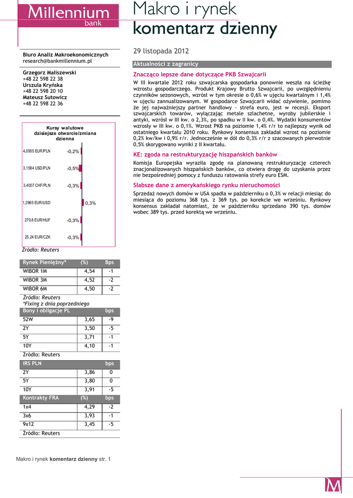29 listopada 2012 Biuro Analiz Makroekonomicznych [email protected] Aktualności z zagranicy Grzegorz Maliszewski +48 22 598 22 38 Urszula Kryńska +48 22 598 20 10 Mateusz Sutowicz +48 22 598 22 36 Znacząco lepsze dane dotyczące PKB Szwajcarii Kursy walutowe dzisiejsze otwarcie/zmiana 0,0 0,0 0,0 0,0 dzienna 0,0 W III kwartale 2012 roku szwajcarska gospodarka ponownie weszła na ścieżkę wzrostu gospodarczego. Produkt Krajowy Brutto Szwajcarii, po uwzględnieniu czynników sezonowych, wzrósł w tym okresie o 0,6% w ujęciu kwartalnym i 1,4% w ujęciu zannualizowanym. W gospodarce Szwajcarii widać ożywienie, pomimo że jej najważniejszy partner handlowy - strefa euro, jest w recesji. Eksport szwajcarskich towarów, wyłączając metale szlachetne, wyroby jubilerskie i antyki, wzrósł w III kw. o 2,3%, po spadku w II kw. o 0,4%. Wydatki konsumentów wzrosły w III kw. o 0,1%. Wzrost PKB na poziomie 1,4% r/r to najlepszy wynik od ostatniego kwartału 2010 roku. Rynkowy konsensus zakładał wzrost na poziomie 0,2% kw/kw i 0,9% r/r. Jednocześnie w dół do 0,3% r/r z szacowanych pierwotnie 0,5% skorygowano wyniki z II kwartału. 4,0955 EUR/PLN -0,2% 3,1584 USD/PLN -0,5% Komisja Europejska wyraziła zgodę na planowaną restrukturyzację czterech znacjonalizowanych hiszpańskich banków, co otwiera drogę do uzyskania przez nie bezpośredniej pomocy z funduszu ratowania strefy euro ESM. 3,4007 CHF/PLN -0,3% Słabsze dane z amerykańskiego rynku nieruchomości 1,2965 EUR/USD KE: zgoda na restrukturyzację hiszpańskich banków Sprzedaż nowych domów w USA spadła w październiku o 0,3% w relacji miesiąc do miesiąca do poziomu 368 tys. z 369 tys. po korekcie we wrześniu. Rynkowy konsensus zakładał natomiast, że w październiku sprzedano 390 tys. domów wobec 389 tys. przed korektą we wrześniu. 0,3% 279,8 EUR/HUF -0,3% 25,24 EUR/CZK -0,3% Źródło: Reuters Rynek Pieniężny* (%) Bps WIBOR 1M 4,54 -1 WIBOR 3M 4,52 -2 WIBOR 6M 4,50 -2 Źródło: Reuters *Fixing z dnia poprzedniego Bony i obligacje PL bps 52W 3,65 -9 2Y 3,50 -5 5Y 3,71 -1 10Y 4,10 -1 Źródło: Reuters IRS PLN bps 2Y 3,86 0 5Y 3,80 0 10Y Kontrakty FRA 3,91 (%) -5 bps 1x4 4,29 -2 3x6 3,93 -1 9x12 3,45 -5 Źródło: Reuters Makro i rynek komentarz dzienny str. 1 Kursy USD/PLN i EUR/PLN /bid z zamknięcia/ 3,30 Notowania złotego 4,19 4,17 3,25 4,15 4,13 3,20 4,11 4,09 3,15 4,07 3,10 4,05 USDPLN /lewa skala/ EURPLN 0 5 4,8 -20 4,6 4,4 -40 4,25 4,2 4,25 -60 4 4 -80 3,8 3,75 3,75 3,6 3,5 -100 3,5 3,5 3,4 3,25 3,2 3,25 -120 3 1X4 2X5 3X6 4X7 5X8 6X9 2012-11-29 7X10 8X11 9X12 12X15 Implikowana stopa referencyjna Obligacje krajowe rentowności i ich zmiana dzienna 4,2 4,1 4,0 3,9 3,8 3,7 3,6 3,5 3,4 3,3 3,2 -5 -1 0 -0,5 -1 -1,5 -2 -2,5 -3 -3,5 -4 -4,5 -5 -1 4,10 3,71 3,50 2Y 5Y 10Y zmiana dzienna w bp (prawa oś) Złoty w relacji do euro w dalszym ciągu stabilizuje się wokół 5-tygodniowego maksimum swojej wartości oczekując na nowe impulsy mogące wpłynąć na nadanie kierunku notowań. Na gruncie analizy technicznej kurs EUR/PLN podtrzymywany jest od dołu przez linię średnioterminowego trendu wzrostowego rozpoczętego w sierpniu przebiegającą obecnie wokół poziomu 4,09. W naszej ocenie dzisiejsza sesja powinna zakończyć się lekkim umocnieniem polskiej waluty odzwierciedlającym poprawę sentymentu na szerokim forexie, po tym jak w Stanach Zjednoczonych polityczni przywódcy mają debatować nad problemem rozwiązania klifu fiskalnego. Kluczowe dla nastrojów Zagranica - kurs EUR/USD Pomimo wczorajszych przejściowych spadków kurs EUR/USD ostatecznie utrzymał się powyżej poziomu 1,29. Początkowo dolara wspierała taktyka nastawiona na unikanie ryzyka po tym jak na pierwszy plan, przy ubogim kalendarium danych makro, powrócił problem klifu fiskalnego w Stanach Zjednoczonych. Dziś ten temat nadal dominuje jednak wczorajsze wypowiedzi amerykańskich polityków, z prezydentem B.Obamą na czele, Nasze oczekiwania na dzisiaj Kurs Wsparcie/Opór EUR/PLN 4,0800/4,1273 USD/PLN CHF/PLN EUR/USD 3,1484/3,2264 3,4023/3,4317 1,2786/1,3002 2012-11-29 Spready obligacji PLN vs. EUR 410 370 330 zwiększyły szanse na porozumienie i przyczyniły się do poprawy nastrojów na międzynarodowym rynku. Kluczowe dla podtrzymania pozytywnego sentymentu będą dzisiejsze dane o PKB za III kwartał w USA. Lepsze od oczekiwań dane ze szwajcarskiej gospodarki pozostały bez wpływu na notowania franka. Ewentualna skala aprecjacji i tak byłaby ograniczona bliskością poziomu 1,20. Uzasadnienie Oczekiwanie na publikacje danych makro o PKB za Q3, wypowiedzi członków RPP, stabilizacja wokół 2-tygodniowego minimum, pozytywny sentyment międzynarodowego rynku kształtowany informacjami w sprawie klifu fiskalnego, Zmiany w notowaniach EURUSD, Zmiany w notowaniach EURCHF, Sentyment międzynarodowego rynku kształtowany informacjami w sprawie klifu fiskalnego w USA, publikacja danych o PKB w USA. Obligacje – Rynek krajowy 290 250 6 lis 9 lis 15 lis 20 lis 2Y 26 lis 5Y 29 lis 10Y Bundy i Treasuries rentowności i ich zmiana dzienna 5 0 3,5 0 0 0 3,0 -2 -4 -4 -5 2,5 2,0 1,63 -10 -15 1,5 0,65 1,0 1,38 0,27 0,5 0,0 pozostaną dane dotyczące tempa PKB w USA, które w stosunku do wstępnego odczytu mogą zostać zrewidowane w górę przyczyniając się do kontynuacji wzrostu apetytu na ryzyko. Oczekujemy, że kurs EUR/PLN poruszać się będzie dziś w przedziale 4,0850 – 4,1150. Większa zmienność obserwowana będzie jutro po publikacji krajowych danych o PKB za trzeci kwartał. danych dotyczących tempa wzrostu gospodarczego w trzecim kwartale. Piątkowe dane mogą bowiem zweryfikować nastawienie inwestorów zagranicznych do polskich aktywów oraz zadecydować o oczekiwaniach, co do głębokości obniżki stóp procentowych na posiedzeniach RPP w kolejnych miesiącach. 0,00 -20 -25 0,40 -30 -0,5 -35 2Y 5Y 10Y Zmiana rentowności bundów (bp) Zmiana rentowności treasury (bp) Bundy Treasury Makro i rynek komentarz dzienny 