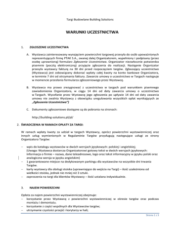 Targi Budowlane Building Solutions WARUNKI UCZESTNICTWA 1. ZGŁOSZENIE UCZESTNICTWA A. Wystawca zainteresowany wynajęciem powierzchni targowej przesyła do osób upoważnionych reprezentujących firmę PTAK S.A., zwanej dalej Organizatorem, wypełniony i podpisany (przez osobę uprawnioną) formularz Zgłoszenie Uczestnictwa. Organizator niezwłocznie potwierdza pisemnie (pocztą elektroniczną) przyjęcie zgłoszenia do realizacji. Następnie Organizator przesyła wystawcy fakturę na 30 dni przed rozpoczęciem targów. Zgłaszający uczestnictwo (Wystawca) jest zobowiązany dokonad wpłaty całej kwoty na konto bankowe Organizatora, w terminie 7 dni od otrzymania faktury. Zawarcie umowy o uczestnictwo w Targach następuje w momencie przesłania formularza zgłoszeniowego przez Wystawcę. B. Wystawca ma prawo zrezygnowad z uczestnictwa w targach pod warunkiem pisemnego zawiadomienia Organizatora, w ciągu 14 dni od daty zawarcia umowy o uczestnictwo w Targach. Wycofanie przez Wystawcę jego zgłoszenia po upływie 14 dni od daty zawarcia umowy nie zwalnia Wystawcy z obowiązku uregulowania wszystkich opłat wynikających ze „Zgłoszenia Uczestnictwa”) C. Dokumenty zgłoszeniowe dostępne są do pobrania na stronach: http://building-solutions.pl/pl/ 2. ŚWIADCZENIA W RAMACH OPŁATY ZA TARGI: W ramach wpłaty kwoty za udział w targach Wystawcy, oprócz powierzchni wystawienniczej oraz innych usług wymienionych w Regulaminie Targów przysługują następujące usługi ze strony Organizatora Targów: 3. wpis do katalogu wystawców w dwóch wersjach językowych: polskiej i angielskiej; (Uwaga: Wystawca dostarcza Organizatorowi gotowy tekst w dwóch wersjach językowych: Informacja o firmie – nazwa, dane teleadresowe, logo oraz tekst informacyjny w języku polski oraz analogiczna wersja w języku angielskim) 1 gwarantowane miejsce na dedykowanym parkingu dla wystawców na wszystkie dni trwania Targów. karty wystawcy dla obsługi stoiska (uprawniające do wejścia na Targi) – ilośd uzależniona od wielkości stoiska, jednak nie mniej niż 3 sztuki. zaproszenia na targi dla klientów Wystawcy – ilośd ustalana indywidualnie. NAJEM POWIERZCHNI Opłata za najem powierzchni wystawienniczej obejmuje: korzystanie przez Wystawcę z powierzchni wystawienniczej w okresie targów oraz podczas montażu i demontażu. korzystanie z części wspólnych dla Wystawców targów; utrzymanie czystości przejśd i korytarzy w hali; Strona 1 z 3 zabezpieczenie hali przez służby ochrony oraz zabezpieczenie p/poż.; reklamę i promocję Targów; bezpłatny dostęp do energii elektrycznej do 2kW (nie dotyczy powierzchni niezabudowanej). 4. CENNIK POWIERZCHNI WYSTAWIENNICZEJ I STOISK: Powierzchnia zabudowana - stoisko OCTANORM 150 PLN/ metr kwadratowy W skład tej powierzchni wchodzą: powierzchnia wystawiennicza min. 18 m2 [6 m x3 m] • białe ściany zabudowy w systemie OCTANORM • punkty świetlne 3 szt. • gniazdo elektryczne do 2 kw • nazwa firmy i logo na fryzie • 1 stolik+2 krzesła • Kosz na śmieci Powierzchnia zabudowana – stoisko ULTRA W skład tej powierzchni wchodzą: • • • • • • • • powierzchnia wystawiennicza min. 50 m2 wykładzina targowa lux 50 m2 zabudowa (system pw-5) sufit podwieszany + oświetlenie jedno podwójne gniazdo elektryczne do 2 KW lampy rastowe 2 stoliki+6 krzeseł Kosz na śmieci Powierzchnia wewnętrzna niezabudowana, do samodzielnej zabudowy W skład tej powierzchni wchodzą: Gniazdo elektryczne do 2 KW 1 stolik+2 krzesła Kosz na śmieci 200 PLN/metr kwadratowy 100 PLN/metr kwadratowy Cennik zawiera kwoty netto do których należy doliczyd 23 % VAT 5. USŁUGI DODATKOWE A. Usługi dodatkowe obejmują: elektrykę, przyłącza wodno-kanalizacyjne, sprężone powietrze, teleinformatykę (Internet bezprzewodowy), sprzątanie, personel pomocniczy wyposażenie stoisk oraz usługi marketingowo-reklamowe. B. Zgłoszenie zapotrzebowania na wszelkie usługi dodatkowe, musi byd przekazane organizatorowi najpóźniej 21 dni przed rozpoczęciem targów. Zgłoszenia nadsyłane po terminie będą rozpatrywane indywidualnie. C. Szczegóły dotyczące usług dodatkowych obejmujące m.in. cenniki oraz sposoby realizacji znajdują się w osobnych formularzach zamówieo usług dodatkowych. 6. WARUNKI PŁATNOŚCI A. Zamawiając powierzchnie wystawienniczą, Wystawca dokonuje płatności całej kwoty w wynikającej ze Zgłoszenia, na podstawie faktury wystawionej 30 dni przed rozpoczęciem Strona 2 z 3 targów, w terminie do 7 dni od daty otrzymania faktury. Pozostała kwota, obejmująca dodatkowe usługi zamówione przez Wystawcę, musi byd wpłacona w terminie do 7 dni od otrzymania faktury VAT wystawionej przez Organizatora. B. W razie zwłoki Wystawcy z zapłatą którejkolwiek części wynagrodzenia Organizatorowi przysługiwad będą dodatkowo odsetki za zwłokę w wysokości wynikającej z art. 359 § 2[1] Kodeksu cywilnego (odsetki ustawowe). C. Brak wpłaty całości należności za udział w targach upoważnia Organizatora do odmówienia Wystawcy udziału w Targach i pozbawia Wystawcę prawa do dochodzenia roszczeo z tego tytułu. D. W przypadku braku wpłaty w terminie określonym przez Organizatora, Wystawca wyraża zgodę na poddanie się egzekucji komorniczej na podstawie wydanego nakazu zapłaty (prawomocnego), do którego nie będzie wnosid sprzeciwu lub zarzutów. 7. DANE KONTAKTOWE Wszystkie zapytania, „Zgłoszenie Uczestnictwa” oraz niezbędne załączniki prosimy przesyład na adres e-mail: Marcin Chojnowski, Dyrektor Targów [email protected] Jakub Gosk, Project Manager Building Solutions,[email protected] lub na adres: PTAK WARSAW EXPO Al. Katowicka 62, 05-830, Nadarzyn z dopiskiem Building Solutions Strona 3 z 3