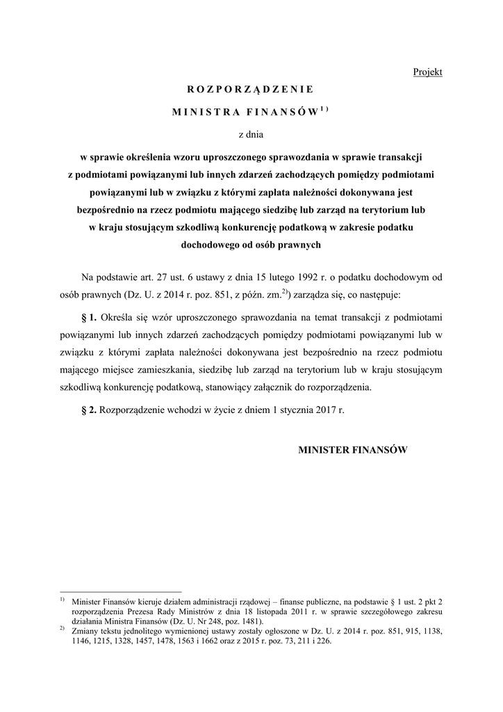 Projekt ROZPORZĄDZENIE MINISTRA FINANSÓW1) z dnia w sprawie określenia wzoru uproszczonego sprawozdania w sprawie transakcji z podmiotami powiązanymi lub innych zdarzeń zachodzących pomiędzy podmiotami powiązanymi lub w związku z którymi zapłata należności dokonywana jest bezpośrednio na rzecz podmiotu mającego siedzibę lub zarząd na terytorium lub w kraju stosującym szkodliwą konkurencję podatkową w zakresie podatku dochodowego od osób prawnych Na podstawie art. 27 ust. 6 ustawy z dnia 15 lutego 1992 r. o podatku dochodowym od osób prawnych (Dz. U. z 2014 r. poz. 851, z późn. zm.2)) zarządza się, co następuje: § 1. Określa się wzór uproszczonego sprawozdania na temat transakcji z podmiotami powiązanymi lub innych zdarzeń zachodzących pomiędzy podmiotami powiązanymi lub w związku z którymi zapłata należności dokonywana jest bezpośrednio na rzecz podmiotu mającego miejsce zamieszkania, siedzibę lub zarząd na terytorium lub w kraju stosującym szkodliwą konkurencję podatkową, stanowiący załącznik do rozporządzenia. § 2. Rozporządzenie wchodzi w życie z dniem 1 stycznia 2017 r. MINISTER FINANSÓW 1) 2) Minister Finansów kieruje działem administracji rządowej – finanse publiczne, na podstawie § 1 ust. 2 pkt 2 rozporządzenia Prezesa Rady Ministrów z dnia 18 listopada 2011 r. w sprawie szczegółowego zakresu działania Ministra Finansów (Dz. U. Nr 248, poz. 1481). Zmiany tekstu jednolitego wymienionej ustawy zostały ogłoszone w Dz. U. z 2014 r. poz. 851, 915, 1138, 1146, 1215, 1328, 1457, 1478, 1563 i 1662 oraz z 2015 r. poz. 73, 211 i 226. –2– Załączniki do rozporządzenia Ministra Finansów z dnia … (poz. …) ZAŁĄCZNIK NR 1 CIT-TP SPRAWOZDANIE W SPRAWIE TRANSAKCJI Z PODMIOTAMI POWIĄZANYMI LUB INNYCH ZDARZEŃ ZACHODZĄCYCH POMIĘDZY PODMIOTAMI POWIĄZANYMI LUB W ZWIĄZKU Z KTÓRYMI ZAPŁATA NALEŻNOŚCI DOKONYWNA JEST BEZPOŚREDNIO LUB POŚREDNIO NA RZECZ PODMIOTU MAJĄCEGO SIEDZIBĘ LUB ZARZĄD NA TERYTORIUM LUB W KRAJU STOSUJĄCYM SZKODLIWĄ KONKURENCJĘ PODATKOWĄ W ZAKRESIE PODATKU DOCHODOWEGO OD OSÓB PRAWNYCH Wzór 24/07/EP Załącznik do rozporządzenia Ministra Finansów z dnia …(poz. …) POLTAX POLA JASNE WYPEŁNIA PODATNIK, POLA CIEMNE WYPEŁNIA URZĄD SKARBOWY. WYPEŁNIĆ NA MASZYNIE, KOMPUTEROWO LUB RĘCZNIE, DUŻYMI, DRUKOWANYMI LITERAMI, CZARNYM LUB NIEBIESKIM KOLOREM. Składanie w wersji elektronicznej: www.portalpodatkowy.mf.gov.pl 1. Identyfikator podatkowy NIP podatnika 2. Nr dokumentu 3. Status CIT-TP SPRAWOZDANIE W SPRAWIE TRANSAKCJI Z PODMIOTAMI POWIĄZANYMI LUB INNYCH ZDARZEŃ ZACHODZĄCYCH POMIEDZY PODMIOTAMI POWIĄZANYMI LUB W ZWIĄZKU Z KTÓRYMI ZAPŁATA NALEŻNOŚCI DOKONYWANA JEST BEZPOŚREDNIO LUB POŚREDNIO NA RZECZ PODMIOTU MAJACEGO SIEDZIBĘ LUB ZARZĄD NA TERYROTIUM LUB W KRAJU STOSUJĄCYCM SZKODLIWĄ KONKURENCJĘPODATKOWĄ. Podstawa prawna: Składający: Termin składania: Miejsce składania Art. 27 ust. 6 ustawy z dnia 15 lutego 1992 r. o podatku dochodowym od osób prawnych (Dz. U. z 2014 r. poz. 851, z późn. zm.1) zwanej dalej ”ustawą”. Podatnicy, o których mowa w art. 27 ust. 5 ustawy. Do końca 3 miesiąca następującego po roku (art. 27 ust. 5 ustawy). Urząd skarbowy2. A. MIEJSCE I CEL SKŁADANIA INFORMACJI 4. Urząd, do którego adresowana jest informacja 5. Cel złożenia formularza (zaznaczyć właściwy kwadrat): 1. złożenie 2. zmiana B. DANE IDENTYFIKACYJNE I AKTUALNY ADRES ZAMIESZKANIA PODATNIKA 6.Nazwa pełna 7.Regon 8. Kraj 11. Gmina 9. Województwo 10. Powiat 12. Ulica 15. Miejscowość 13. Nr domu 16. Kod pocztowy 14. Nr lokalu 17. Poczta C. IDENTYFIKACJA POWIĄZAŃ 18. Czy podatnik posiada bezpośredni lub pośredni udział w kapitale innego podmiotu nie mniejszy niż 25%?j (zaznaczyć właściwy kwadrat): 1. Tak 2. Nie 19. Czy podatnik posiada bezpośredniego lub pośredniego udziałowca, którego udział w kapitale podatnika jest nie mniejszy niż 25% (zaznaczyć właściwy kwadrat): 1. Tak 2. Nie 20. Czy podatnik posiada bezpośredni lub pośredni udział w kapitale innego podmiotu nie mniejszy niż 90%? (zaznaczyć właściwy kwadrat): 1. Tak 2. Nie 21. Czy podatnik posiada bezpośredniego lub pośredniego udziałowca, którego udział w kapitale podatnika jest nie mniejszy niż 90%? (zaznaczyć właściwy kwadrat): 1. Tak 2. Nie 22. Czy podatnik bierze udział bezpośrednio lub pośrednio w zarządzaniu lub kontroli podmiotem krajowym lub przedsiębiorstwem położonym za granicą? (zaznaczyć właściwy kwadrat): 1. Tak 2. Nie 23. Czy podatnik posiada zagraniczny zakład? (zaznaczyć właściwy kwadrat): 1. Tak 2. Nie 24. Czy podmiot składający sprawozdanie jest zakładem zagranicznego podmiotu? (zaznaczyć właściwy kwadrat): 1. Tak 2. Nie D. INFORMACJE NA TEMAT ZAGRANICZNEGO PODMIOTU POWIĄZANEGO Liczba Liczba podmiotów powiązanych ,z którymi podatnik dokonuje transakcji mających siedzibę w 25. A. Polsce 26. B. państwie należącym do Europejskiego Obszaru Gospodarczego innym niż Polska, w tym: 1 Zmiany tekstu jednolitego wymienionej ustawy zostały ogłoszone w Dz.U. z 2014 r. poz. 851, 915, 1138, 1146, 1215, 1328, 1457, 1478, 1563 i 1662 oraz z 2015 r. poz. 73, 211 i 226. 2 Urząd skarbowy o którym mowa w ustawie. CIT-TP (1) 1/5 POLA JASNE WYPEŁNIA PODATNIK, POLA CIEMNE WYPEŁNIA URZĄD SKARBOWY. WYPEŁNIĆ NA MASZYNIE, KOMPUTEROWO LUB RĘCZNIE, DUŻYMI, DRUKOWANYMI LITERAMI, CZARNYM LUB NIEBIESKIM KOLOREM. Składanie w wersji elektronicznej: www.portalpodatkowy.mf.gov.pl POLTAX 27. C. państwie nienależącym do Europejskiego Obszaru Gospodarczego, z którym Polska ma możliwość wymiany informacji podatkowych D. państwie nienależącym do Europejskiego Obszaru Gospodarczego, z którym Polska nie ma możliwości wymiany informacji podatkowych 28. Dla grupy B. kody krajów ISO 3166 29. 30. 31. 32. 33. 34. 35. 36. 37. 38. 39. 40. 41. 42. 43. 44. Dla grupy C. kody krajów ISO 3166 45. 46 47. 48. 49. 50. 52. 53. 54. 55. 56. 57. 5