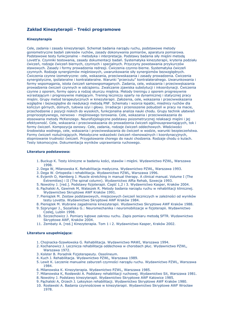 Zakład Kinezyterapii - Treści programowe Kinezyterapia Cele, zadania i zasady kinezyterapii. Schemat badania narządu ruchu, podstawowe metody goniometryczne badań zakresów ruchów, zasady dokonywania pomiarów, aparatura pomiarowa. Podstawowe testy funkcjonalne - metodyka i interpretacja. Podstawy badania siły mięśni metodą Lovett'a. Czynniki testowania, zasady dokumentacji badań. Systematyka kinezyterapii, kryteria podziału ćwiczeń, rodzaje ćwiczeń biernych, czynnych i specjalnych. Przyczyny powstawania przykurczów stawowych. Zasady i formy prowadzenia redresji. Ćwiczenia czynno-bierne. Systematyka ćwiczeń czynnych. Rodzaje synergizmów mięśniowych, uwarunkowanie siły synergizmów bezwzględnych. Ćwiczenia czynne izometryczne: cele, wskazania, przeciwwskazania i zasady prowadzenia. Ćwiczenia synergistyczne, ipsilateralne i kontralateralne. Warunki "przerzutu" kontralateralnego. Uwarunkowania i formy wspomagania, istota ćwiczeń samowspomaganych. Zadania, cele, wskazania i przeciwwskazania prowadzenia ćwiczeń czynnych w odciążeniu. Zwalczanie zjawiska substytucji i inkoordynacji. Ćwiczenia czynne z oporem, formy oporu a rodzaj skurczu mięśnia. Metody treningu z oporem progresywnie wzrastającym i progresywnie malejącym. Trening leczniczy oparty na dynamicznej i statycznej pracy mięśni. Grupy metod terapeutycznych w kinezyterapii. Założenia, cele, wskazania i przeciwwskazania względne i bezwzględne do reedukacji metodą PNF. Schematy i wzorce łopatki, miednicy ruchów dla kończyn górnych, dolnych, tułowia szyi i głowy. Irradiacje i przenoszenie pobudzeń w pracy na macie, przechodzenie z pozycji niskich do wysokich, funkcjonalna analiza nauki chodu. Grupy technik ułatwień proprioceptywnego, nerwowo - mięśniowego torowania. Cele, wskazania i przeciwwskazania do stosowania metody McKenziego. Neurofizjologiczne podstawy poizometrycznej relaksacji mięśni i jej efektywność. Cele, wskazania i przeciwwskazania do prowadzenia ćwiczeń ogólnousprawniających, tok i formy ćwiczeń. Kompozycja osnowy. Cele, zadania, rodzaje ćwiczeń oddechowych. Właściwości środowiska wodnego, cele, wskazania i przeciwwskazania do ćwiczeń w wodzie, warunki bezpieczeństwa. Formy ćwiczeń rozluźniających. Metodyczne wskazówki ćwiczeń równoważnych i koordynacyjnych, stopniowanie trudności ćwiczeń. Przygotowanie chorego do nauki chodzenia. Rodzaje chodu o kulach. Testy lokomocyjne. Dokumentacja wyników usprawniania ruchowego. Literatura podstawowa: 1. Buckup K. Testy kliniczne w badaniu kości, stawów i mięśni. Wydawnictwo PZWL, Warszawa 1998. 2. Dega W, Milanowska K. Rehabilitacja medyczna. Wydawnictwo PZWL, Warszawa 1993. 3. Dega W. Ortopedia i rehabilitacja. Wydawnictwo PZWL, Warszawa 1996. 4. Evjenth O, Hamberg J. Muscle stretching in manual therapy. A clinical manual. Volume I (The Extremities) i II (The spinal column). Wydawnictwo Alfta Rehab, Szwecja 1993. 5. Nowotny J. [red.]. Podstawy fizjoterapii. Część 1,2 i 3. Wydawnictwo Kasper, Kraków 2004. 6. Pąchalski A, Gawinek M, Walaszek R. Metody badania narządu ruchu w rehabilitacji klinicznej. Wydawnictwo Skryptowe AWF Kraków 1991. 7. Pieniążek M. Zestaw podstawowych, miejscowych ćwiczeń leczniczych w zależności od wyników testu Lovetta. Wydawnictwo Skryptowe AWF Kraków 1984. 8. Pieniążek M. Wybrane zagadnienia kinezyterapii. Wydawnictwo Skryptowe AWF Kraków 1988. 9. Szprynger J., Sozańska G.: Neuromechanika i neuromobilizacje w fizjoterapii. Wydawnictwo Czelej, Lublin 1998. 10. Szczechowicz J. Pomiary kątowe zakresu ruchu. Zapis pomiaru metodą SFTR. Wydawnictwo Skryptowe AWF, Kraków 2004. 11. Zembaty A. [red.] Kinezyterapia. Tom 1 i 2. Wydawnictwo Kasper, Kraków 2002. Literatura uzupełniająca: 1. Chojnacka-Szawłowska G. Rehabilitacja. Wydawnictwo MAWI, Warszawa 1994. 2. Kochanowicz J. Lecznicza rehabilitacja oddechowa w chorobach płuc. Wydawnictwo PZWL, Warszawa 1972. 3. Kolster B. Poradnik Fizjoterapeuty. Ossolineum. 4. Kuch J. Rehabilitacja. Wydawnictwo PZWL, Warszawa 1989. 5. Lewit K. Leczenie manualne zaburzeń czynności narządu ruchu. Wydawnictwo PZWL, Warszawa 1984. 6. Milanowska K. Kinezyterapia. Wydawnictwo PZWL, Warszawa 1985. 7. Milanowska K, Rosławski A. Podstawy rehabilitacji ruchowej. Wydawnictwo Sit, Warszawa 1981. 8. Nowotny J. Podstawy kinezyterapii. Wydawnictwo Skryptowe AWF Katowice 1985. 9. Pąchalski A, Orzech J. Leksykon rehabilitacji. Wydawnictwo Skryptowe AWF Kraków 1980. 10. Rosławski A. Badania czynnościowe w kinezyterapii. Wydawnictwo Skryptowe AWF Wrocław 1978. 11. Rosławski A, Skolimowski T. Kinezyterapia ogólna. Badanie narządu ruchu. Część I. Wydawnictwo Skryptowe AWF Wrocław 1974. 12. Rosławski A, Skolimowski T. Ćwiczenia lecznicze. Wydawnictwo Skryptowe AWF Wrocław 1985. 13. Rosławski A, Skolimowski T. Technika wykonywania ćwiczeń leczniczych. Wydawnictwo PZWL, Warszawa 1997. 14. Rosławski A, Woźniewski M. Kinezyterapia oddechowa. Wydawnictwo Skryptowe AWF Wrocław 1988 15. Rosławski A. [red.]. Podstawy rehabilitacji ruchowej. Tom I i II. Wydawnictwo Sport i Turystyka, Warszawa 1981. 16. Walicki K. Trening leczniczy. Wydawnictwo Skryptowe AWF Warszawa 1975. 17. Weiss M. Podstawowe zagadnienia rehabilitacji schorzeń narządu ruchu. Wydawnictwo Skryptowe AWF Warszawa 1969. 18. Zembaty A. Fizjoterapia. Wydawnictwo PZWL, Warszawa 1987. 19. Zembaty A. Pomiary zakresów ruchów w stawach człowieka. Wydawnictwo Skryptowe AWF Warszawa 1989. Techniki diagnozy i terapii manualnej. Historia rozwoju terapii manualnej. Organizacje terapii manualnej na świecie i w Polsce. Pojęcia podstawowe: terapia /medycyna/ manualna, mobilizacje stawowe /wolne i szybkie/, odwracalne dysfunkcje narządu ruchu. Podstawy terapii manualnej-wprowadzenie do diagnostyki narządu ruchu. Przedstawienie i omówienie koncepcji leczenia i usprawniania pacjentów metodą Kaltenborna. Podstawowe założenia koncepcji Briana Mulligana, Lewita, C