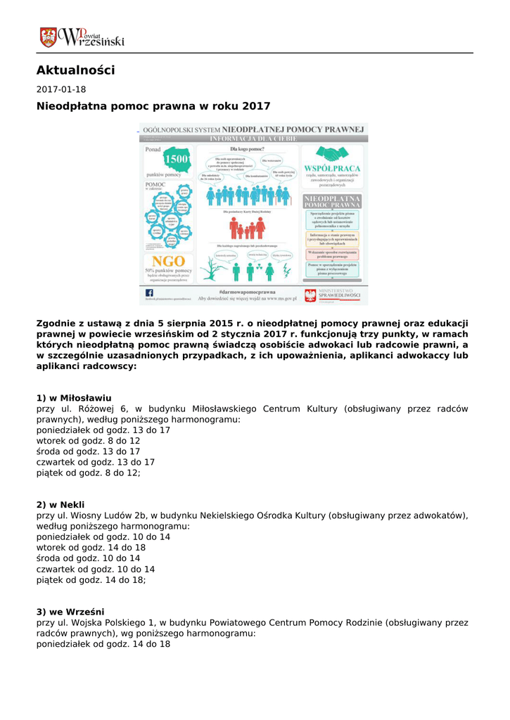 Aktualności 2017-01-18 Nieodpłatna pomoc prawna w roku 2017 Zgodnie z ustawą z dnia 5 sierpnia 2015 r. o nieodpłatnej pomocy prawnej oraz edukacji prawnej w powiecie wrzesińskim od 2 stycznia 2017 r. funkcjonują trzy punkty, w ramach których nieodpłatną pomoc prawną świadczą osobiście adwokaci lub radcowie prawni, a w szczególnie uzasadnionych przypadkach, z ich upoważnienia, aplikanci adwokaccy lub aplikanci radcowscy: 1) w Miłosławiu przy ul. Różowej 6, w budynku Miłosławskiego Centrum Kultury (obsługiwany przez radców prawnych), według poniższego harmonogramu: poniedziałek od godz. 13 do 17 wtorek od godz. 8 do 12 środa od godz. 13 do 17 czwartek od godz. 13 do 17 piątek od godz. 8 do 12; 2) w Nekli przy ul. Wiosny Ludów 2b, w budynku Nekielskiego Ośrodka Kultury (obsługiwany przez adwokatów), według poniższego harmonogramu: poniedziałek od godz. 10 do 14 wtorek od godz. 14 do 18 środa od godz. 10 do 14 czwartek od godz. 10 do 14 piątek od godz. 14 do 18; 3) we Wrześni przy ul. Wojska Polskiego 1, w budynku Powiatowego Centrum Pomocy Rodzinie (obsługiwany przez radców prawnych), wg poniższego harmonogramu: poniedziałek od godz. 14 do 18 wtorek od godz. 14 do 18 środa od godz. 14 do 18 czwartek od godz. 14 do 18 piątek od godz. 14 do 18. UWAGA! Punkty znajdujące się na terenie powiatu wrzesińskiego będą nieczynne w następujących terminach (dni ustawowo wolne od pracy): - 6 stycznia 2017 r. (piątek), - 17 kwietnia 2017 r. (poniedziałek), - 1 maja 2017 r. (poniedziałek), 3 maja 2017 r. (środa), - 15 czerwca 2017 r. (czwartek), - 15 sierpnia 2017 r. (wtorek), - 1 listopada 2017 r. (środa), - 25 grudnia 2017 r. (poniedziałek), 26 grudnia 2017 r. (wtorek). Nieodpłatna pomoc prawna przysługuje: 1) osobie, której w okresie 12 miesięcy poprzedzających zwrócenie się o udzielenie nieodpłatnej pomocy prawnej zostało przyznane świadczenie z pomocy społecznej na podstawie ustawy z dnia 12 marca 2004 r. o pomocy społecznej (Dz. U. z 2015 r. poz. 163, z późn. zm.) i wobec której w tym okresie nie wydano decyzji o zwrocie nienależnie pobranego świadczenia – należy przedłożyć oryginał albo odpis decyzji o przyznaniu świadczenia z pomocy społecznej lub zaświadczenie o udzieleniu świadczenia, 2) osobie, która posiada ważną Kartę Dużej Rodziny, o której mowa w ustawie z dnia 5 grudnia 2014 r. o Karcie Dużej Rodziny (Dz. U. poz. 1863) – należy przedłożyć ważną Kartę Dużej Rodziny, 3) osobie, która uzyskała zaświadczenie, o którym mowa w ustawie z dnia 24 stycznia 1991 r. o kombatantach oraz niektórych osobach będących ofiarami represji wojennych i okresu powojennego (Dz. U. z 2014 r. poz. 1206 oraz z 2015 r. poz. 693) – należy przedłożyć zaświadczenie, 4) osobie, która posiada ważną legitymację weterana albo legitymację weterana poszkodowanego, o których mowa w ustawie z dnia 19 sierpnia 2011 r. o weteranach działań poza granicami państwa (Dz. U. nr 205, poz. 1203) – należy przedłożyć ważną legitymację weterana albo legitymację weterana poszkodowanego, 5) osobie, która nie ukończyła 26 lat – należy przedłożyć dokument stwierdzający tożsamość, 6) osobie, która ukończyła 65 lat – należy przedłożyć dokument stwierdzający tożsamość, 7) osobie, która w wyniku wystąpienia klęski żywiołowej, katastrofy naturalnej lub awarii technicznej znalazła się w sytuacji zagrożenia lub poniosła straty – należy złożyć oświadczenie, że zachodzi co najmniej jedna z okoliczności wymienionych w tym punkcie, 8) kobiecie, która jest w ciąży – należy przedłożyć dokument potwierdzający ciążę. Nieodpłatna pomoc prawna obejmuje: 1) poinformowanie osoby uprawnionej o obowiązującym stanie prawnym, o przysługujących jej uprawnieniach lub o spoczywających na niej obowiązkach, 2) wskazanie osobie uprawnionej sposobu rozwiązania jej problemu prawnego, 3) udzielenie pomocy w sporządzeniu projektu pisma w sprawach, o których mowa w pkt. 1 i 2, z wyłączeniem pism procesowych w toczącym się postępowaniu przygotowawczym lub sądowym i pism w toczącym się postępowaniu sądowo-administracyjnym, 4) sporządzenie projektu pisma o zwolnienie od kosztów sądowych lub ustanowienie pełnomocnika z urzędu w postępowaniu sądowym lub ustanowienie adwokata, radcy prawnego, doradcy podatkowego lub rzecznika patentowego w postępowaniu sądowo-administracyjnym. Nieodpłatna pomoc prawna nie obejmuje spraw: 1) podatkowych związanych z prowadzeniem działalności gospodarczej; 2) z zakresu prawa celnego, dewizowego i handlowego; 3) związanych z prowadzeniem działalności gospodarczej, z wyjątkiem przygotowania do rozpoczęcia tej działalności.