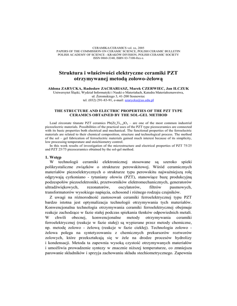 CERAMIKA/CERAMICS vol. xx, 2005 PAPERS OF THE COMMISSION ON CERAMIC SCIENCE, POLISH CERAMIC BULLETIN POLISH ACADEMY OF SCIENCE - KRAKÓW DIVISION, POLISH CERAMIC SOCIETY ISSN 0860-3340, ISBN 83-7108-0xx-x Struktura i właściwości elektryczne ceramiki PZT otrzymywanej metodą zolowo-żelową Aldona ZARYCKA, Radosław ZACHARIASZ, Marek CZERWIEC, Jan ILCZUK Uniwersytet Śląski, Wydział Informatyki i Nauki o Materiałach, Katedra Materiałoznawstwa, ul. Żeromskiego 3, 41-200 Sosnowiec tel. (032) 291-83-91, e-mail: [email protected] THE STRUCTURE AND ELECTRIC PROPERTIES OF THE PZT TYPE CERAMICS OBTAINED BY THE SOL-GEL METHOD Lead zirconate titanate PZT ceramics Pb(ZrxTi1-x)O3 – are one of the most common industrial piezoelectric materials. Possibilities of the practical uses of the PZT type piezoceramics are connected with its basic properties both electrical and mechanical. The functional properties of the ferroelectric materials are related to their chemical composition, structure and technological process. The method of the sol – gel fabrication of ferroelectric materials gained much interest because of its simplicity, low processing temperature and stoichiometry control. In this work results of investigation of the microstructure and electrical properties of PZT 75/25 and PZT 25/75 piezoceramics obtained by the sol-gel method. 1. Wstęp W technologii ceramiki elektronicznej stosowane są szeroko spieki polikrystaliczne związków o strukturze perowskitowej. Wśród ceramicznych materiałów piezoelektrycznych o strukturze typu perowskitu najważniejszą rolę odgrywają cyrkoniano - tytaniany ołowiu (PZT), stanowiące bazę produkcyjną podzespołów piezoelektroniki, przetworników elektromechanicznych, generatorów ultradźwiękowych, rezonatorów, oscylatorów, filtrów pasmowych, transformatorów wysokiego napięcia, echosond i różnego rodzaju czujników. Z uwagi na różnorodność zastosowań ceramiki ferroelektrycznej typu PZT bardzo istotna jest optymalizacja technologii otrzymywania tych materiałów. Konwencjonalna technologia otrzymywania ceramiki ferroelektrycznej obejmuje reakcje zachodzące w fazie stałej podczas spiekania tlenków odpowiednich metali. W chwili obecnej, konwencjonalne metody otrzymywania ceramiki ferroelektrycznej (reakcje w fazie stałej) są wypierane przez metody chemiczne, np. metodę zolowo - żelową (reakcje w fazie ciekłej). Technologia zolowo żelowa polega na syntetyzowaniu z chemicznych prekursorów roztworów zolowych, które przekształcają się w żele na drodze procesów hydrolizy i kondensacji. Metoda ta zapewnia wysoką czystość otrzymywanych materiałów i umożliwia prowadzenie syntezy w znacznie niższej temperaturze, co zmniejsza parowanie składników i sprzyja zachowaniu składu stechiometrycznego. Zapewnia również dużą gęstość materiałów po spiekaniu wynikającą z silnie rozwiniętej powierzchni [1-4]. Celem niniejszej pracy było zbadanie mikrostruktury oraz zależności przewodnictwa elektrycznego od temperatury dla wybranych składów PZT różniących się zawartością PbTiO3. 2. Eksperyment Materiałem badań była ceramika PZT z obszarów: ferroelektrycznej fazy romboedrycznej o zawartości Zr/Ti = 75/25 (PZT 75/25), oraz fazy tetragonalnej o zawartości Zr/Ti = 25/75 (PZT 25/75). Proces technologiczny wytworzenia ceramiki PZT obejmował dwa zasadnicze etapy: • otrzymanie amorficznych nanoproszków PZT w procesie zolowo - żelowym • zagęszczanie wyprasek ceramicznych PZT dwoma metodami: metodą prasowania na gorąco oraz spiekaniem swobodnym. Jako prekursorów amorficznych nanoproszków zastosowano wysokiej czystości organiczne sole metali: octan ołowiu – Pb(OAc)·3H2O, n - propanolan cyrkonu – Zr(O-nPr)4, n – propanolan tytanu – Ti(O-nPr)4 oraz n – propanol jako rozpuszczalnik i acetyloaceton jako stabilizator roztworu zolowego. Otrzymane w drodze procesów hydrolizy – kondensacji żele o strukturze nieorganiczno – organicznych kompleksów metali poddano obróbce termicznej w T = 823K, celem eliminacji części organicznej związków [5, 6]. Otrzymane proszki ceramiczne mielono przez 2h, a następnie sprasowano w wypraski i zagęszczano metodą spiekania swobodnego (Ts = 1523K/5h) oraz prasowania na gorąco (Ts = 1473K/2h, p = 2·106Pa). Próbki po spieczeniu szlifowano, polerowano i na ich powierzchnie nanoszono elektrody metodą wpalania pasty srebrnej. Dla otrzymanych próbek ceramicznych wykonano badania mikrostruktury oraz zbadano zależność przewodnictwa elektrycznego od temperatury. 3. Wyniki badań i ich omówienie Badania mikrostruktury dla otrzymanych próbek PZT przeprowadzono przy użyciu mikroskopu z zimną katodą HITACHI S-4700 i systemu EDS NORAN VANTAGE. Powyższe badania wykonano w Laboratorium Mikroskopii Skaningowej w Instytucie Nauk Geologicznych Uniwersytetu Jagiellońskiego. Otrzymane obrazy mikrostruktury dla poszczególnych składów oraz wyniki badań składu chemicznego przedstawiono na rysunkach 1-3. Zastosowanie metody zolowo – żelowej umożliwia otrzymywanie proszków ceramicznych o nanometrycznych rozmiarach ziaren. Ze względu na drobnoziarnistość otrzymanego materiału obserwujemy wytwarzanie się aglomeratów proszkowych dla obu składów ceramicznych – rysunek 1a. a) b) c) Rys. 1. Mikrostruktura materiału PZT: a) nanoproszków PZT 75/25 oraz PZT 25/75, b) przełomy dla materiałów PZT 75/25 oraz PZT 25/75 dla próbek zagęszczanych spiekaniem swobodnym, c) przełomy dla materiałów PZT 75/25 oraz PZT 25/75 dla próbek zagęszczanych w technologii prasowania na gorąco Obrazy przełomów dla składów otrzymanych podczas spiekania swobodnego wykazują istotne różnice; faza o mniejszej zawartości PbTiO3 w tych samych warunkach spiekania wykazuje obecność ziaren lepiej wykształconych (widoczne są 120º gran ice ziaren) – rysunek 1b. Dla składów otrzymanych w technologii prasowania na gorąco obserwujemy widoczną różnicę w