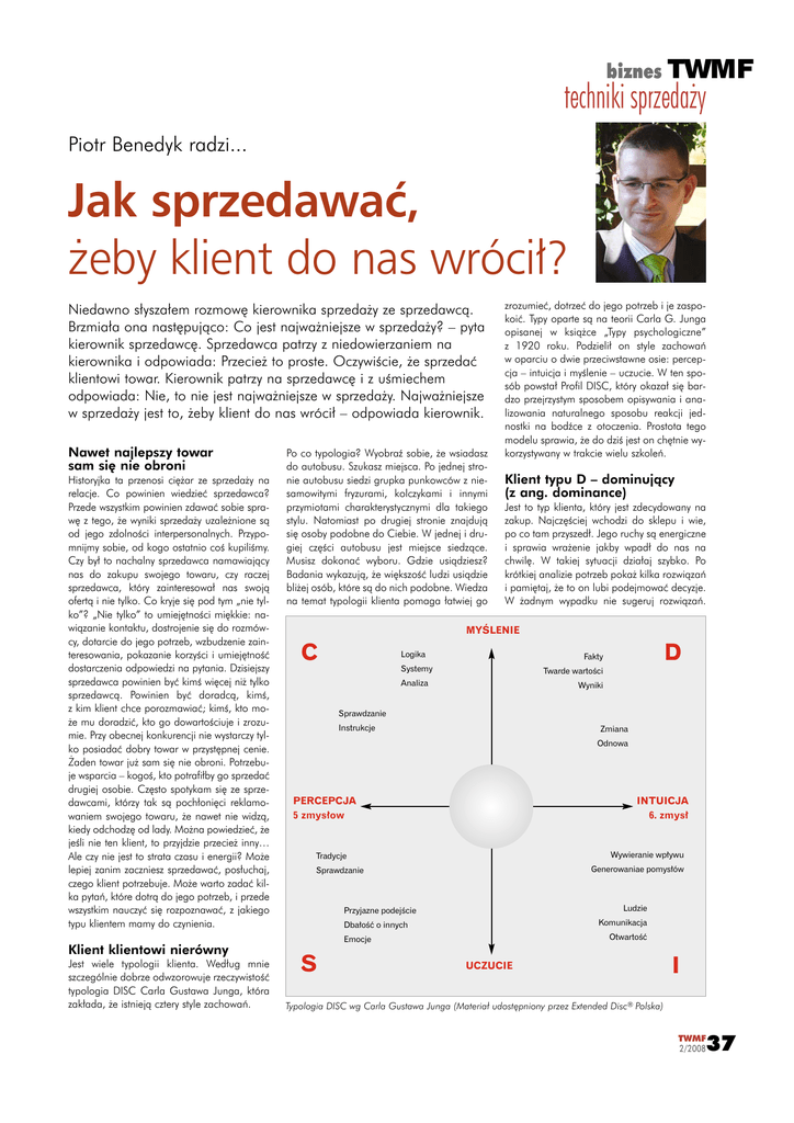 biznes TWMF techniki sprzeda˝y Piotr Benedyk radzi... Jak sprzedawaç, ˝eby klient do nas wróci∏? Niedawno s∏ysza∏em rozmow´ kierownika sprzeda˝y ze sprzedawcà. Brzmia∏a ona nast´pujàco: Co jest najwa˝niejsze w sprzeda˝y? – pyta kierownik sprzedawc´. Sprzedawca patrzy z niedowierzaniem na kierownika i odpowiada: Przecie˝ to proste. OczywiÊcie, ˝e sprzedaç klientowi towar. Kierownik patrzy na sprzedawc´ i z uÊmiechem odpowiada: Nie, to nie jest najwa˝niejsze w sprzeda˝y. Najwa˝niejsze w sprzeda˝y jest to, ˝eby klient do nas wróci∏ – odpowiada kierownik. Nawet najlepszy towar sam si´ nie obroni Historyjka ta przenosi ci´˝ar ze sprzeda˝y na relacje. Co powinien wiedzieç sprzedawca? Przede wszystkim powinien zdawaç sobie spraw´ z tego, ˝e wyniki sprzeda˝y uzale˝nione sà od jego zdolnoÊci interpersonalnych. Przypomnijmy sobie, od kogo ostatnio coÊ kupiliÊmy. Czy by∏ to nachalny sprzedawca namawiajàcy nas do zakupu swojego towaru, czy raczej sprzedawca, który zainteresowa∏ nas swojà ofertà i nie tylko. Co kryje si´ pod tym „nie tylko”? „Nie tylko” to umiej´tnoÊci mi´kkie: nawiàzanie kontaktu, dostrojenie si´ do rozmówcy, dotarcie do jego potrzeb, wzbudzenie zainteresowania, pokazanie korzyÊci i umiej´tnoÊç dostarczenia odpowiedzi na pytania. Dzisiejszy sprzedawca powinien byç kimÊ wi´cej ni˝ tylko sprzedawcà. Powinien byç doradcà, kimÊ, z kim klient chce porozmawiaç; kimÊ, kto mo˝e mu doradziç, kto go dowartoÊciuje i zrozumie. Przy obecnej konkurencji nie wystarczy tylko posiadaç dobry towar w przyst´pnej cenie. ˚aden towar ju˝ sam si´ nie obroni. Potrzebuje wsparcia – kogoÊ, kto potrafi∏by go sprzedaç drugiej osobie. Cz´sto spotykam si´ ze sprzedawcami, którzy tak sà poch∏oni´ci reklamowaniem swojego towaru, ˝e nawet nie widzà, kiedy odchodz´ od lady. Mo˝na powiedzieç, ˝e jeÊli nie ten klient, to przyjdzie przecie˝ inny… Ale czy nie jest to strata czasu i energii? Mo˝e lepiej zanim zaczniesz sprzedawaç, pos∏uchaj, czego klient potrzebuje. Mo˝e warto zadaç kilka pytaƒ, które dotrà do jego potrzeb, i przede wszystkim nauczyç si´ rozpoznawaç, z jakiego typu klientem mamy do czynienia. Po co typologia? Wyobraê sobie, ˝e wsiadasz do autobusu. Szukasz miejsca. Po jednej stronie autobusu siedzi grupka punkowców z niesamowitymi fryzurami, kolczykami i innymi przymiotami charakterystycznymi dla takiego stylu. Natomiast po drugiej stronie znajdujà si´ osoby podobne do Ciebie. W jednej i drugiej cz´Êci autobusu jest miejsce siedzàce. Musisz dokonaç wyboru. Gdzie usiàdziesz? Badania wykazujà, ˝e wi´kszoÊç ludzi usiàdzie bli˝ej osób, które sà do nich podobne. Wiedza na temat typologii klienta pomaga ∏atwiej go zrozumieç, dotrzeç do jego potrzeb i je zaspokoiç. Typy oparte sà na teorii Carla G. Junga opisanej w ksià˝ce „Typy psychologiczne” z 1920 roku. Podzieli∏ on style zachowaƒ w oparciu o dwie przeciwstawne osie: percepcja – intuicja i myÊlenie – uczucie. W ten sposób powsta∏ Profil DISC, który okaza∏ si´ bardzo przejrzystym sposobem opisywania i analizowania naturalnego sposobu reakcji jednostki na bodêce z otoczenia. Prostota tego modelu sprawia, ˝e do dziÊ jest on ch´tnie wykorzystywany w trakcie wielu szkoleƒ. Klient typu D – dominujàcy (z ang. dominance) Jest to typ klienta, który jest zdecydowany na zakup. Najcz´Êciej wchodzi do sklepu i wie, po co tam przyszed∏. Jego ruchy sà energiczne i sprawia wra˝enie jakby wpad∏ do nas na chwil´. W takiej sytuacji dzia∏aj szybko. Po krótkiej analizie potrzeb poka˝ kilka rozwiàzaƒ i pami´taj, ˝e to on lubi podejmowaç decyzje. W ˝adnym wypadku nie sugeruj rozwiàzaƒ. MYÂLENIE C Logika Twarde wartoÊci Analiza Wyniki Sprawdzanie Instrukcje Zmiana Odnowa INTUICJA 6. zmys∏ PERCEPCJA 5 zmys∏ow Wywieranie wp∏ywu Tradycje Generowaniae pomys∏ów Sprawdzanie Ludzie Przyjazne podejÊcie Komunikacja Dba∏oÊç o innych OtwartoÊç Emocje Klient klientowi nierówny Jest wiele typologii klienta. Wed∏ug mnie szczególnie dobrze odwzorowuje rzeczywistoÊç typologia DISC Carla Gustawa Junga, która zak∏ada, ˝e istniejà cztery style zachowaƒ. D Fakty Systemy S UCZUCIE I Typologia DISC wg Carla Gustawa Junga (Materia∏ udost´pniony przez Extended Disc® Polska) TWMF 2/2008 37 biznesTWMF techniki sprzeda˝y Dla niego wa˝ne sà korzyÊci z zakupu, dlatego pami´taj, ˝eby o nich mówiç w sposób pewny, konkretny i wprost. Mów krótko i na temat, bo taki klient nie lubi traciç czasu. Wa˝nym elementem jest s∏uchanie i przytakiwanie. Nie przekonuj go do niczego, bo go stracisz. Tego typu klienci mówià to, co myÊlà, sà bezpoÊredni i bezceremonialni. Pami´taj, nie odbieraj ich s∏ów personalnie. SAMOREALIZACJI UZNANIA I SZACUNKU Klient typu I – ekspresyjny (z ang. influence) Osoby, które charakteryzujà si´ zachowaniami tego typu mo˝na poznaç po du˝ej ekspresji w wyra˝aniu siebie, zarówno werbalnie, jak i niewerbalnie. Lubià du˝o mówiç, z ∏atwoÊcià nawiàzujà kontakty z innymi. Dla takiego klienta wa˝na jest atmosfera, nie lubi koncentrowaç si´ na szczegó∏ach i woli mówiç ni˝ s∏uchaç. Przede wszystkim pozwól mu si´ wygadaç i utrzymuj przyjaznà, przyjacielskà atmosfer´. Rozpalaj zapa∏ klienta. Zamiast rzetelnie i ˝mudnie prezentowaç zalety swojego produktu, utnij z nim pogaw´dk´. Bardziej koncentruj uwag´ na czynnikach ludzkich ni˝ na samym przedmiocie sprzeda˝y, np. Prosz´ wyobraziç sobie zachwyt w oczach znajomych, kiedy pojawi si´ Pani w tej kreacji na bankiecie. Zamiast koncentrowaç si´ na praktycznych aspektach towaru, np. W tym swetrze na pewno Pani nie zmarznie, podkreÊlaj jego wyjàtkowoÊç i niedost´pnoÊç. Klient typu S – sta∏y (ang. steadiness) Klient S post´puje ostro˝nie. Dla niego najwa˝niejsze w sprzeda˝y jest bezpieczeƒstwo zakupu. Woli s∏uchaç ni˝ mówiç. Z taki