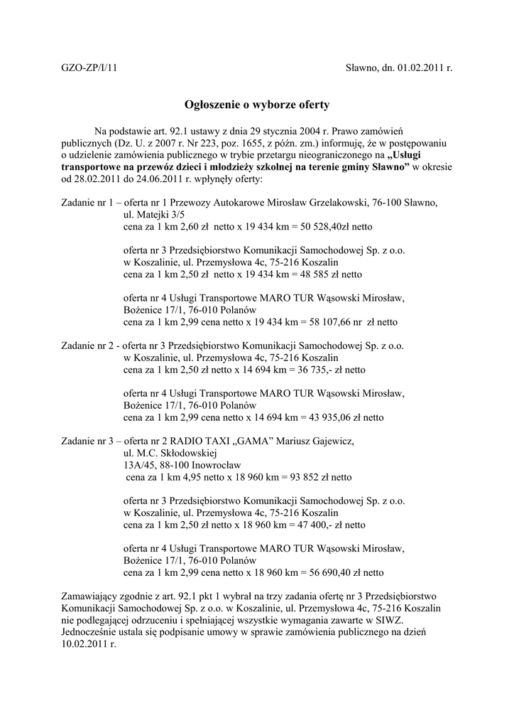 GZO-ZP/I/11 Sławno, dn. 01.02.2011 r. Ogłoszenie o wyborze oferty Na podstawie art. 92.1 ustawy z dnia 29 stycznia 2004 r. Prawo zamówień publicznych (Dz. U. z 2007 r. Nr 223, poz. 1655, z późn. zm.) informuję, że w postępowaniu o udzielenie zamówienia publicznego w trybie przetargu nieograniczonego na „Usługi transportowe na przewóz dzieci i młodzieży szkolnej na terenie gminy Sławno” w okresie od 28.02.2011 do 24.06.2011 r. wpłynęły oferty: Zadanie nr 1 – oferta nr 1 Przewozy Autokarowe Mirosław Grzelakowski, 76-100 Sławno, ul. Matejki 3/5 cena za 1 km 2,60 zł netto x 19 434 km = 50 528,40zł netto oferta nr 3 Przedsiębiorstwo Komunikacji Samochodowej Sp. z o.o. w Koszalinie, ul. Przemysłowa 4c, 75-216 Koszalin cena za 1 km 2,50 zł netto x 19 434 km = 48 585 zł netto oferta nr 4 Usługi Transportowe MARO TUR Wąsowski Mirosław, Bożenice 17/1, 76-010 Polanów cena za 1 km 2,99 cena netto x 19 434 km = 58 107,66 nr zł netto Zadanie nr 2 - oferta nr 3 Przedsiębiorstwo Komunikacji Samochodowej Sp. z o.o. w Koszalinie, ul. Przemysłowa 4c, 75-216 Koszalin cena za 1 km 2,50 zł netto x 14 694 km = 36 735,- zł netto oferta nr 4 Usługi Transportowe MARO TUR Wąsowski Mirosław, Bożenice 17/1, 76-010 Polanów cena za 1 km 2,99 cena netto x 14 694 km = 43 935,06 zł netto Zadanie nr 3 – oferta nr 2 RADIO TAXI „GAMA” Mariusz Gajewicz, ul. M.C. Skłodowskiej 13A/45, 88-100 Inowrocław cena za 1 km 4,95 netto x 18 960 km = 93 852 zł netto oferta nr 3 Przedsiębiorstwo Komunikacji Samochodowej Sp. z o.o. w Koszalinie, ul. Przemysłowa 4c, 75-216 Koszalin cena za 1 km 2,50 zł netto x 18 960 km = 47 400,- zł netto oferta nr 4 Usługi Transportowe MARO TUR Wąsowski Mirosław, Bożenice 17/1, 76-010 Polanów cena za 1 km 2,99 cena netto x 18 960 km = 56 690,40 zł netto Zamawiający zgodnie z art. 92.1 pkt 1 wybrał na trzy zadania ofertę nr 3 Przedsiębiorstwo Komunikacji Samochodowej Sp. z o.o. w Koszalinie, ul. Przemysłowa 4c, 75-216 Koszalin nie podlegającej odrzuceniu i spełniającej wszystkie wymagania zawarte w SIWZ. Jednocześnie ustala się podpisanie umowy w sprawie zamówienia publicznego na dzień 10.02.2011 r.