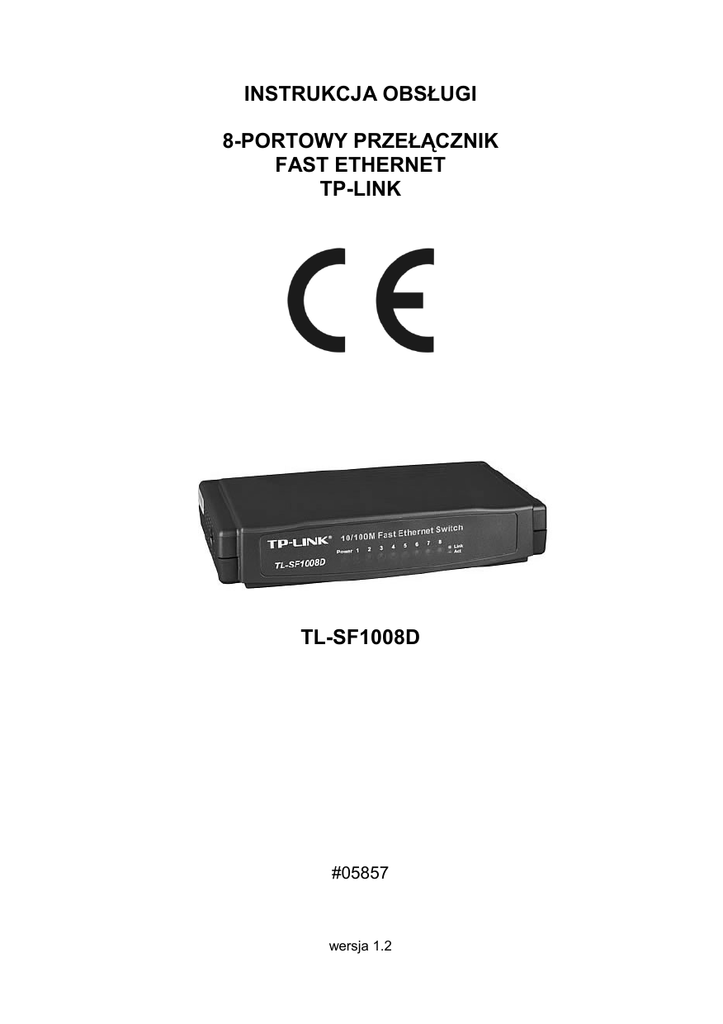 INSTRUKCJA OBSŁUGI 8-PORTOWY PRZEŁĄCZNIK FAST ETHERNET TP-LINK TL-SF1008D #05857 wersja 1.2 WSTĘP CSH-1600E to wysokowydajne, niezarządzalne urządzenie sieciowe wyposaŜone w 8 portów RJ45 10/100 Mb/s. Przełącznik przeznaczony jest głównie dla małych i średnich sieci LAN. KaŜdy port pracuje z niezaleŜną, automatycznie dostosowywaną przepustowością pracy. Niewielkie wymiary, korzystna cena oraz łatwa instalacja sprawiają, Ŝe jest to doskonałe urządzenie dla administratorów niewielkich sieci lokalnych. Bezpieczeństwo uŜytkowania Urządzenie zostało zaprojektowane i wyprodukowane z najwyŜszą starannością o bezpieczeństwo osób instalujących i uŜytkujących. Dla zapewnienia bezpieczeństwa pracy, naleŜy stosować się do wszelkich wskazań zawartych w tej instrukcji jak i instrukcjach urządzeń towarzyszących (np. komputera PC). 1. Zawartość opakowania - 8-portowy niezarządzalny przełącznik TL-SF1008D, - zasilacz 9V DC 0,8A, - instrukcja obsługi w języku angielskim, - niniejsza instrukcja obsługi. Podczas dostawy naleŜy upewnić się, czy opakowanie nie jest uszkodzone. W przypadku stwierdzonych uszkodzeń naleŜy niezwłocznie skontaktować się z dostawcą. Prosimy równieŜ o sprawdzenie zgodności zawartości opakowania z powyŜej zamieszczoną listą. 2. Zawartość instrukcji Instrukcja ta zawiera opis przełącznika sieciowego serii TL-SF1008D z odpowiednimi procedurami instalacji, konfiguracji i uŜytkownania. Przed przystąpieniem do instalacji urządzenia naleŜy dokładnie przeczytać całość instrukcji, a w szczególności punkty poświęcone bezpieczeństwu. 3. Zasady bezpieczeństwa Przełącznik serii TL-SF1008D jest zgodny z przepisami w zakresie bezpieczeństwa uŜytkowania urządzeń elektrycznych. − gniazdo sieciowe musi być uziemione zgodnie z obowiązujacymi przepisami, − przed przeniesieniem lub wykonaniem innych operacji technicznych urządzenie naleŜy odłączyć od zasilania, − nie stosować uszkodzonych lub zuŜytych przewodów zasilania, gdyŜ powodują one znaczne zagroŜenie dla bezpieczeństwa uŜytkownika, − prace instalacyjne muszą być wykonywane przez odpowiednio wyszkolony personel techniczny, − nie stosować urządzenia w miejscach występowania substancji łatwopalnych, − zabezpieczyć urządzenie przed dostępem dzieci lub osób niepowołanych, − upewnić się, Ŝe urządzenie zostało odpowiednio zamocowane, − urządzenie jest wyłączone dopiero po odłączeniu przewodów zasilania oraz przewodów łączących je z innymi urządzeniami, − jeśli urządzenie zostanie przeniesione z miejsca chłodnego do ciepłego, w jego wnętrzu moŜe skroplić się para wodna uniemoŜliwiając prawidłowe funkcjonowanie. NaleŜy wówczas odczekać, aŜ wilgoć odparuje, UWAGA: Nie naleŜy dotykać styków gniazd znajdujących sie na obudowie urządzenia. Wyładowanie elektrostatyczne moŜe spowodować trwałe uszkodzenie urządzenia. 2 4. Instalacja sprzętu 4.1. Zasilanie NaleŜy podłączyć przełącznik do sieci 230V przy pomocy załączonego zasilacza. 4.2. Oprogramowanie Do prawidłowego funkcjonowania przełącznika nie jest wymagane instalowanie dodatkowego oprogramowania. 4.3. Środowisko pracy Przełącznik został zaprojektowany do pracy w warunkach biurowych i domowych. NaleŜy zadbać, aby urządzenie umieszone było w sposób zapewniający dobry przepływ powietrza i łatwy dostęp do portów. Powietrze powinno być wolne od zanieczyszczeń, a urządzenie nie powinno znajdować się w bezpośredniej bliskości źródeł ciepła (np. piece, grzejniki, bezpośrednie nasłonecznienie), bądź urządzeń generujących zakłócenia elektromagnetyczne (np. silniki, telewizory itp.). 4.4. Wskaźniki LED Przełącznik naleŜy umieścić w taki sposób, by było widać diody kontrolne na przednim panelu urządzenia. POWER Świecenie ciągłe oznacza włączone zasilanie. LINK / ACT Świecenie ciągłe oznacza prawidłowe zestawienie połączenia na danym porcie. Pulsowanie diody oznacza, Ŝe przez port przesyłane są dane. 5. Instalacja okablowania Do połączenia przełącznika z innymi urządzeniami sieciowymi zaleca się stosowanie przyłączy odpowiednich dla typu wbudowanych portów. Specyfikacja przyłączy UTP: - przyłącznik sieciowy obsługuje funkcje automatycznego krosowania MDI/MDI-X, z tego powodu do podłączenia elementów sieci aktywnych i pasywnych moŜna wykorzystać przyłącza krosowane (cross-over) i niekrosowane (straight-through), - do połączenia przełącznika sieciowego z komputerem naleŜy wykorzystać przyłącze UTP kat. 5 lub wyŜszej, - maksymalna długość zastosowanego przyłącza UTP wynosi 100m. 6. Konserwacja Przełącznik sieciowy TL-SF1008D nie wymaga Ŝadnych szczególnych czynności konserwacyjnych. Zalecamy umieszczenie go na trwałej podstawie i takie poprowadzenie przewodów zasilających, aby nie mogły być przypadkowo uszkodzone przez operatora lub osoby postronne. 3 7. Informacja dla uŜytkowników o pozbywaniu się urządzeń elektrycznych i elektronicznych (dotyczy gospodarstw domowych) Przedstawiony symbol umieszczony na produktach lub dołączonej do nich dokumentacji informuje, Ŝe niesprawnych urządzeń elektrycznych lub elektronicznych nie moŜna wyrzucać razem z odpadami gospodarczymi. Prawidłowe postępowanie w razie konieczności utylizacji, powtórnego uŜycia lub odzysku podzespołów polega na przekazaniu urządzenia do wyspecjalizowanego punktu zbiórki, gdzie będzie przyjęte bezpłatnie. W niektórych krajach produkt moŜna oddać lokalnemu dystrybutorowi podczas zakupu innego urządzenia. Prawidłowa utylizacja urządzenia umoŜliwia zachowanie cennych zasobów i uniknięcie negatywnego wpływu na zdrowie i środowisko, które moŜe być zagroŜone przez nieodpowiednie postępowanie z odpadami. Szczegółowe informacje o najbliŜszym punkcie zbiórki moŜna uzyskać u władz lokalnych. Nieprawidłowa utylizacja odpadów zag