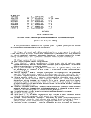 Dz.U.96.10.55 1997.10.22 1998.09.01 2000.01.01 2000.01.03 2000.12.04 2001.01.01 2001.12.04 2004.01.15 zm. zm. zm. zm. zm. zm. zm. zm. Dz.U.1997.121.770 Dz.U.1997.88.554 Dz.U.1999.96.1107 Dz.U.1999.96.1107 Dz.U.1999.96.1107 Dz.U.1999.96.1107 Dz.U.1999.96.1107 Dz.U.2003.229.2274 art. 82 art. 5 § 2 pkt 47 art. 1 art. 1 art. 1 art. 1 art. 1 art. 1 USTAWA z dnia 9 listopada 1995 r. o ochronie zdrowia przed następstwami używania tytoniu i wyrobów tytoniowych. (Dz. U. z dnia 30 stycznia 1996 r.) W celu przeciwdziałania uzależnieniu od używania tytoniu i wyrobów tytoniowych oraz ochrony zdrowia przed jego następstwami stanowi się, co następuje: Art. 1. Organy administracji rządowej i samorządu terytorialnego są obowiązane do podejmowania działań zmierzających do ochrony zdrowia przed następstwami używania tytoniu oraz mogą wspierać w tym zakresie działalność medycznych samorządów zawodowych, organizacji społecznych, fundacji, instytucji i zakładów pracy, a także współdziałać z kościołami i innymi związkami wyznaniowymi. Art. 2. Użyte w ustawie określenia oznaczają: 1) "tytoń" - rośliny tytoniowe uprawne rodzaju Nicotiana, 2) "wyroby tytoniowe" - wszelkie wyprodukowane z tytoniu wyroby, takie jak papierosy, cygara, cygaretki, tytoń fajkowy, machorka, tabaka i inne, zawierające tytoń lub jego składniki, z wyłączeniem środków farmaceutycznych zawierających nikotynę, 3) "wyroby tytoniowe bezdymne" - wyroby tytoniowe przeznaczone do wąchania (tabaka), ssania, żucia lub wprowadzania do organizmu w innej postaci, z wyłączeniem środków farmaceutycznych zawierających nikotynę, 4) "rekwizyty tytoniowe" - artykuły i przyrządy przeznaczone do używania tytoniu, jak papierośnice, cygarniczki, bibułki papierosowe, urządzenia do zwijania papierosów, fajki oraz przybory do ich czyszczenia i nabijania, popielniczki, obcinacze do cygar itp. (z wyłączeniem zapalniczek i zapałek), 5) "reklama wyrobów tytoniowych" - publiczne rozpowszechnianie wizerunków marek wyrobów tytoniowych lub symboli graficznych z nimi związanych, a także nazw i symboli graficznych firm produkujących wyroby tytoniowe, nie różniących się od nazw i symboli graficznych wyrobów tytoniowych, służących popularyzowaniu marek wyrobów tytoniowych; za reklamę nie uważa się informacji używanych do celów handlowych pomiędzy firmami zajmującymi się produkcją, dystrybucją i handlem wyrobami tytoniowymi, 6) "informacja o wyrobach tytoniowych" - informacja o markach wyrobów tytoniowych oraz o zawartości substancji szkodliwych, nie zawierająca przekazu zachęcającego do zakupu lub używania wyrobów tytoniowych, umieszczona wyłącznie w punktach sprzedaży tych wyrobów, 6a) "substancje smoliste" - surowy, bezwodny beznikotynowy kondensat dymu tytoniowego, 6b) "nikotyna" - alkaloidy nikotynowe, 6c) "tlenek węgla" (CO) - bezbarwny, bezwonny gaz, który powstaje w wyniku niepełnego spalania substancji organicznych, występujący w fazie gazowej dymu papierosowego, 6d) "dodatek" - wszelkie substancje lub składniki z wyłączeniem liści tytoniu lub innych naturalnych lub nieprzetworzonych elementów tytoniu używane przy produkcji wyrobu tytoniowego i obecne w gotowym wyrobie, nawet w formie zmienionej, uwzględniając także papier, filtr, farby i kleje, 7) "promocja wyrobów tytoniowych" - publiczne rozdawanie wyrobów tytoniowych lub rekwizytów tytoniowych, organizowanie degustacji, premiowanej sprzedaży wyrobów tytoniowych, konkursów opartych na zakupie wyrobów lub rekwizytów tytoniowych oraz inne formy publicznego zachęcania do nabywania lub używania wyrobów tytoniowych, 8) "sponsorowanie" - wspieranie w formie finansowej lub rzeczowej działalności osób i instytucji, związane z eksponowaniem nazw produktów i firm handlowych oraz ich symboli graficznych. Art. 3. Ochrona zdrowia przed następstwami używania tytoniu realizowana jest przez kształtowanie polityki zdrowotnej, ekonomicznej i społecznej, do której należy: 1) ochrona prawa niepalących do życia w środowisku wolnym od dymu tytoniowego, 2) promocja zdrowia przez propagowanie stylu życia wolnego od nałogu papierosów i używania wyrobów tytoniowych, 2a) działalność wychowawcza i informacyjna, 3) tworzenie warunków ekonomicznych i prawnych zachęcających do ograniczenia używania tytoniu, 4) informowanie o szkodliwości palenia tytoniu i zawartości substancji szkodliwych na opakowaniach wyrobów tytoniowych i informacjach o wyrobach tytoniowych, 5) obniżanie norm dopuszczalnych zawartości substancji szkodliwych w wyrobach tytoniowych, 6) leczenie i rehabilitacja osób uzależnionych od tytoniu. Art. 4. 1. Rada Ministrów ustala program określający politykę zdrowotną, społeczną i ekonomiczną, zmierzający do zmniejszenia używania wyrobów tytoniowych. 2. Rada Ministrów składa coroczne sprawozdanie Sejmowi z realizacji tego programu w terminie do 30 kwietnia. 3. Program, o którym mowa w ust. 1, jest finansowany z budżetu państwa w wysokości 0,5% wartości podatku akcyzowego od wyrobów tytoniowych. Art. 5. 1. Zabrania się palenia wyrobów tytoniowych poza pomieszczeniami wyodrębnionymi i odpowiednio przystosowanymi: 1) w zakładach opieki zdrowotnej, z zastrzeżeniem ust. 2, 2) w szkołach i placówkach oświatowo-wychowawczych, 3) w pomieszczeniach zakładów pracy oraz innych obiektów użyteczności publicznej, a w małych, jednoizbowych lokalach gastronomicznych - poza wyraźnie wyodrębnionymi miejscami. 1a. Za wprowadzenie zakazu palenia tytoniu w miejscach, o których mowa w ust. 1, odpowiedzialny jest właściciel lub użytkownik obiektu. 2. W szczególnych przypadkach lekarz prowadzący leczenie może zezwolić pacjentowi przebywającemu w zakładzie opieki zdrowotnej na odstępstwo od zakazu palenia wyrobów tytoniowych. 3. Minister właściwy do spraw obrony narodowej, minister właściwy do spraw wewnętrznych i minister właściwy do spraw spr