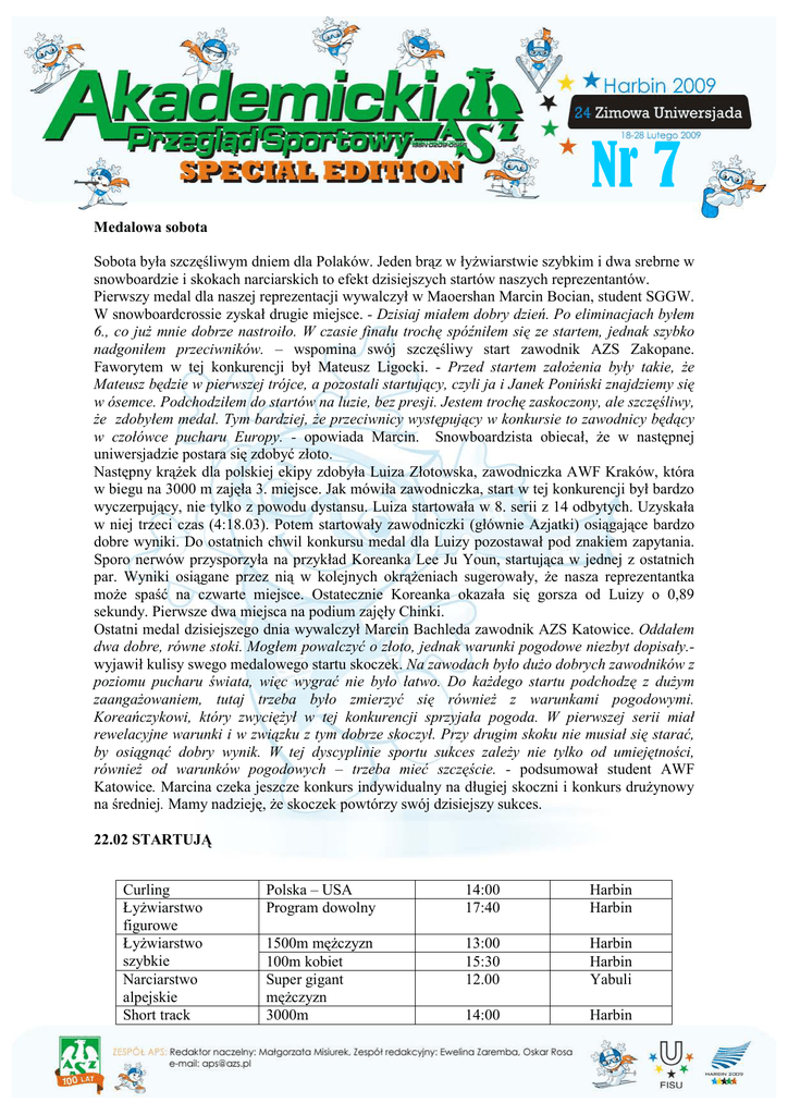 Nr 7 Medalowa sobota Sobota była szczęśliwym dniem dla Polaków. Jeden brąz w łyŜwiarstwie szybkim i dwa srebrne w snowboardzie i skokach narciarskich to efekt dzisiejszych startów naszych reprezentantów. Pierwszy medal dla naszej reprezentacji wywalczył w Maoershan Marcin Bocian, student SGGW. W snowboardcrossie zyskał drugie miejsce. - Dzisiaj miałem dobry dzień. Po eliminacjach byłem 6., co juŜ mnie dobrze nastroiło. W czasie finału trochę spóźniłem się ze startem, jednak szybko nadgoniłem przeciwników. – wspomina swój szczęśliwy start zawodnik AZS Zakopane. Faworytem w tej konkurencji był Mateusz Ligocki. - Przed startem załoŜenia były takie, Ŝe Mateusz będzie w pierwszej trójce, a pozostali startujący, czyli ja i Janek Poniński znajdziemy się w ósemce. Podchodziłem do startów na luzie, bez presji. Jestem trochę zaskoczony, ale szczęśliwy, Ŝe zdobyłem medal. Tym bardziej, Ŝe przeciwnicy występujący w konkursie to zawodnicy będący w czołówce pucharu Europy. - opowiada Marcin. Snowboardzista obiecał, Ŝe w następnej uniwersjadzie postara się zdobyć złoto. Następny krąŜek dla polskiej ekipy zdobyła Luiza Złotowska, zawodniczka AWF Kraków, która w biegu na 3000 m zajęła 3. miejsce. Jak mówiła zawodniczka, start w tej konkurencji był bardzo wyczerpujący, nie tylko z powodu dystansu. Luiza startowała w 8. serii z 14 odbytych. Uzyskała w niej trzeci czas (4:18.03). Potem startowały zawodniczki (głównie Azjatki) osiągające bardzo dobre wyniki. Do ostatnich chwil konkursu medal dla Luizy pozostawał pod znakiem zapytania. Sporo nerwów przysporzyła na przykład Koreanka Lee Ju Youn, startująca w jednej z ostatnich par. Wyniki osiągane przez nią w kolejnych okrąŜeniach sugerowały, Ŝe nasza reprezentantka moŜe spaść na czwarte miejsce. Ostatecznie Koreanka okazała się gorsza od Luizy o 0,89 sekundy. Pierwsze dwa miejsca na podium zajęły Chinki. Ostatni medal dzisiejszego dnia wywalczył Marcin Bachleda zawodnik AZS Katowice. Oddałem dwa dobre, równe stoki. Mogłem powalczyć o złoto, jednak warunki pogodowe niezbyt dopisały.wyjawił kulisy swego medalowego startu skoczek. Na zawodach było duŜo dobrych zawodników z poziomu pucharu świata, więc wygrać nie było łatwo. Do kaŜdego startu podchodzę z duŜym zaangaŜowaniem, tutaj trzeba było zmierzyć się równieŜ z warunkami pogodowymi. Koreańczykowi, który zwycięŜył w tej konkurencji sprzyjała pogoda. W pierwszej serii miał rewelacyjne warunki i w związku z tym dobrze skoczył. Przy drugim skoku nie musiał się starać, by osiągnąć dobry wynik. W tej dyscyplinie sportu sukces zaleŜy nie tylko od umiejętności, równieŜ od warunków pogodowych – trzeba mieć szczęście. - podsumował student AWF Katowice. Marcina czeka jeszcze konkurs indywidualny na długiej skoczni i konkurs druŜynowy na średniej. Mamy nadzieję, Ŝe skoczek powtórzy swój dzisiejszy sukces. 22.02 STARTUJĄ Curling ŁyŜwiarstwo figurowe ŁyŜwiarstwo szybkie Narciarstwo alpejskie Short track Polska – USA Program dowolny 14:00 17:40 Harbin Harbin 1500m męŜczyzn 100m kobiet Super gigant męŜczyzn 3000m 13:00 15:30 12.00 Harbin Harbin Yabuli 14:00 Harbin