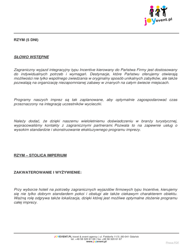 RZYM (5 DNI) SŁOWO WSTĘPNE Zagraniczny wyjazd integracyjny typu Incentive kierowany do Państwa Firmy jest dostosowany do indywidualnych potrzeb i wymagań. Destynacje, które Państwu oferujemy otwierają możliwości nie tylko wspólnego zwiedzania w oryginalny sposób unikalnych zabytków, ale także pozwalają na organizację niezapomnianej zabawy w znanych na całym świecie miejscach. Programy naszych imprez są tak zaplanowane, aby optymalnie zagospodarować czas przeznaczony na integrację uczestników wycieczki. Należy dodać, że dzięki naszemu wieloletniemu doświadczeniu w branży turystycznej, wypracowaliśmy kontakty z zagranicznymi partnerami. Pozwala to na zapewnie usług o wysokim standardzie i skonstruowanie ekskluzywnego programu imprezy. RZYM – STOLICA IMPERIUM ZAKWATEROWANIE I WYŻYWIENIE: Przy wyborze hoteli na potrzeby zagranicznych wyjazdów firmowych typu Incentive, kierujemy się nie tylko dobrym standardem pokoi i obsługi ale także ciekawym charakterem obiektu. Ważną rolę odgrywa także lokalizacja, dzięki której jest możliwe optymalne złożenie programu całej imprezy. JOYEVENT.PL travel & event agency | ul. Fieldorfa 11/3 | 80-041 Gdańsk tel. +48 58 320 61 69 | fax +48 58 320 61 67 www.joyevent.pl Phoca PDF Dbamy także oto aby uczestnicy wyjazdu mieli okazję poznać typowo regionalną kuchnię a potrawy serwowane były w odpowiedni dla danego kraju sposób. W wybranych przez nas hotelach istnieje możliwość rezerwacji sali konferencyjnej. ZAPEWNIAMY NOCLEG I WYŻYWIENIE W HOTELU: HOTEL FLEMING**** Obiekt położony 5 km od centrum Rzymu, nieopodal Stadionu olimpijskiego w północnej części miasta. Do dyspozycji gości jest 300 pokoi (prysznic/wanna, WC, mini bar, TV, sejf, klimatyzacja). W budynku znajduje się American Bar oraz restauracja z regionalną oraz międzynarodową kuchnią. WYŻYWIENIE: - 4 x śniadanie w formie bufetu szwedzkiego w restauracji hotelowej - 4 x obiadokolacja w formie bufetu szwedzkiego w restauracji JOYEVENT.PL travel & event agency | ul. Fieldorfa 11/3 | 80-041 Gdańsk tel. +48 58 320 61 69 | fax +48 58 320 61 67 www.joyevent.pl Phoca PDF TRANSPORT: Dla oszczędności Państwa czasu, transport podczas naszych zagranicznych imprez integracyjnych organizowany jest najczęściej samolotem z lotniska najbliższego od miejsca zamieszkania uczestników imprezy do miejsca docelowego. Jako licencjonowany organizator turystyczny, mamy możliwość rezerwacji grupowej w samolotach zarówno tanich linii lotniczych jak i tradycyjnych – regularnych lotów pasażerskich. Nasza usługa transportowa jest przeprowadzona kompleksowo i zawiera: wyszukanie optymalnego lotu – także złożonego ( z międzylądowaniami i przesiadkami), rezerwację biletów oraz zapewnienie pomocy pilota wycieczki przy odprawie na lotniskach. Po wylądowaniu w miejscu docelowym zorganizowany jest dla Państwa całej grupy transfer do hotelu a także transfer powrotny na lotnisko w dniu wyjazdu. ZAPEWNIAMY LOT NA TRASIE (za dodatkową opłatą): Gdańsk – (Warszawa) – Rzym – (Warszawa) - Gdańsk ZAPEWNIAMY TRANSFER AUTOAKAREM NA TRASIE: Lotnisko – hotel - lotnisko PROGRAM: JOYEVENT.PL travel & event agency | ul. Fieldorfa 11/3 | 80-041 Gdańsk tel. +48 58 320 61 69 | fax +48 58 320 61 67 www.joyevent.pl Phoca PDF Nasi klienci mają wpływ na kształt ostatecznego wyglądu i ceny imprezy, poprzez możliwość wyboru aktywności według własnego zapotrzebowania. Dlatego program wyjazdu integracyjnego, który oferujemy Państwu zawiera Pakiet podstawowy – czyli najważniejsze świadczenia (nocleg, wyżywienie, pilotaż), które obejmuje cena oraz za dodatkową dopłatą atrakcje dodatkowe. CENA: - 4 x nocleg w Hotel Fleming **** w pokojach 2 osobowych - Wyżywienie: 4 x śniadanie w hotelu , 4 x obiadokolacja w restauracji hotelowej - Transfer autobusem na trasie: lotnisko – hotel – lotnisko - Opieka pilota wycieczki podczas pierwszego dnia imprezy CENY USTALAMY INDYWIDUALNIE W ZALEŻNOŚCI OD TERMINU ORAZ ILOŚCI OSÓB! CENA NIE ZAWIERA: - Przelotu samolotem – orientacyjna cena 1000 – 2000 PLN - Ubezpieczenie KL i NNW – ok. 25 PLN / osobę - Propozycji dodatkowych do programu - Napoi do obiadokolacji PROPONOWANE WYCIECZKI PODCZAS POBYTU: JOYEVENT.PL travel & event agency | ul. Fieldorfa 11/3 | 80-041 Gdańsk tel. +48 58 320 61 69 | fax +48 58 320 61 67 www.joyevent.pl Phoca PDF 1. ZABYTKOWY RZYM Podczas tej wycieczki uczestnicy odwiedzą potężne miasto jakim jest stolica Włoch. Rzym to miasto zachwycające swoją architekturą, położone na siedmiu wzgórzach skupionych nad rzeką Tyber. Podczas zwiedzania zabytków można poczuć wspaniałą atmosferę miasta. Warte zwiedzenia są takie miejsca i obiekty jak: Koloseum – najsłynniejszy amfiteatr świata, w którym odbywały się walki gladiatorów; Forum Romanum - Centrum polityczne i towarzyskie Rzymu okresu republiki. Zobaczyć można także Fontannę di Trevi - najbardziej znaną barokową fontannę, przy której Federico Fellini nagrywał swój słynny film „La Dolce Vita” a także Schody hiszpańskie czy Plac Piazza Navona. Wśród urokliwych uliczek Rzymu mogą Państwo zagościć w licznych kawiarniach w których delektować można się włoskim espresso czy pysznymi lodami. 2. ODWIEDZINY U PAPIEŻA Podczas podróży do Rzymu nie można ominąć Bazyliki św. Piotra. Wielkie wrażenie robi ogrom architektury oraz piękno malarstwa wewnątrz świątyni, a także plac na którym zbierają się tłumy słuchające głosu papieża. Godne polecenia jest Muzeum Watykańskie wraz z Kaplicą Sykstyńską, freskami i obrazami Michała Anioła. JOYEVENT.PL travel & event agency | ul. Fieldorfa 11/3 | 80-041 Gdańsk tel. +48 58 320 61 69 | fax +48 58 320 61 67 www.joyevent.pl Phoca PDF Po powrocie z tego wspaniałego miasta będą Państwo z pewnością wspominać piękny i zachwycający dech w piersiach widok z wieży Bazyliki rozciągający się na cały Rzym. 3. ULI