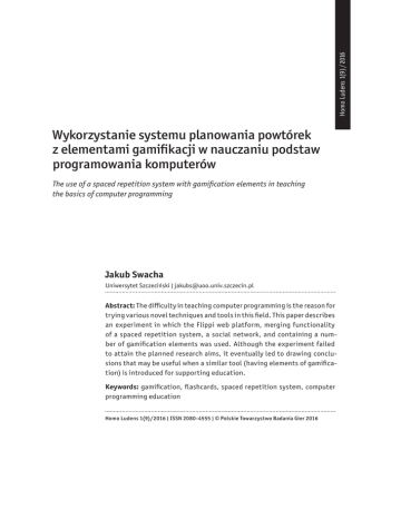 Homo Ludens 1(9) / 2016 Wykorzystanie systemu planowania powtórek z elementami gamifikacji w nauczaniu podstaw programowania komputerów The use of a spaced repetition system with gamification elements in teaching the basics of computer programming Jakub Swacha Uniwersytet Szczeciński | [email protected] Abstract: The difficulty in teaching computer programming is the reason for trying various novel techniques and tools in this field. This paper describes an experiment in which the Flippi web platform, merging functionality of a spaced repetition system, a social network, and containing a number of gamification elements was used. Although the experiment failed to attain the planned research aims, it eventually led to drawing conclusions that may be useful when a similar tool (having elements of gamification) is introduced for supporting education. Keywords: gamification, flashcards, spaced repetition system, computer programming education Homo Ludens 1(9) / 2016 | ISSN 2080-4555 | © Polskie Towarzystwo Badania Gier 2016 1. Wstęp Nauczanie programowania komputerów uważa się za szczególnie trudne (Robins, Rountree, Rountree, 2003; zob. też prace tam cytowane), co jest powodem wypróbowywania wielu rozmaitych podejść. Żadne z nich, jak dotąd, nie okazało się optymalne, choć nie brakowało rozwiązań wykorzystujących – jako przedmiot programowania – gry służące zdobyciu (Leutenegger, Edgington, 2007) lub utrzymaniu (Swacha, 2010) zainteresowania uczniów. Nową szansę na poprawę tego stanu rzeczy przynosi gamifikacja, która, wybiórczo stosując rozwiązania znane z gier, wspiera zarówno motywację zewnętrzną (poprzez umożliwienie gromadzenia punktów, osiągania kolejnych poziomów rozwoju oraz zdobywania odznaczeń i czołowych pozycji w rankingu), jak i wewnętrzną (poprzez wyzwania, rozbudzanie ciekawości, dawanie poczucia sprawowania kontroli i wprowadzanie aspektu fantastycznego). Gamifikacja nierzadko wywołuje w uczestniku zadowolenie z sukcesu, bogactwa, pozycji czy sławy – uczucie, którego wielu osobom brakuje w życiu codziennym (Malone, Lepper, 1987, s. 230, 242). Nie powinno zatem dziwić rosnące zainteresowanie gamifikacją w edukacji (Nah, Zeng, Telaprolu, Ayyappa, Eschenbrenner, 2014; zob. też prace tam cytowane). Wyrazem tego zainteresowania jest również niniejszy artykuł, w którym opisano eksperyment z wykorzystaniem w nauczaniu podstaw programowania – na Wydziale Nauk Ekonomicznych i Zarządzania Uniwersytetu Szczecińskiego – systemu Flippi, w oryginalny sposób łączącego elementy gamifikacji i naukę z użyciem fiszek (Florczak, 2014), oraz zebrane doświadczenia i wynikające z nich wnioski. Artykuł podzielono na pięć sekcji. Po niniejszym wstępie pokrótce przybliżona zostanie koncepcja gamifikacji, jej walory użyteczne z perspektywy edukacji i dotychczasowy zakres wykorzystania we wspomaganiu nauczania programowania komputerów. Dalej opisana będzie platforma Flippi, użyta w eksperymencie, który z kolei omówi sekcja czwarta. Ostatnią poświęcono zaś doświadczeniom uzyskanym w tym przedsięwzięciu i wnioskom z nich płynącym; odnoszą się one nie tylko do gamifikacji nauczania programowania, ale także do gamifikacji nauczania w ogóle. Jakub Swacha | Wykorzystanie systemu planowania powtórek z elementami gamifikacji… 227 2. Gamifikacja w nauczaniu programowania W literaturze polskojęzycznej gamifikacja znana jest także jako grywalizacja (Tkaczyk, 2012) i gryfikacja (Starzyński, 2012), choć posługiwanie się tym ostatnim terminem odradza się – ze względu na jego niezgodność z terminologiczną zasadą jednorodności, według której nazwa powinna być utworzona w całości albo ze źródłosłowów rodzimych, albo obcych (Mazur, 1961). Według najbardziej rozpowszechnionej definicji, sformułowanej przez Sebastiana Deterdinga i współpracowników, gamifikacja polega na „użyciu elementów projektowych charakterystycznych dla gier w kontekstach innych niż gry” (Deterding, Dixon, Khaled, Nacke, 2011). Z kolei Andrzej Marczewski (2012) definiuje ją nieco inaczej – jako „zastosowanie metafor [pochodzących – J. S.] z gier w zadaniach [wykonywanych – J. S.] w prawdziwym życiu, tak by wpłynąć na zachowanie, poprawić motywację oraz zwiększyć zaangażowanie”. Podobnie według Karla M. Kappa (2012) gamifikacja to „użycie mechanizmów, estetyki i sposobu myślenia zaczerpniętych z gier, by angażować ludzi, motywować do działania, pobudzać do nauki i rozwiązywać problemy”. Wreszcie według definicji procesowej Kevina Werbacha (2014) gamifikacja to „proces czynienia aktywności bardziej przypominającymi gry”. Jako szczególnie nadające się do zastosowania w nauczaniu wymienić można – za plaformą Knewton (2008) – takie elementy gamifikacji jak: • punkty – pokazujące bieżący postęp uczestnika i pomagające kierować jego wysiłki na bardziej właściwe (zdaniem projektanta) tory (poprzez zwiększanie lub zmniejszanie nagród punktowych przysługujących za różne rodzaje aktywności); • poziomy – w zwięzły i przejrzysty sposób odzwierciedlające całokształt dotychczasowych osiągnięć użytkownika i pozwalające odblokowywać kolejne treści w miarę jego postępów; • rankingi – oddające relatywny postęp uczestnika względem innych; • osiągnięcia i odznaczenia za nie – stanowiące wyraz docenienia postępów uczestnika; • ustalone terminy – zachęcające do regularnego i konsekwentnego uczenia się; 228 Homo Ludens 1(9) / 2016 | ISSN 2080-4555 | © Polskie Towarzystwo Badania Gier 2016 • współpraca – służąca kształceniu umiejętności współdziałania w grupie, pracy w warunkach podziału zadań i odpowiedzialności oraz myślenia zespołowego; • wzmacnianie znaczenia – nadawanie powszednim działaniom i sukcesom aury wielkości i wyjątkowości; • wiralność – polegająca na stymulowaniu uczestni