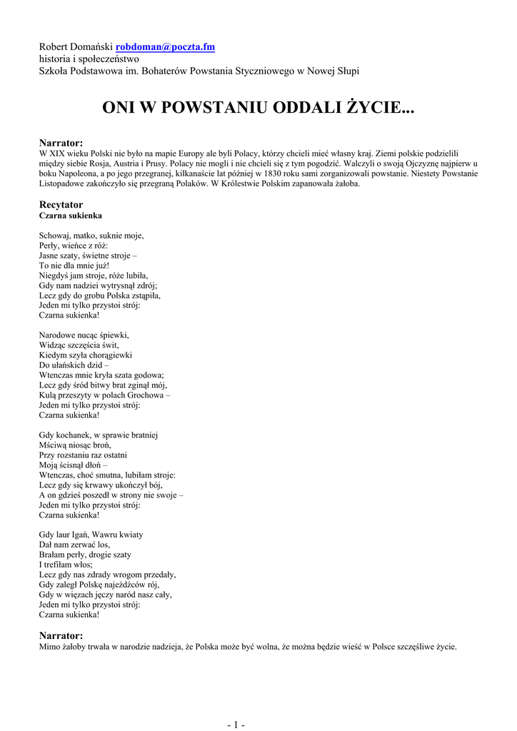 Robert Domański [email protected] historia i społeczeństwo Szkoła Podstawowa im. Bohaterów Powstania Styczniowego w Nowej Słupi ONI W POWSTANIU ODDALI ŻYCIE... Narrator: W XIX wieku Polski nie było na mapie Europy ale byli Polacy, którzy chcieli mieć własny kraj. Ziemi polskie podzielili między siebie Rosja, Austria i Prusy. Polacy nie mogli i nie chcieli się z tym pogodzić. Walczyli o swoją Ojczyznę najpierw u boku Napoleona, a po jego przegranej, kilkanaście lat później w 1830 roku sami zorganizowali powstanie. Niestety Powstanie Listopadowe zakończyło się przegraną Polaków. W Królestwie Polskim zapanowała żałoba. Recytator Czarna sukienka Schowaj, matko, suknie moje, Perły, wieńce z róż: Jasne szaty, świetne stroje – To nie dla mnie już! Niegdyś jam stroje, róże lubiła, Gdy nam nadziei wytrysnął zdrój; Lecz gdy do grobu Polska zstąpiła, Jeden mi tylko przystoi strój: Czarna sukienka! Narodowe nucąc śpiewki, Widząc szczęścia świt, Kiedym szyła chorągiewki Do ułańskich dzid – Wtenczas mnie kryła szata godowa; Lecz gdy śród bitwy brat zginął mój, Kulą przeszyty w polach Grochowa – Jeden mi tylko przystoi strój: Czarna sukienka! Gdy kochanek, w sprawie bratniej Mściwą niosąc broń, Przy rozstaniu raz ostatni Moją ścisnął dłoń – Wtenczas, choć smutna, lubiłam stroje: Lecz gdy się krwawy ukończył bój, A on gdzieś poszedł w strony nie swoje – Jeden mi tylko przystoi strój: Czarna sukienka! Gdy laur Igań, Wawru kwiaty Dał nam zerwać los, Brałam perły, drogie szaty I trefiłam włos; Lecz gdy nas zdrady wrogom przedały, Gdy zaległ Polskę najeźdźców rój, Gdy w więzach jęczy naród nasz cały, Jeden mi tylko przystoi strój: Czarna sukienka! Narrator: Mimo żałoby trwała w narodzie nadzieja, że Polska może być wolna, że można będzie wieść w Polsce szczęśliwe życie. -1- Recytator Kiedyż? Nam dzisiaj taj w duszach, jak kiedy się wiosna Z zimowej wyrywa niemocy: To smutek i żałość, to zorza radosna, To rozpacz, jak wicher północy. Ach! Kiedyż za Ciebie w bój skoczym spragnieni, O Polsko, ty matko miłości? I kiedyż przy huku dział, trzasku płomieni Podniesiem okrzyki wolności? I kiedyż uczynim, swobodni oracze, Lemiesze z pałaszy skrwawionych?... Ach! Kiedyż na ziemi już nikt nie zapłacze Prócz rosy pól naszych zielonych? Mieczysław Romanowski Narrator: Na początku lat 60-tych XIX wieku te nadzieje znalazły ujście. Zaczęło się od smutnej uroczystości – pogrzebu generałowej Sowińskiej, wdowy po bohaterze Powstania Listopadowego. O jej mężu generale Sowińskim Juliusz Słowacki pisał: Recytator Sowiński w okopach Woli W starym kościołku na Woli Został jenerał Sowiński, Starzec o drewnianej nodze. I wrogom się broni szpadą; A wokoło leżą wodze Batalionów i żołnierze, I potrzaskane harmaty, I gwery: wszystko stracone Jenerał się poddać nie chce, Ale się staruszek broni Oparłszy się na ołtarzu, Na białym Bożym obrusie, I tam łokieć położywszy, Kędy zwykle mszały kładą, Na lewej ołtarza stronie, Gdzie ksiądz Ewangelią czyta. Juliusz Słowacki Narrator: Pogrzeb generałowej rozpoczął serię masowych manifestacji patriotycznych, mszy za pomyślność Ojczyzny. Śpiewano pieśni patriotyczne. Między innymi i tę: Chór Boże cos Polskę, przez tak liczne wieki Otaczał blaskiem potęgi i chwały, Coś ją ochraniał tarczą swej opieki Od nieszczęść, które przygnębić ją miały Przed Twe ołtarze zanosim błaganie Ojczyznę, wolność, racz nam wrócić, Panie! Narrator: Władze rosyjskie odpowiedziały represjami, strzelano do manifestantów, byli zabici i rani. -2- Recytator Hymn polski Ojczyźnie naszej, Polsce, bądźmy wierni, Pokąd tchu w łonie! Stójmy wytrwale, gdy wieńce nam z cierni Kładą na skronie! Nieszczęścia i klęski niech miłość połamie! Czy dźwiga nas dola, czy chytrze nas skłamie, Ojczyźnie tej życie, krew nasza i ramię, I chwała w zgonie Tu groby ojców sława opromienia, Tu śpią ich kości. Tu nam się dobić po dniach utrapienia Świętej wolności. Tu przetrwać nam klęski i szarpać kajdany, Tu rodzą nas Sawy, Pułascy, Rejtany I „hetman w sukmanie”, co kochał sukmany – Tu żyć w miłości! Stójmyż gotowi, jak straż czuwająca, Bo nikt nie powie W który dzień trąba zawezwie nas grzmiąca Matce nieść zdrowie! A wonczas, jak piorun, co kruszy i pali, W bój lećmy zwyciężać z nadzieją na stali Lub gińmy Szlachetni, jak ojce konali – Polscy synowie! Mieczysław Romanowski Narrator: Coraz częściej w głowach młodych Polaków pojawiają się marzenia o walce z zaborcą. Recytator Do... Prośba o orła Sam krzyż? O, krzyża nie dawaj mi, siostro! Z pierwszeą jam jam marzeń i uczuć godziną Wziął krzyż i ciernie w sercu tkwiące ostro – Jak mi to brzemię cięży, wiesz, dziewczyno. A jeśli krzyż mi wyszyć chcesz koniecznie, Wyszyjże orła na odwrotnej stronie – Orła, co biały, a ku słońcu wiecznie Patrzy i trzyma miecz ostrzony w szponie. Dość już tych modłów bezczynnych dla Boga Walk nam nie wolno dla krzyża pomonąć! Jam ptak – od Boga szablę mam dla wroga; Mnie walczyć – w walce, patrząc w słońce ginąć! Mieczysław Romanowski -3- Narrator: Polscy patrioci, skupieni w organizacji „czerwonych” rozpoczęli przygotowania do powstania. Władze rosyjskie, aby powstrzymać wybuch powstania lub przynajmniej zmusić do walki w najmniej korzystnym dla powstańców terminie zarządziły brankę czyli przymusowy, imienny pobór do wojska. Do tej pory pobór do wojska odbywał się poprzez losowanie. Teraz wskazywano konkretne osoby o których wiedziano lub tylko podejrzewano, że są zaangażowane w przygotowania powstańcze. A służba wojskowa w armii carskiej trwała wówczas 25 lat Recytator Branka Branka! Branka! Gdzie syn w domu, Gdzie jedynak, gdzie brat drogi, Tam ich nocą ma wyłapać Moskwa – co do nogi. T