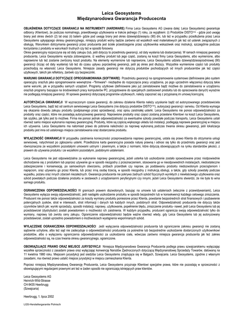 Leica Geosystems Międzynarodowa Gwarancja Producecnta