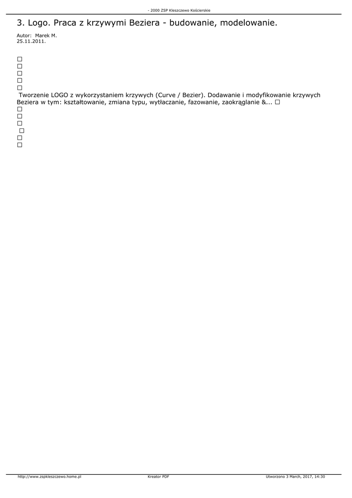 - 2000 ZSP Kleszczewo Kościerskie 3. Logo. Praca z krzywymi Beziera - budowanie, modelowanie. Autor: Marek M. 25.11.2011. Tworzenie LOGO z wykorzystaniem krzywych (Curve / Bezier). Dodawanie i modyfikowanie krzywych Beziera w tym: kształtowanie, zmiana typu, wytłaczanie, fazowanie, zaokrąglanie &... http://www.zspkleszczewo.home.pl Kreator PDF Utworzono 3 March, 2017, 14:30