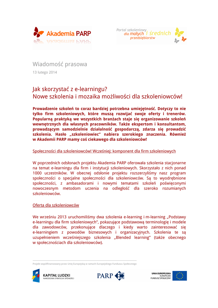 Wiadomość prasowa 13 lutego 2014 Jak skorzystać z e-learningu? Nowe szkolenia i mozaika możliwości dla szkoleniowców! Prowadzenie szkoleń to coraz bardziej potrzebna umiejętność. Dotyczy to nie tylko firm szkoleniowych, które muszą rozwijać swoje oferty i trenerów. Popularną praktyką we wszystkich branżach staje się organizowanie szkoleń wewnętrznych dla własnych pracowników. Także ekspertom i konsultantom, prowadzącym samodzielnie działalność gospodarczą, zdarza się prowadzić szkolenia. Hasło „szkoleniowiec” nabiera szerokiego znaczenia. Również w Akademii PARP mamy coś ciekawego dla szkoleniowców! Społeczności dla szkoleniowców! Wcześniej: komponent dla firm szkoleniowych W poprzednich odsłonach projektu Akademia PARP oferowała szkolenia stacjonarne na temat e-learningu dla firm i instytucji szkoleniowych. Skorzystało z nich ponad 1000 uczestników. W obecnej odsłonie projektu rozszerzyliśmy nasz program społeczności o specjalne społeczności dla szkoleniowców. Są to wyodrębnione społeczności, z ambasadorami i nowymi tematami szkoleń poświęconymi nowoczesnym metodom uczenia na odległość dla szeroko rozumianych szkoleniowców. Oferta dla szkoleniowców We wrześniu 2013 uruchomiliśmy dwa szkolenia e-learning i m-learning „Podstawy e-learningu dla firm szkoleniowych”, pokazujące podstawową terminologię i modele dla zawodowców, przekonujące dlaczego i kiedy warto zainteresować się e-learningiem z powodów biznesowych i organizacyjnych. Szkolenia te są uzupełnieniem wcześniejszego szkolenia „Blended learning” (także obecnego w społecznościach dla szkoleniowców). Projekt współfinansowany przez Unię Europejską w ramach Europejskiego Funduszu Społecznego Na przełomie 2013 i 2014 roku uruchomiliśmy aż cztery nowe szkolenia! To mozaika możliwości pokazująca logiczny proces korzystania z e-learningu: od podjęcia decyzji biznesowej o wejściu w e-learning, przez projektowanie szkoleń internetowych, realizację i przeprowadzanie oraz rozwijanie na własne potrzeby. Szkolenie e-learning „Treści szkolenia w formule on-line” pokazuje, w jaki sposób należy przygotować treści merytoryczne do szkoleń internetowych. Szkolenie blended learning „Tworzenie e-szkoleń na podstawie scenariuszy” w pierwszej części pokazuje, jak przygotować scenariusz szkolenia – niezbędny etap dydaktyczny, obejmujący projektowanie szkolenia i tzw. prace literaturowe. Wskazujemy jak ważną rolą w e-learningu jest metodyk. W drugiej części szkolenia pokazujemy jak wykonać wartościowe, interaktywne i multimedialne szkolenie. W dodatkowych zajęciach synchronicznych, tzw. webinariach, można dowiedzieć się więcej o tworzeniu scenariusza szkolenia e-learning oraz o wykorzystaniu scenariusza do opracowania szkolenia. Szkolenie e-learning „Szkolenie e-learningowe jako proces mentorski” dotyczy przeprowadzania szkoleń elektronicznych i wskazuje kluczową, na tym etapie, rolę opiekuna/mentora. Szkolenie blended learning „Budowanie szkoleń e-learningowych dla własnej organizacji” pokazuje różnice w podejściu do szkoleń elektronicznych tworzonych dla własnej organizacji i wstąpienie przez firmę w trudną rolę inwestora. W dodatkowych zajęciach synchronicznych – webinariach – można dowiedzieć się więcej o pisaniu scenariusza oraz tworzeniu gotowego szkolenia na potrzeby własnej organizacji. Webinaria – spotkania w wirtualnej klasie Webinarium to inaczej spotkanie synchroniczne, prowadzone w tzw. wirtualnej klasie, z wykorzystaniem czatu, wideoczatu, pokazu slajdów, tablicy, głosowań i wielu innych możliwości. Podobnie jak szkolenia asynchroniczne w lekcjach, webinaria odbywają się w sesjach. Do wirtualnej klasy można wejść w sesji planowej – z udziałem eksperta, w umówionym terminie - albo w sesji nieplanowej, Projekt współfinansowany przez Unię Europejską w ramach Europejskiego Funduszu Społecznego aby przymierzyć się do wirtualnej ławki, przeglądnąć „leżące na stołach” materiały, czy popisać po tablicy :) Informacja organizacyjna: pierwsze sesje planowe webinariów odbywających się w wirtualnej klasie, z udziałem eksperta, zostaną przeprowadzone na początku lutego 2014, w godzinach popołudniowych (od godziny 16:00). Następne sesje planowe będą organizowane co dwa miesiące. O dokładnym terminie zajęć synchronicznych poinformujemy indywidualnie osoby zapisane na odpowiednie szkolenia, z kilkudniowym wyprzedzeniem. Jednocześnie zachęcamy do wchodzenia do wirtualnej klasy na sesje nieplanowe – w dowolnym czasie i według własnego uznania. Pozwoli to na oswojenie się z możliwościami wirtualnej klasy i zapoznanie z zasobami pomocniczymi. Po sesjach planowych będzie też można zapoznać się z nagraniami przebiegu sesji. Co dalej? Zapraszamy do zapisania się od razu! Warto poszerzyć swoją wiedzę i umiejętności szkoleniowca o korzystanie z e-learningu. W niedalekiej przyszłości w społecznościach dla szkoleniowców znajdą się kolejne ciekawe nowości, jak narzędzie autorskie, do samodzielnego budowania i przeprowadzania prostych szkoleń tzw. rapid learning. Serdecznie zapraszamy! Szkolenia dotychczasowe Szkolenie e-learning „Podstawy e-learningu dla firm szkoleniowych” Szkolenie m-learning „Podstawy e-learningu dla firm szkoleniowych” Projekt współfinansowany przez Unię Europejską w ramach Europejskiego Funduszu Społecznego Szkolenia nowo uruchomione Szkolenie e-learning „Treści szkolenia w formule on-line” Szkolenie blended-learning „Tworzenie e-szkoleń na podstawie scenariuszy” Szkolenie e-learning „Szkolenie jako proces mentorski” e-learningowe Szkolenie blended-learning „Budowanie szkoleń e-learningowych dla własnej organizacji” kontakt: [email protected] Infolinia 0-801 444 MSP (czyli 0-801 444 677) Projekt współfinansowany przez Unię Europejską w ramach Europejskiego Funduszu 