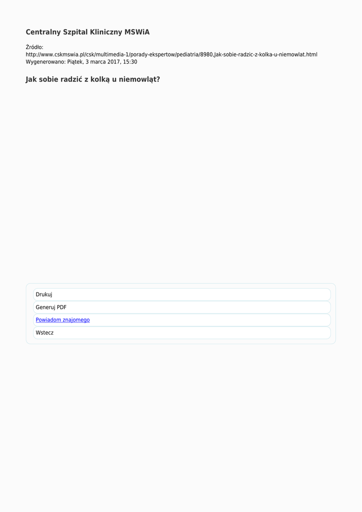 Centralny Szpital Kliniczny MSWiA Źródło: http://www.cskmswia.pl/csk/multimedia-1/porady-ekspertow/pediatria/8980,Jak-sobie-radzic-z-kolka-u-niemowlat.html Wygenerowano: Piątek, 3 marca 2017, 15:30 Jak sobie radzić z kolką u niemowląt? Drukuj Generuj PDF Powiadom znajomego Wstecz