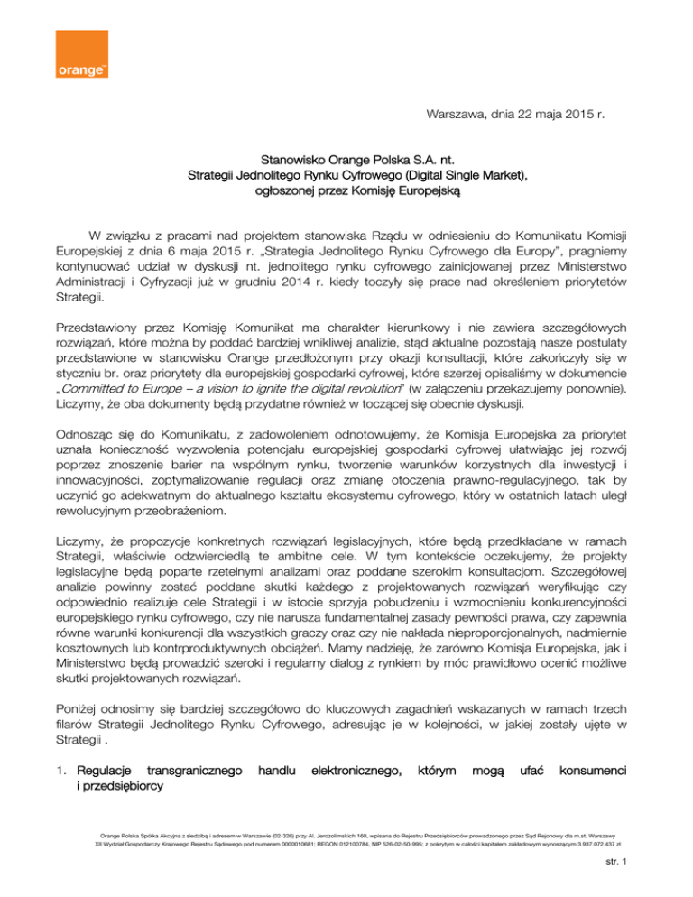 Warszawa, dnia 22 maja 2015 r. Stanowisko Orange Polska S.A. nt. Strategii Jednolitego Rynku Cyfrowego (Digital Single Market), ogłoszonej przez Komisję Europejską W związku z pracami nad projektem stanowiska Rządu w odniesieniu do Komunikatu Komisji Europejskiej z dnia 6 maja 2015 r. „Strategia Jednolitego Rynku Cyfrowego dla Europy”, pragniemy kontynuować udział w dyskusji nt. jednolitego rynku cyfrowego zainicjowanej przez Ministerstwo Administracji i Cyfryzacji już w grudniu 2014 r. kiedy toczyły się prace nad określeniem priorytetów Strategii. Przedstawiony przez Komisję Komunikat ma charakter kierunkowy i nie zawiera szczegółowych rozwiązań, które można by poddać bardziej wnikliwej analizie, stąd aktualne pozostają nasze postulaty przedstawione w stanowisku Orange przedłożonym przy okazji konsultacji, które zakończyły się w styczniu br. oraz priorytety dla europejskiej gospodarki cyfrowej, które szerzej opisaliśmy w dokumencie „Committed to Europe – a vision to ignite the digital revolution” (w załączeniu przekazujemy ponownie). Liczymy, że oba dokumenty będą przydatne również w toczącej się obecnie dyskusji. Odnosząc się do Komunikatu, z zadowoleniem odnotowujemy, że Komisja Europejska za priorytet uznała konieczność wyzwolenia potencjału europejskiej gospodarki cyfrowej ułatwiając jej rozwój poprzez znoszenie barier na wspólnym rynku, tworzenie warunków korzystnych dla inwestycji i innowacyjności, zoptymalizowanie regulacji oraz zmianę otoczenia prawno-regulacyjnego, tak by uczynić go adekwatnym do aktualnego kształtu ekosystemu cyfrowego, który w ostatnich latach uległ rewolucyjnym przeobrażeniom. Liczymy, że propozycje konkretnych rozwiązań legislacyjnych, które będą przedkładane w ramach Strategii, właściwie odzwierciedlą te ambitne cele. W tym kontekście oczekujemy, że projekty legislacyjne będą poparte rzetelnymi analizami oraz poddane szerokim konsultacjom. Szczegółowej analizie powinny zostać poddane skutki każdego z projektowanych rozwiązań weryfikując czy odpowiednio realizuje cele Strategii i w istocie sprzyja pobudzeniu i wzmocnieniu konkurencyjności europejskiego rynku cyfrowego, czy nie narusza fundamentalnej zasady pewności prawa, czy zapewnia równe warunki konkurencji dla wszystkich graczy oraz czy nie nakłada nieproporcjonalnych, nadmiernie kosztownych lub kontrproduktywnych obciążeń. Mamy nadzieję, że zarówno Komisja Europejska, jak i Ministerstwo będą prowadzić szeroki i regularny dialog z rynkiem by móc prawidłowo ocenić możliwe skutki projektowanych rozwiązań. Poniżej odnosimy się bardziej szczegółowo do kluczowych zagadnień wskazanych w ramach trzech filarów Strategii Jednolitego Rynku Cyfrowego, adresując je w kolejności, w jakiej zostały ujęte w Strategii . 1. Regulacje transgranicznego i przedsiębiorcy handlu elektronicznego, którym mogą ufać konsumenci Orange Polska Spółka Akcyjna z siedzibą i adresem w Warszawie (02-326) przy Al. Jerozolimskich 160, wpisana do Rejestru Przedsiębiorców prowadzonego przez Sąd Rejonowy dla m.st. Warszawy XII Wydział Gospodarczy Krajowego Rejestru Sądowego pod numerem 0000010681; REGON 012100784, NIP 526-02-50-995; z pokrytym w całości kapitałem zakładowym wynoszącym 3.937.072.437 zł str. 1 Jednym z kluczowych zagadnień w sprzedaży ponad granicami jest problem różnych praw konsumentów w poszczególnych krajach i różnych obowiązków przedsiębiorców. Sprzedaż poszczególnych usług dla konsumentów w każdym kraju UE może prowadzić do konieczności przygotowania wielu zestawów dokumentów, z których każdy opiera się na nieco innych obowiązkach informacyjnych, a dokumenty te musiałyby być dodatkowo sporządzane w wielu wersjach językowych. W związku z tym, potrzebna jest dalsza harmonizacja przepisów, przy uwzględnieniu właściwej relacji pomiędzy udogodnieniami dla klientów, a obowiązkami dla usługodawców. Wprowadzane udogodnienia i narzędzia ochrony interesów konsumentów, powinny być proporcjonalne do zidentyfikowanych problemów i oczekiwanych korzyści. Nie powinny stanowić nadmiernego, czy nieuzasadnionego obciążenia dla przedsiębiorców. Nadmierny formalizm, w tym nadmierne obowiązki informacyjne, zaczynają stanowić przesłankę zniechęcającą użytkowników wielu usług, którzy zaczynają poszukiwać rozwiązań poza rynkiem UE. Dotychczasowe działania legislacyjne powołujące się na harmonizację przepisów, doprowadziły w praktyce do zwiększenia katalogu informacji przekazywanych konsumentom, co z jednej strony często stwarza istotne trudności wdrożeniowe, skutkuje brakiem przejrzystości zapisów, a nierzadko również wywołuje niezadowolenie samych konsumentów. Tymczasem transgraniczny charakter usług świadczonych na rynku cyfrowym wymaga uproszczenia zakresu informacji przekazywanych konsumentom przy podpisywaniu umów. W tym kontekście, w ramach dążenia do uproszczenia kontaktów z konsumentem, a także mając na uwadze realizację założeń polityki niskoemisyjnej gospodarki, postulujemy, aby wprowadzane zmiany i narzędzia ochrony interesów konsumentów umożliwiały m.in. zastępowanie komunikacji papierowej komunikacją za pomocą środków elektronicznych. 2. Zapobieganie nieuzasadnionemu blokowaniu geograficznemu Kwestia geoblokowania dostępu do treści i usług cyfrowych, z punktu widzenia wspólnego rynku, na którym zapewniony jest swobodny przepływ towarów i usług jest istotną barierą rozwoju. Anachroniczna jest również rozbieżność między zasadami działania biznesu w światach off-line i on-line. Anachronizm ten jest niezrozumiały dla konsumentów, którzy oczekują swobodnego dostępu do treści i usług cyfrowych bez względu na to, w którym kraju UE mieszkają lub podróżują i z jakiego urządzenia końcowego korzystają do odbioru tychże treści. Aby jednak możliwe było odejście od prakt