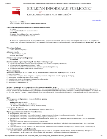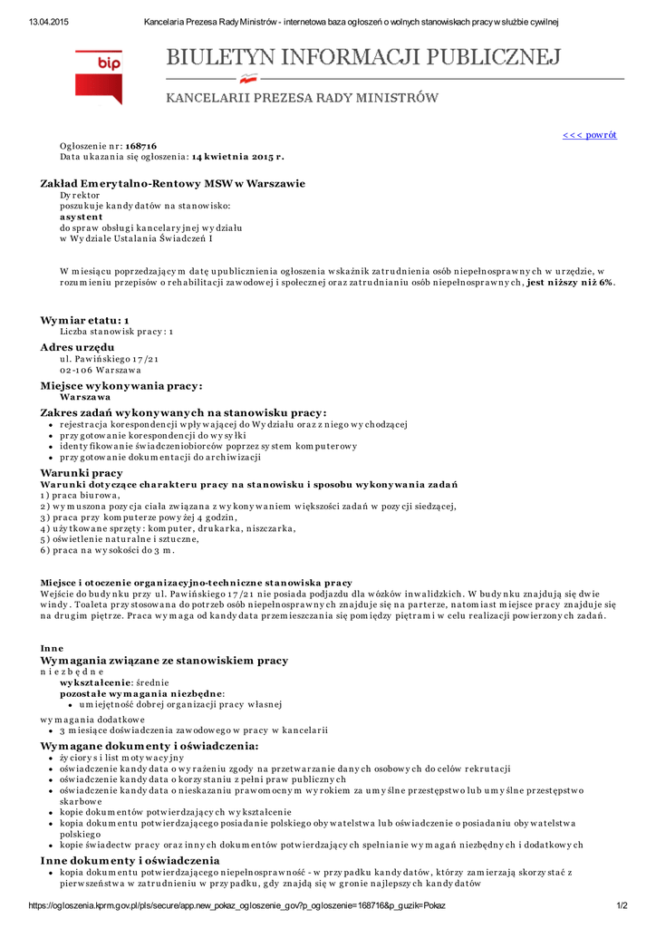 13.04.2015 Kancelaria Prezesa Rady Ministrów - internetowa baza ogłoszeń o wolnych stanowiskach pracy w służbie cywilnej < < < powrót Og łoszen ie n r : 168716 Da t a u k a za n ia się og łoszen ia : 14 kwi et n i a 2015 r . Zakład Em ery talno-Rentowy MSW w Warszawie Dy r ek t or poszu k u je k a n dy da t ów n a st a n ow isk o: a sy st en t do spr a w obsłu g i k a n cela r y jn ej w y dzia łu w W y dzia le Ust a la n ia Św ia dczeń I W m iesią cu popr zedza ją cy m da t ę u pu bliczn ien ia og łoszen ia w sk a żn ik za t r u dn ien ia osób n iepełn ospr a w n y ch w u r zędzie, w r ozu m ien iu pr zepisów o r eh a bilit a cji za w odow ej i społeczn ej or a z za t r u dn ia n iu osób n iepełn ospr a w n y ch , jest n i ższy n i ż 6% . Wy m iar etatu: 1 Liczba st a n ow isk pr a cy : 1 Adres urzędu u l. Pa w iń sk ieg o 1 7 /2 1 0 2 -1 0 6 W a r sza w a Miejsce wy kony wania pracy : Wa r sza wa Zakres zadań wy kony wany ch na stanowisku pracy : r ejest r a cja k or espon den cji w pły w a ją cej do W y dzia łu or a z z n ieg o w y ch odzą cej pr zy g ot ow a n ie k or espon den cji do w y sy łk i iden t y fik ow a n ie św ia dczen iobior ców popr zez sy st em k om pu t er ow y pr zy g ot ow a n ie dok u m en t a cji do a r ch iw iza cji Warunki pracy Wa r u n ki dot y czą ce ch a r a kt er u pr a cy n a st a n owi sku i sposobu wy kon y wa n i a za da ń 1 ) pr a ca biu r ow a , 2 ) w y m u szon a pozy cja cia ła zw ią za n a z w y k on y w a n iem w ięk szości za da ń w pozy cji siedzą cej, 3 ) pr a ca pr zy k om pu t er ze pow y żej 4 g odzin , 4 ) u ży t k ow a n e spr zęt y : k om pu t er , dr u k a r k a , n iszcza r k a , 5 ) ośw iet len ie n a t u r a ln e i szt u czn e, 6 ) pr a ca n a w y sok ości do 3 m . Mi ejsce i ot oczen i e or ga n i za cy jn o-t ech n i czn e st a n owi ska pr a cy W ejście do bu dy n k u pr zy u l. Pa w iń sk ieg o 1 7 /2 1 n ie posia da podja zdu dla w ózk ów in w a lidzk ich . W bu dy n k u zn a jdu ją się dw ie w in dy . T oa let a pr zy st osow a n a do pot r zeb osób n iepełn ospr a w n y ch zn a jdu je się n a pa r t er ze, n a t om ia st m iejsce pr a cy zn a jdu je się n a dr u g im pięt r ze. Pr a ca w y m a g a od k a n dy da t a pr zem ieszcza n ia się pom iędzy pięt r a m i w celu r ea liza cji pow ier zon y ch za da ń . In n e Wy m agania związane ze stanowiskiem pracy n iezbędn e wy kszt a ł cen i e: śr edn ie pozost a ł e wy m a ga n i a n i ezbędn e: u m iejęt n ość dobr ej or g a n iza cji pr a cy w ła sn ej w y m a g a n ia doda t k ow e 3 m iesią ce dośw ia dczen ia za w odow eg o w pr a cy w k a n cela r ii Wy m agane dokum enty i oświadczenia: ży cior y s i list m ot y w a cy jn y ośw ia dczen ie k a n dy da t a o w y r a żen iu zg ody n a pr zet w a r za n ie da n y ch osobow y ch do celów r ek r u t a cji ośw ia dczen ie k a n dy da t a o k or zy st a n iu z pełn i pr a w pu bliczn y ch ośw ia dczen ie k a n dy da t a o n iesk a za n iu pr a w om ocn y m w y r ok iem za u m y śln e pr zest ępst w o lu b u m y śln e pr zest ępst w o sk a r bow e k opie dok u m en t ów pot w ier dza ją cy ch w y k szt a łcen ie k opia dok u m en t u pot w ier dza ją ceg o posia da n ie polsk ieg o oby w a t elst w a lu b ośw ia dczen ie o posia da n iu oby w a t elst w a polsk ieg o k opie św ia dect w pr a cy or a z in n y ch dok u m en t ów pot w ier dza ją cy ch spełn ia n ie w y m a g a ń n iezbędn y ch i doda t k ow y ch Inne dokum enty i oświadczenia k opia dok u m en t u pot w ier dza ją ceg o n iepełn ospr a w n ość - w pr zy pa dk u k a n dy da t ów , k t ór zy za m ier za ją sk or zy st a ć z pier w szeń st w a w za t r u dn ien iu w pr zy pa dk u , g dy zn a jdą się w g r on ie n a jlepszy ch k a n dy da t ów https://ogloszenia.kprm.gov.pl/pls/secure/app.new_pokaz_ogloszenie_gov?p_ogloszenie=168716&p_guzik=Pokaz 1/2 13.04.2015 Kancelaria Prezesa Rady Ministrów - internetowa baza ogłoszeń o wolnych stanowiskach pracy w służbie cywilnej T erm in składania dokum entów: 2 4 -0 4 -2 0 1 5 Miejsce składania dokum entów: Za k ła d Em er y t a ln o-Ren t ow y Min ist er st w a Spr a w W ew n ęt r zn y ch u l. Pa w iń sk ieg o 1 7 /2 1 0 2 -1 0 6 W a r sza w a Inne inform acje: Pr osim y o za m ieszczen ie n u m er u og łoszen ia 1 6 8 1 7 6 w liście m ot y w a cy jn y m or a z n a k oper cie. W zw ią zk u z pow ia da m ia n iem k a n dy da t ów o t er m in a ch k olejn y ch et a pów n a bor u dr og ą m a ilow ą , pr osim y o poda n ie w CV a dr esu m a ilow eg o. W y m a g a n e ośw ia dczen ia pr osim y sk ła da ć zg odn ie ze w zor em za m ieszczon y m n a st r on ie BIP ZER w za k ła dce Pr a ca w ZER MSW > Dok u m en t y do pobr a n ia ( h t t p://w w w .zer .bip.m sw .g ov .pl/zer /pr a ca -w -zer -m sw /dok u m en t y -do-pobr a n ia /5 1 2 3 ,Osw ia dczen ie-k a n dy da t a .h t m l ). Ośw ia dczen ia m u szą by ć w ła sn or ęczn ie podpisa n e. W er y fik a cja spełn ia n ia pr zez k a n dy da t ów w y m a g a ń for m a ln y ch dok on a n a zost a n ie n a podst a w ie dok u m en t ów w y m ien ion y ch w części „ w y m a g a n e dok u m en t y i ośw ia dczen ia ” . W zw ią zk u z t y m in for m u jem y , że a plik a cje k om plet n e t o t a k ie, k t ór e za w ier a ją w szy st k ie w y m a g a n e dok u m en t y i w ła sn or ęczn ie podpisa n e ośw ia dczen ia . Za dok u m en t y złożon e w t er m in ie, u w a ża się dok u m en t y n a da n e w u r zędzie poczt ow y m n a jpóźn iej w ost a t n im w sk a za n y m w og łoszen iu dn iu (decy du je da t a st em pla poczt ow eg o). Odr zu con e dok u m en t y a plik a cy jn e zost a n ą k om isy jn e zn iszczon e. Za ch ęca m y osoby n iepełn ospr a w n e do pr zesy ła n ia sw oich dok u m en t ów a plik a cy jn y ch (z u w zg lędn ien iem in for m a cji dot y czą cy ch m iejsca i ot oczen ia or g a n iza cy jn o-t e