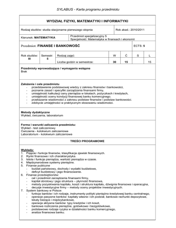 SYLABUS - Karta programu przedmiotu WYDZIAŁ FIZYKI, MATEMATYKI I INFORMATYKI Rodzaj studiów: studia stacjonarne pierwszego stopnia Rok akad.: 2010/2011 Przedmiot specjalizacyjny 5 Specjalność: Matematyka w finansach i ekonomii Kierunek: MATEMATYKA Przedmiot: FINANSE I BANKOWOŚĆ Rok studiów: III Semestr: 5 ECTS: 5 Rodzaj zajęć: W Ć Liczba godzin w semestrze: 30 15 S L 15 Przedmioty wprowadzające / wymagania wstępne Brak Założenia i cele przedmiotu - przedstawienie podstawowej wiedzy z zakresu finansów i bankowości, - poznanie zasad i specyfiki zarządzania finansami firmy, - umiejętność kalkulacji ceny pieniądza w lokatach, pożyczkach i kredytach, - umiejętność oceny kondycji finansowej banku komercyjnego. - przekazanie wiadomości z zakresu podstaw finansów i podstaw bankowości. - zdobycie umiejętności w praktycznym stosowaniu wiadomości. Metody dydaktyczne Wykład, ćwiczenia, laboratorium Forma i warunki zaliczenia przedmiotu: Wykład - test zaliczeniowy Ćwiczenia - kolokwium zaliczeniowe Laboratorium - kolokwium zaliczeniowe TREŚCI PROGRAMOWE Wykłady: 1. Pojęcie i funkcje finansów, klasyfikacja zjawisk finansowych. 2. Rynki finansowe i ich charakterystyka. 3. Istota i funkcje pieniądza, wartość pieniądza w czasie. 4. Międzynarodowe systemy pieniężne. 5. Finanse publiczne - budżet państwowy, dochody i wydatki budżetowe, - deficyt budżetowy i jego finansowanie. 6. Finanse przedsiębiorstw: - cel i przedmiot zarządzania finansami firmy, - kapitał obrotowy i jego struktura – płynność finansowa, - metody pozyskiwania kapitału, koszt i struktura kapitału, dźwignia finansowa i operacyjna, - decyzje inwestycyjne firmy – metody oceny projektów inwestycyjnych. 7. System bankowy w Polsce: - funkcje banków i ich rodzaje, instrumenty polityki pieniężno-kredytowej banku centralnego, - operacje pasywne banków: kapitały własne i ich podział, bankowe rachunki depozytowe, lokaty bieżące i międzybankowe, - operacje aktywne banków: typy kredytów i ich koszt, - bankowe rozliczenia pieniężne, gotówkowe i bezgotówkowe, - podstawowe rodzaje ryzyka w działalności banku komercyjnego, - analiza finansowa banku. Ćwiczenia audytoryjne 1. Wartość pieniądza w czasie. 2. Prównywalność stóp procentowych (nominalna i realna stopa procentowa). 3. Źródła pozyskiwania kapitałów, kształtowanie struktury kapitałów. Przeciętny cykl obrotu. Cykl brutto kapitału obrotowego. 4. Faktoring, refaktoring, forfaiting. 5. System bankowy. Organizacja i funkcje banków. 6. Produkty bankowe. Opłacalność lokat bankowych. 7. Operacje aktywne i pasywne banków. 8. Rozwój sieci bankowej. Specjalizacja banków. Laboratorium: 1. Zastosowanie tablic odsetkowych w finansach. 2. Zastosowanie tablic dyskontowych. 3. Zarządzanie zapasami, należnościami, zasobami gotówkowymi. 4. Wybór przedsiębiorstwa między leasingiem a kredytem. 5. Analiza sytuacji finansowej przedsiębiorstwa na podstawie sprawozdań finansowych. 6. Koszt i spłata kredytu. 7. Lokaty bankowe. Wykaz literatury podstawowej: [1] Z. Dobosiewicz , Wprowadzenie do finansów i bankowości, PWN, Warszawa 2005 [2] F. S. Mishkin, Ekonomika pieniądza, bankowości i rynków finansowych, PWN, Warszawa 2002 [3] J. Czekaj, Z. Dresler, Podstawy zarządzania finansami firm, PWN, Warszawa 1998 [4] W. Dębski, Rynek finansowy i jego mechanizmy. Podstawy teorii i praktyki, Warszawa 2005 [5] D. Korenik, S. Korenik, Podstawy finansów, Warszawa 2004 [6] W. Bień, A. Bień, Kalkulacja ceny pieniądza w lokatach, pożyczkach i kredytach, Warszawa 2002 [7] W. L. Jaworski, Z. Zawadzka, Bankowość. Zagadnienia podstawowe, Warszawa 2005 [8] Z. Dobosiewicz, K. Marton-Gadoś, Podstawy bankowości z zadaniami, Warszawa 2005 Wykaz literatury uzupełniającej: Osoba(y) odpowiedzialna(e) za przedmiot: dr Barbara KARCZ Zatwierdził: dr Teresa WINIARSKA, prof. PK