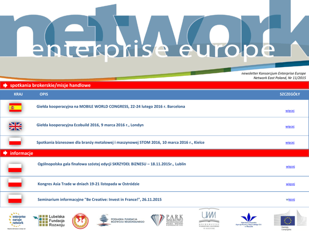 newsletter Konsorcjum Enterprise Europe Network East Poland, Nr 11/2015 spotkania brokerskie/misje handlowe KRAJ OPIS SZCZEGÓŁY Giełda kooperacyjna na MOBILE WORLD CONGRESS, 22-24 lutego 2016 r. Barcelona więcej Giełda kooperacyjna Ecobuild 2016, 9 marca 2016 r., Londyn więcej Spotkania biznesowe dla branży metalowej i maszynowej STOM 2016, 10 marca 2016 r., Kielce więcej informacje Ogólnopolska gala finałowa szóstej edycji SKRZYDEŁ BIZNESU – 18.11.2015r., Lublin więcej Kongres Asia Trade w dniach 19-21 listopada w Ostródzie więcej Seminarium informacyjne "Be Creative: Invest in France!", 26.11.2015 więcej 11 newsletter Konsorcjum Enterprise Europe Network East Poland, Nr 11/2015 oferty zagraniczne biznesowe KRAJ OPIS Turecki Instytut Badań specjalizujący się w produkcji nanomateriałów dla wielu sektorów przemysłowych szuka porozumienia produkcyjnego. Grecka firma z sektora MŚP, z ponad 10-letnim doświadczeniem w świadczeniu usług doradczych dla sektora rolno-spożywczego, opracowała nowe technologie w swoich usługach. Firma świadczy usługi doradcze od uprawy do produkcji, pakowania i eksportu. Firma chce nawiązać współpracę z firmą/organizacją/konsorcjum w celu wymiany swojej technologii w oparciu o umowę o świadczenie usług. Francuska firma produkuje etui na smartfony używając specyficznej żywicy. Żywica ta wzmacnia brzmienie etui. Firma poszukuje umów o dystrybucję na swoich produkowanych we Francji etui. Wśród partnerów mogą być dystrybutorzy pracujący ze znanymi markami, ale również firmy zainteresowane posiadaniem spersonalizowanych etui na smartfony, w celu poprawienia swojego wizerunku. Pochodzący z Korei Południowej start-up opracowujący system komunikacji bezprzewodowej, oferuje bramkę IoT i zewnętrzny punkt dostępu wi-fi dla usług IoT (Internet rzeczy). Firma poszukuje dostawców usług mobilnych/internetowych, twórców aplikacji IoT itp. zainteresowanych możliwością zawarcia umowy o świadczenie usług. Zlokalizowana w Brazylii firma oferuje klientom na całym świecie szeroki zakres usług w zakresie różnych rozwiązań transportowych - morskich, kolejowych, drogowych i lotniczych we wszystkich kierunkach w Europie, dla różnych branż. Firma specjalizuje się w transporcie międzynarodowym artykułów żywnościowych, ze szczególnym uwzględnieniem produktów nietrwałych. Angielska firma z sektora MŚP specjalizująca się w produkcji i dostawie wysokiej jakości, wodooszczędnego sprzętu przeciwpożarowego i nowatorskich technologii poszukuje dystrybutorów dla swojej gamy innowacyjnego, przyjaznego środowisku sprzętu przeciwpożarowego. Firma oferuje produkty gaśnicze, które zapewniają bezpieczeństwo przeciwpożarowe i oszczędność wody. Firma oferuje umowę o usługi dystrybucji. NR REF. BRTR20140806001 BOGR20150623001 BOFR20150807002 BOKR20151001001 BOBR20141010001 BOUK20150922002 2 newsletter Konsorcjum Enterprise Europe Network East Poland, Nr 11/2015 oferty zagraniczne biznesowe KRAJ Francuska firma jest małą międzynarodową firmą handlową specjalizującą się w imporcie-eksporcie dóbr szybko zbywalnych, takich jak żywność i produkty spożywcze, jak również napoje alkoholowe i niealkoholowe. Firma chciałaby zwiększyć swój udział w globalnym rynku. Aby to osiągnąć poszukuje umów o dystrybucję z firmami pracującymi w przemyśle rolno-spożywczym. Rumuńska firma aktywnie funkcjonująca w sferze doradztwa i projektowania technicznych systemów antywłamaniowych oferuje usługi doradcze w zakresie systemów antywłamaniowych i analizy ryzyka bezpieczeństwa fizycznego. Firma poszukuje zagranicznych partnerów zainteresowanych dostępem do rynku rumuńskiego i znalezieniem usługodawcy we wspomnianym sektorze. Zlokalizowane w Wielkiej Brytanii MŚP poszukuje przedstawicieli handlowych do dystrybuowania swojego produktu na rynkach zagranicznych. Firma oferuje zintegrowany produkt na potrzeby ukompatybilnienia wieloletniego sprzętu obronnego - głównie ładunków szturmowych typu powietrzeziemia, do użytku z systemami lotniczymi nowoczesnych samolotów. Technologia została opracowana dla ładunków powietrznych sowieckiego oznaczenia FAB lub bombom ogólnego zastosowania. Niemiecka firma projektująca, produkująca i sprzedająca sprzęt do placów zabaw od ponad 40 lat, charakteryzująca się placami typu "żywe", rozpoznawalne, dzięki połączeniu zastosowania rozłożystej sieci lin i kreatywnych pomysłów, poszukuje przedstawicieli handlowych oraz dystrybutorów w Polsce. Większość oferowanych usług i produktów zdobyła krajowe i zagraniczne nagrody, a posiadanie patentów na większość propozycji daje dowód na oryginalność i przewagę technologiczną. OPIS BOFR20150911001 BORO20150608001 BOUK20151011001 BODE20151022001 NR REF. Francuska firma specjalizująca się w rozwiązaniach zarządzaniem bateriami litowymi poszukuje dystrybutora, przedstawiciela handlowego w krajach europejskich na zasadzie komercyjnej umowy agencyjnej lub umowie o dystrybucji. BOFR20150723001 Wiodący dostawca usług strumieniowego przesyłania muzyki i cyfrowych aplikacji audiowizualnych w Grecji, a także opracowała platformę muzyczną, która może służyć do zarządzania muzyką w takich miejscach jak hotele, restauracje, supermarkety, centra handlowe, siłownie, statki pasażerskie itd., a także na potrzeby indywidualne. Firma poszukuje partnerów na zasadzie umowy licencyjnej, lub innych mogących reprezentować jej usługi na swoich terytoriach, jako przedstawiciele w ramach przedstawicielskiej umowy licencyjnej. BOGR20150406001 5 newsletter Konsorcjum Enterprise Europe Network East Poland, Nr 11/2015 oferty zagraniczne biznesowe Szwedzka firma poszukuje producenta organicznego, bezglutenowego, sypkiego makaronu o różnym kształcie. Poszukiwany partner powinien być zainteresowany produkcją makaronu z alternatywnych surowców, takich jak różnego rodzaju rośli