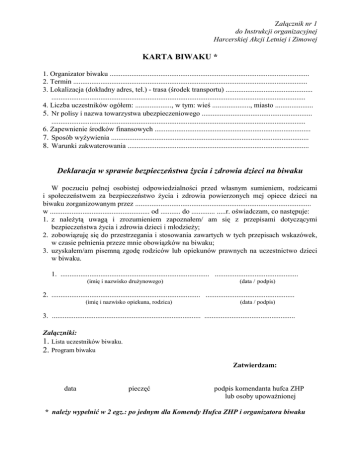 Załącznik nr 1 do Instrukcji organizacyjnej Harcerskiej Akcji Letniej i Zimowej KARTA BIWAKU * 1. Organizator biwaku .............................................................................................................. 2. Termin ................................................................................................................................. 3. Lokalizacja (dokładny adres, tel.) - trasa (środek transportu) ................................................ ............................................................................................................................................ 4. Liczba uczestników ogółem: ...................., w tym: wieś ....................., miasto ..................... 5. Nr polisy i nazwa towarzystwa ubezpieczeniowego ............................................................. ............................................................................................................................................ 6. Zapewnienie środków finansowych ...................................................................................... 7. Sposób wyżywienia ............................................................................................................. 8. Warunki zakwaterowania .................................................................................................... Deklaracja w sprawie bezpieczeństwa życia i zdrowia dzieci na biwaku W poczuciu pełnej osobistej odpowiedzialności przed własnym sumieniem, rodzicami i społeczeństwem za bezpieczeństwo życia i zdrowia powierzonych mej opiece dzieci na biwaku zorganizowanym przez ................................................................................................. w ....................................................... od ........... do ............. .....r. oświadczam, co następuje: 1. z należytą uwagą i zrozumieniem zapoznałem/ am się z przepisami dotyczącymi bezpieczeństwa życia i zdrowia dzieci i młodzieży; 2. zobowiązuję się do przestrzegania i stosowania zawartych w tych przepisach wskazówek, w czasie pełnienia przeze mnie obowiązków na biwaku; 3. uzyskałem/am pisemną zgodę rodziców lub opiekunów prawnych na uczestnictwo dzieci w biwaku. 1. .................................................................................. .............................................. (imię i nazwisko drużynowego) (data / podpis) 2. .................................................................................. ................................................. (imię i nazwisko opiekuna, rodzica) (data / podpis) 3. .................................................................................. .................................................. Załączniki: 1. Lista uczestników biwaku. 2. Program biwaku Zatwierdzam: data pieczęć podpis komendanta hufca ZHP lub osoby upoważnionej * należy wypełnić w 2 egz.: po jednym dla Komendy Hufca ZHP i organizatora biwaku