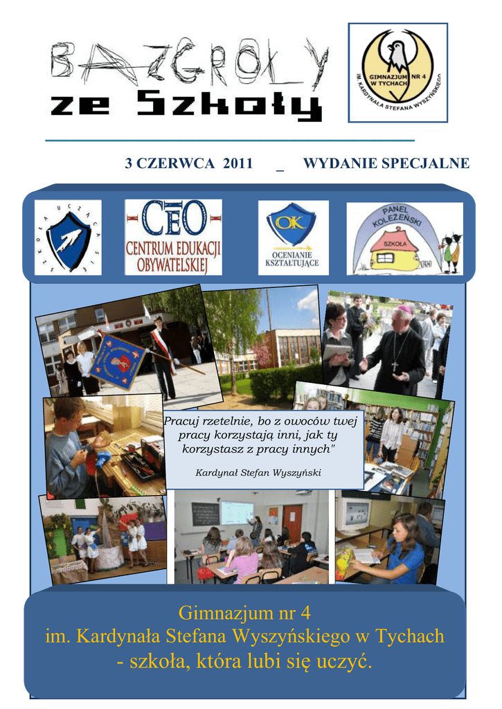_______________________________________________________ 3 CZERWCA 2011 _ WYDANIE SPECJALNE "Pracuj rzetelnie, bo z owoców twej pracy korzystają inni, jak ty korzystasz z pracy innych" Kardynał Stefan Wyszyński Gimnazjum nr 4 im. Kardynała Stefana Wyszyńskiego w Tychach 1 - szkoła, która lubi się uczyć. Jak uczyliśmy się Oceniania Kształtującego? Ideą Oceniania Kształtującego zaraziła nas pani dyrektor Mirosława Gawlik. Na jednej z konferencji zapoznała nas z głównymi zasadami tego systemu i zaproponowała przystąpienie do projektu przygotowanego przez Centrum Edukacji Obywatelskiej i Polsko-Amerykańską Fundację Wolności. Rok szkolny 2008/2009 zapoczątkował prace, rozpoczęliśmy realizację I modułu SUS-OK zatytułowanego „Ocenianie kształtujące – teoria i praktyka”. Liderzy przeszli coachingowy kurs internetowy, a czego się nauczyli, przekazywali radzie pedagogicznej. Funkcję liderów pełniły panie: Małgorzata Sułecka-Czyż, Izabela Markiewicz-Kastelik, Anna Kozak. Raz w miesiącu otrzymywały one do wykonania określone zadanie i w tym zakresie się szkoliły. Liderki dostawały także materiały dla rady pedagogicznej i systematycznie szkoliły swoje koleżanki i kolegów. Do ich obowiązków należało pisanie sprawozdań i przesyłanie ich drogą internetową. Pani Bożena Skwarczyńska we wrześniu 2008 roku brała udział w szkoleniu „Dobra praktyka w zarządzaniu szkołą”. Pani dyrektor Mirosława Gawlik Gawlik uczestniczyła w dwudniowej konferencji „Dobra praktyka w zarządzaniu szkołą”. Poznawane metody organizowania pracy szkoły były na bieżąco wdrażane. Tym sposobem nauczyliśmy się określać cele lekcji i formułować je w języku zrozumiałym dla ucznia, ustalać wraz z uczniami kryteria oceniania, rozróżniać funkcje oceny sumującej i kształtującej, budować atmosferę uczenia się, pracując z uczniami i z rodzicami, formułować pytania kluczowe, zadawać pytania angażujące ucznia w lekcję, stosować efektywną informację zwrotną, wprowadzać samoocenę i ocenę koleżeńską. Szkolenia sprawiły, że nauczyciele zmienili metody nauczania na bardziej efektywne. Poprawiła się jakość współpracy między nauczycielami. W roku 2009/2010 przystąpiliśmy do II modułu programu SUS , czyli - Szkoła Ucząca się. Na tym etapie poznawaliśmy procedury SUS. Pani Anna Borowska i Aleksandra Zając przeszły szkolenie „Procedura SUS w szkole: profil szkoły w ramach SUS-OK”. Pozyskaną tam wiedzę przekazywały radzie pedagogicznej. Przygotowywaliśmy się też do ewaluacji wewnętrznej. Posłużyliśmy się metodą Profilu szkoły , który okazał się bardzo pomocny przy określaniu słabych i mocnych stron gimnazjum. W pracy tej uczestniczyli uczniowie, nauczyciele, rodzice i pracownicy obsługi. W ramach tego modułu pani Małgorzata Sułecka-Czyż przeszła szkolenie internetowe: „Jak motywować uczniów do nauki”, a następnie przeszkoliła w tym zakresie radę pedagogiczną. Natomiast pani Dorota Baron skorzystała ze szkolenia „Jak wykorzystywać wyniki egzaminu”. Przez cały czas pracowały dwa zespoły zadaniowe. W skład pierwszego wchodziły: Małgorzata SułeckaCzyż (lider), Aleksandra Zając, Bożena Skwarczyńska, Joanna Maturska, Izabela Markiewicz-Kastelik, w drugim pracowały: Małgorzata Musz (lider) oraz Bożena Święs, Edyta Goc, Anna Borowska, Grażyna Gierek, Danuta Pasich, Regina Lipecka, Tomasz Lutostański. Panie A. Borowska i G. Gierek zostały później zastąpione przez Kingę Skowrońską i Annę Kozak. Zespoły wyznaczyły sobie następujące cele: 1) Wszyscy nauczyciele we wszystkich klasach podają cele lekcji w języku zrozumiałym dla ucznia i NACOBEZU do sprawdzianu. 2) Szkoła prowadzi działania zmierzające do osiągnięcia przez uczniów coraz lepszych wyników z egzaminów zewnętrznych. Etap ten pomógł nam przygotować się do zdobycia tytułu „Szkoły Uczącej się”. W bieżącym roku szkolnym zostały sporządzone raporty z realizacji obu celów. Ustalony został stan początkowy i końcowy. Efekty naszej pracy zostaną przedstawione 3 czerwca na odbywającym się w naszej szkole – Panelu Koleżeńskim. Panel koleżeński uznaliśmy za bardzo ważne wydarzenie w naszej szkole. Przystąpiliśmy do przygotowań z dużym zapałem. Korzystaliśmy tu także z doświadczeń innych szkół , gdyż gościnnie uczestniczyliśmy w panelach koleżeńskich Szkoły Podstawowej nr 11 w Będzinie, Szkoły Podstawowej nr 6 w Tychach, Szkoły Podstawowej nr 3 w Tychach. Natomiast panie: Mirosława Gawlik, Małgorzata Musz, Małgorzata Sułecka-Czyż, brały udział w szkoleniu „Przygotowanie do panelu koleżeńskiego”. Po wielu miesiącach uczenia się, współpracy w realizacji zadań możemy stwierdzić, że wielką zasługą projektu jest przekonanie nauczycieli, jak ważną sprawą jest to, iż uczniowie wiedzą dokładnie, czego nauczą się na lekcji, czego się będzie od nich oczekiwać, co muszą zrobić, aby otrzymać wymarzoną ocenę. Nie ma już miejsca na przypadek, niedomówienia, pomyłki. Nie jest już łatwo powiedzieć uczniowi: „nie wiedziałam/łem , że to będzie na sprawdzianie”. W przypadku naszej szkoły jest to tym bardziej trudne, że korzystamy z platformy edukacyjnej „Librusa” i wszystkie NACOBEZU do sprawdzianów tam się pojawiają. Nawet uczeń nieobecny w szkole ma możliwość śledzenia na bieżąco, co się dzieje w szkole, na co musi być przygotowany. Nauczyciele muszą sobie dobrze przemyśleć każdą lekcję, jakie cele wyznaczyć, czego mogą od klasy czy konkretnego ucznia wymagać. Można chyba powiedzieć, że szkolnej pracy towarzyszy większy namysł. Bardziej też dbamy o przepływ informacji zwrotnych, co sprawia, że zarówno uczniowie jak nauczyciele mogą czuć większą motywację do różnego rodzaju działań sprzyjających ich rozwojowi. Uczniowie zaczynają uświadamiać sobie, jak wiele 