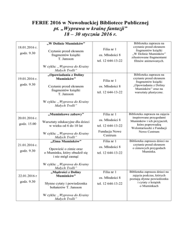 FERIE 2016 w Nowohuckiej Bibliotece Publicznej pt. „Wyprawa w krainę fantazji” 18 – 30 stycznia 2016 r. „W Dolinie Muminków” 18.01.2016 r. godz. 9.30 19.01.2016 r. godz. 9.30 Czytanie przed ekranem fragmentów książki T. Jansson W cyklu: „Wyprawa do Krainy Małych Trolli” „Opowiadania z Doliny Muminków” Czytanie przed ekranem fragmentów książki T. Jansson Filia nr 1 os. Młodości 8 tel. 12 644-13-22 Filia nr 1 os. Młodości 8 tel. 12 644-13-22 Biblioteka zaprasza na czytanie przed ekranem fragmentów książki „W Dolinie Muminków” zilustrowane fragmentami filmów animowanych. Biblioteka zaprasza na czytanie przed ekranem fragmentów książki „Opowiadania z Doliny Muminków” oraz na warsztaty plastyczne. W cyklu: „Wyprawa do Krainy Małych Trolli” „Muminkowe zabawy” 20.01.2016 r. godz. 15.00 Warsztaty edukacyjne dla dzieci w wieku od 6 do 10 lat W cyklu: „Wyprawa do Krainy Małych Trolli” „Zima Muminków” 21.01.2016 r. godz. 9.30 22.01.2016 r godz. 9.30 Opowieść o zimie oraz o Muminku, który obudził się i nie mógł zasnąć W cyklu: „Wyprawa do Krainy Małych Trolli” „Mądrości z Doliny Muminków” Słynne cytaty i powiedzonka bohaterów T. Jansson W cyklu: „Wyprawa do Krainy Małych Trolli” Filia nr 1 os. Młodości 8 tel. 12 644-13-22 Fundacja Nowe Centrum Filia nr 1 os. Młodości 8 tel. 12 644-13-22 Filia nr 1 os. Młodości 8 tel. 12 644-13-22 Biblioteka zaprasza na zajęcia inspirowane przygodami Muminków i ich przyjaciół, które poprowadzą Wolontariuszki z Fundacji Nowe Centrum Biblioteka zaprasza dzieci na czytanie przed ekranem o zimowych przygodach Muminka. Biblioteka zaprasza dzieci na zajęcia podczas, których poznają słynne powiedzonka i cytaty z książek o Muminkach 18.01.2016 r. „Czy naprawdę znamy Puchatka?” godz. 10.30 Warsztaty literackie Filia nr 2 os. Teatralne 25 tel. 12 644-40-46 W cyklu: „W Stumilowym Lesie” 19.01.2016 r. godz. 10.30 20.01.2016 r. godz. 10.30 „Brykamy! Czyli jak wymyślać Stumilowe zabawy” Filia nr 2 os. Teatralne 25 Gry i zabawy kształtujące wyobraźnię tel. 12 644-40-46 W cyklu: „W Stumilowym Lesie” „Puchatek i inni, czyli misie w Stumilowym Lesie” Filia nr 2 Bajki o misiach, które warto czytać os. Teatralne 25 tel. 12 644-40-46 W cyklu: „W Stumilowym Lesie” 21.01.2016 r. godz. 10.30 22.01.2016 r. godz. 10.30 „Zaczarowane miejsce, czyli wierszykarnia” Filia nr 2 os. Teatralne 25 Zabawy słowami, piosenki i wyliczanki tel. 12 644-40-46 W cyklu: „W Stumilowym Lesie” „Poohquiz, czyli mieszkamy w Stumilowym Lesie” Filia nr 2 Zagadki, gry i zabawy teatralne os. Teatralne 25 tel. 12 644-40-46 W cyklu: „W Stumilowym Lesie” „W magicznej szafie” 18.01.2016 r. godz. 13.00 Warsztaty plastyczno-literackie dla dzieci W cyklu: „Tydzień w Narnii” „Podwieczorek u Tumnusa” 19.01.2016 r. godz. 13.00 Zajęcia plastyczno-literackie dla dzieci Filia nr 3 os. Kościuszkowskie 5 tel. 12 648-79-46 Filia nr 3 os. Kościuszkowskie 5 Biblioteka zaprasza przedszkolaki i uczniów klas I-III na cykl animacji literackich opracowanych na kanwie książek A. A. Milne o Kubusiu Puchatku oraz wierszy z tomiku „Mam już 6 lat” Biblioteka zaprasza dzieci w wieku 6-10 lat na zajęcia rozwijające kreatywność. Historyjki z życia Puchatka będą kanwa gier i zabaw kształtujących wyobraźnię. Biblioteka zaprasza na zajęcia literackie. Dzieci poznają bajki, których bohaterami są misie, dowiedzą się, czy te postaci są do siebie podobne? Dlaczego są lubiane? Czy Misie czasem odwiedzają domy? Biblioteka zaprasza do wspólnej zabawy słowami. Podczas zajęć dzieci podejmą próby stworzenia własnych piosenek i wyliczanek. Biblioteka zaprasza na spotkanie, które wypełnią zagadki i zabawy. Dzieci będą miały możliwość bawić się w teatr i wcielić w wybraną postać ze Stumilowego Lasu. Filia 3 zaprasza dzieci na wspólną wyprawę do krainy stworzonej przez C. S. Lewisa – Narnii. Wykorzystując tekturę, szyszki, farby i watę stworzą baśniową krainę, która znajduje się za drzwiami starej szafy… Filia nr 3 zaprasza dzieci na kolejne spotkanie podczas, którego podjadając słodkie ciastka i pijąc owocową herbatę, wysłuchają opowieści o przygodach małej 20.01.2016 r. godz. 13.00 21.01.2016 r. godz. 13.00 22.01.2016 r. godz. 13.00 W cyklu: „Tydzień w Narnii” tel. 12 648-79-46 Łucji i wspólnie stworzą portret Fauna Tumnusa. „Lodowy pałac” Filia nr 3 Biblioteka zaprasza dzieci na warsztaty, podczas których będą mogły twórczo i pożytecznie spędzić wolny czas. Wykorzystując niekonwencjonalne materiały plastyczne stworzony zostanie Pałac Złej Królowej. Warsztaty artystyczne dla dzieci 5 W cyklu: „Tydzień w Narnii” tel. 12 648-79-46 „Obiad u …” Filia nr 3 Gry i zabawy literackie dla dzieci W cyklu: „Tydzień w Narnii” tel. 12 648-79-46 „Nadejście wiosny” Filia nr 3 Zagadki i quizy os. Kościuszkowskie 5 W cyklu: „Tydzień w Narnii” tel. 12 648-79-46 „W szkole czarodziejów” Filia nr 8 O zwyczajach niezwyczajnych magów W cyklu: „Witajcie w Hogwarcie” „Eliksiry profesora Snape’a” 19.01.2016 r. godz. 12.00 os. Kościuszkowskie 5 18.01.2016 r. godz. 10.30 os. Kościuszkowskie Magiczne mikstury z bibliotecznego laboratorium os. Boh. Września 26 tel. 12 645-95-27 Filia nr 8 os. Boh. Września 26 tel. 12 645-95-27 20.01.2016 r. godz. 12.00 W cyklu: „Witajcie w Hogwarcie” „Czy znasz Harry’ego Pottera?” Quiz dla mugoli Filia nr 8 os. Boh. Września 26 Biblioteka zaprasza na zajęcia podczas których dzieci poznają kolejne przygody rodzeństwa Pevensie w magicznym lesie, a układając i kolorując puzzle, dowiedzą się kim są dziwne stworzenia z „porośniętą futrem twarzą” i „długimi wąsami”, u których odbył się obiad. Biblioteka zaprasza dzieci na zajęcia, podczas których będą mogły twórczo spędzić wolny czas. Podczas spotkan