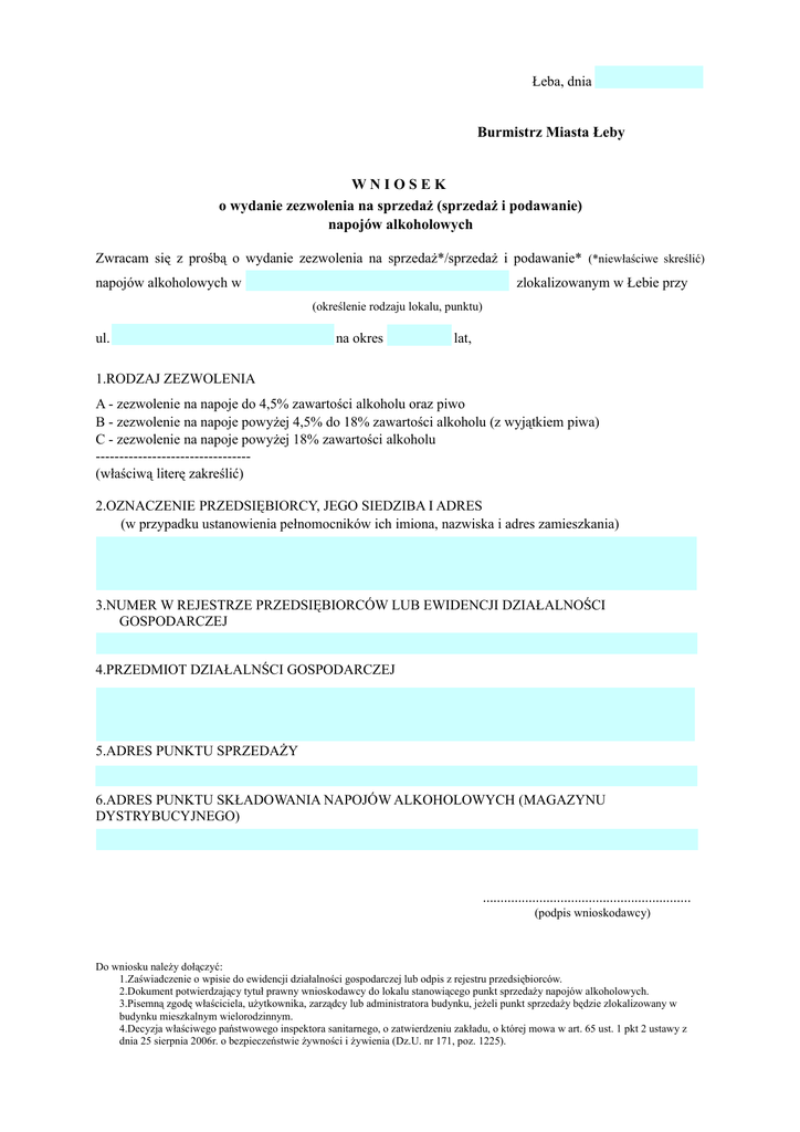 Łeba, dnia Burmistrz Miasta Łeby WNIOSEK o wydanie zezwolenia na sprzedaż (sprzedaż i podawanie) napojów alkoholowych Zwracam się z prośbą o wydanie zezwolenia na sprzedaż*/sprzedaż i podawanie* (*niewłaściwe skreślić) napojów alkoholowych w zlokalizowanym w Łebie przy (określenie rodzaju lokalu, punktu) ul. na okres lat, 1.RODZAJ ZEZWOLENIA A - zezwolenie na napoje do 4,5% zawartości alkoholu oraz piwo B - zezwolenie na napoje powyżej 4,5% do 18% zawartości alkoholu (z wyjątkiem piwa) C - zezwolenie na napoje powyżej 18% zawartości alkoholu --------------------------------(właściwą literę zakreślić) 2.OZNACZENIE PRZEDSIĘBIORCY, JEGO SIEDZIBA I ADRES (w przypadku ustanowienia pełnomocników ich imiona, nazwiska i adres zamieszkania) 3.NUMER W REJESTRZE PRZEDSIĘBIORCÓW LUB EWIDENCJI DZIAŁALNOŚCI GOSPODARCZEJ 4.PRZEDMIOT DZIAŁALNŚCI GOSPODARCZEJ 5.ADRES PUNKTU SPRZEDAŻY 6.ADRES PUNKTU SKŁADOWANIA NAPOJÓW ALKOHOLOWYCH (MAGAZYNU DYSTRYBUCYJNEGO) ........................................................... (podpis wnioskodawcy) Do wniosku należy dołączyć: 1.Zaświadczenie o wpisie do ewidencji działalności gospodarczej lub odpis z rejestru przedsiębiorców. 2.Dokument potwierdzający tytuł prawny wnioskodawcy do lokalu stanowiącego punkt sprzedaży napojów alkoholowych. 3.Pisemną zgodę właściciela, użytkownika, zarządcy lub administratora budynku, jeżeli punkt sprzedaży będzie zlokalizowany w budynku mieszkalnym wielorodzinnym. 4.Decyzja właściwego państwowego inspektora sanitarnego, o zatwierdzeniu zakładu, o której mowa w art. 65 ust. 1 pkt 2 ustawy z dnia 25 sierpnia 2006r. o bezpieczeństwie żywności i żywienia (Dz.U. nr 171, poz. 1225).