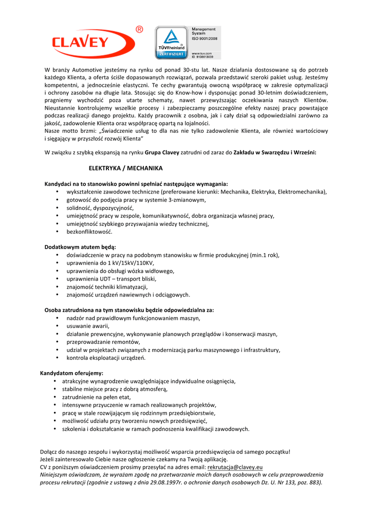 W branży Automotive jesteśmy na rynku od ponad 30-stu lat. Nasze działania dostosowane są do potrzeb każdegoKlienta,aofertaściśledopasowanychrozwiązań,pozwalaprzedstawićszerokipakietusług.Jesteśmy kompetentni, a jednocześnie elastyczni. Te cechy gwarantują owocną współpracę w zakresie optymalizacji i ochrony zasobów na długie lata. Stosując się do Know-how i dysponując ponad 30-letnim doświadczeniem, pragniemy wychodzić poza utarte schematy, nawet przewyższając oczekiwania naszych Klientów. Nieustannie kontrolujemy wszelkie procesy i zabezpieczamy poszczególne efekty naszej pracy powstające podczas realizacji danego projektu. Każdy pracownik z osobna, jak i cały dział są odpowiedzialni zarówno za jakość,zadowolenieKlientaorazwspółpracęopartąnalojalności. Nasze motto brzmi: „Świadczenie usług to dla nas nie tylko zadowolenie Klienta, ale również wartościowy isięgającywprzyszłośćrozwójKlienta” WzwiązkuzszybkąekspansjąnarynkuGrupaClaveyzatrudniodzarazdoZakładuwSwarzędzuiWrześni: ELEKTRYKA/MECHANIKA Kandydacinatostanowiskopowinnispełniaćnastępującewymagania: • wykształceniezawodowetechniczne(preferowanekierunki:Mechanika,Elektryka,Elektromechanika), • gotowośćdopodjęciapracywsystemie3-zmianowym, • solidność,dyspozycyjność, • umiejętnośćpracywzespole,komunikatywność,dobraorganizacjawłasnejpracy, • umiejętnośćszybkiegoprzyswajaniawiedzytechnicznej, • bezkonfliktowość. Dodatkowymatutembędą: • doświadczeniewpracynapodobnymstanowiskuwfirmieprodukcyjnej(min.1rok), • uprawnieniado1kV/15kV/110KV, • uprawnieniadoobsługiwózkawidłowego, • uprawnieniaUDT–transportbliski, • znajomośćtechnikiklimatyzacji, • znajomośćurządzeńnawiewnychiodciągowych. Osobazatrudnionanatymstanowiskubędzieodpowiedzialnaza: • nadzórnadprawidłowymfunkcjonowaniemmaszyn, • usuwanieawarii, • działanieprewencyjne,wykonywanieplanowychprzeglądówikonserwacjimaszyn, • przeprowadzanieremontów, • udziałwprojektachzwiązanychzmodernizacjąparkumaszynowegoiinfrastruktury, • kontrolaeksploatacjiurządzeń. Kandydatomoferujemy: • atrakcyjnewynagrodzenieuwzględniająceindywidualneosiągnięcia, • stabilnemiejscepracyzdobrąatmosferą, • zatrudnienienapełenetat, • intensywneprzyuczeniewramachrealizowanychprojektów, • pracęwstalerozwijającymsięrodzinnymprzedsiębiorstwie, • możliwośćudziałuprzytworzeniunowychprzedsięwzięć, • szkoleniaidokształcaniewramachpodnoszeniakwalifikacjizawodowych. Dołączdonaszegozespołuiwykorzystajmożliwośćwsparciaprzedsięwzięciaodsamegopoczątku! JeżelizainteresowałoCiebienaszeogłoszenieczekamynaTwojąaplikację. CVzponiższymoświadczeniemprosimyprzesyłaćnaadresemail:[email protected] Niniejszymoświadczam,żewyrażamzgodęnaprzetwarzaniemoichdanychosobowychwceluprzeprowadzenia procesurekrutacji(zgodniezustawązdnia29.08.1997r.oochroniedanychosobowychDz.U.Nr133,poz.883).