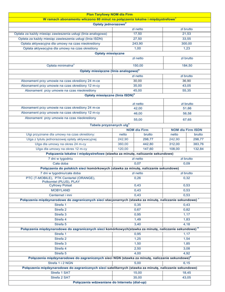 Plan Taryfowy NOM dla Firm W ramach abonamentu