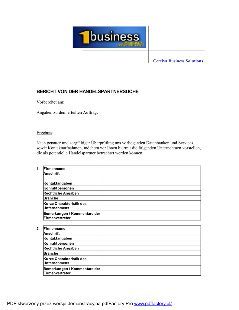 Certiva Business Solutions BERICHT VON DER HANDELSPARTNERSUCHE Vorbereitet am: Angaben zu dem erteilten Auftrag: Ergebnis: Nach genauer und sorgfältiger Überprüfung uns vorliegenden Datenbanken und Services, sowie Kontaktaufnahmen, möchten wir Ihnen hiermit die folgenden Unternehmen vorstellen, die als potentielle Handelspartner betrachtet werden können: 1. Firmenname Anschrift Kontaktangaben Konraktpersonen Rechtliche Angaben Branche Kurze Charakteristik des Unternehmens Bemerkungen / Kommentare der Firmenvertreter 2. Firmenname Anschrift Kontaktangaben Konraktpersonen Rechtliche Angaben Branche Kurze Charakteristik des Unternehmens Bemerkungen / Kommentare der Firmenvertreter PDF stworzony przez wersję demonstracyjną pdfFactory Pro www.pdffactory.pl/ 3. Firmenname Anschrift Kontaktangaben Konraktpersonen Rechtliche Angaben Branche Kurze Charakteristik des Unternehmens Bemerkungen / Kommentare der Firmenvertreter 4. Firmenname Anschrift Kontaktangaben Konraktpersonen Rechtliche Angaben Branche Kurze Charakteristik des Unternehmens Bemerkungen / Kommentare der Firmenvertreter 5. Firmenname Anschrift Kontaktangaben Konraktpersonen Rechtliche Angaben Branche Kurze Charakteristik des Unternehmens Bemerkungen / Kommentare der Firmenvertreter 6. Firmenname Anschrift Kontaktangaben Konraktpersonen Rechtliche Angaben Branche Kurze Charakteristik des Unternehmens Bemerkungen / Kommentare der Firmenvertreter PDF stworzony przez wersję demonstracyjną pdfFactory Pro www.pdffactory.pl/ Certiva Business Solutions ul. Ryzowa 44-287, 02-495 Warszawa, PL Tel. +48 22 396 67 52, Fax +48 22 43 58 677, Email: [email protected] NIP 966-091-30-59, REGON 052225520 PDF stworzony przez wersję demonstracyjną pdfFactory Pro www.pdffactory.pl/