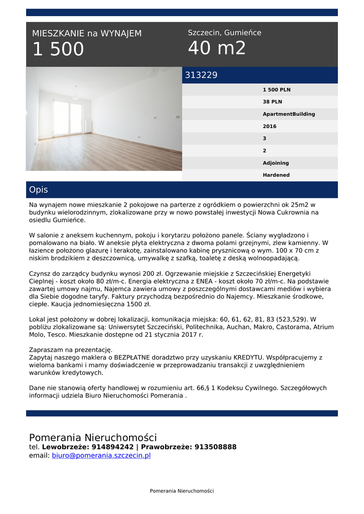Szczecin, Gumieńce MIESZKANIE na WYNAJEM 40 m2 1 500 313229 1 500 PLN 38 PLN ApartmentBuilding 2016 3 2 Adjoining Hardened Opis Na wynajem nowe mieszkanie 2 pokojowe na parterze z ogródkiem o powierzchni ok 25m2 w budynku wielorodzinnym, zlokalizowane przy w nowo powstałej inwestycji Nowa Cukrownia na osiedlu Gumieńce. W salonie z aneksem kuchennym, pokoju i korytarzu położono panele. Ściany wygładzono i pomalowano na biało. W aneksie płyta elektryczna z dwoma polami grzejnymi, zlew kamienny. W łazience położono glazurę i terakotę, zainstalowano kabinę prysznicową o wym. 100 x 70 cm z niskim brodzikiem z deszczownicą, umywalkę z szafką, toaletę z deską wolnoopadającą. Czynsz do zarządcy budynku wynosi 200 zł. Ogrzewanie miejskie z Szczecińskiej Energetyki Cieplnej - koszt około 80 zł/m-c. Energia elektryczna z ENEA - koszt około 70 zł/m-c. Na podstawie zawartej umowy najmu, Najemca zawiera umowy z poszczególnymi dostawcami mediów i wybiera dla Siebie dogodne taryfy. Faktury przychodzą bezpośrednio do Najemcy. Mieszkanie środkowe, ciepłe. Kaucja jednomiesięczna 1500 zł. Lokal jest położony w dobrej lokalizacji, komunikacja miejska: 60, 61, 62, 81, 83 (523,529). W pobliżu zlokalizowane są: Uniwersytet Szczeciński, Politechnika, Auchan, Makro, Castorama, Atrium Molo, Tesco. Mieszkanie dostępne od 21 stycznia 2017 r. Zapraszam na prezentację. Zapytaj naszego maklera o BEZPŁATNE doradztwo przy uzyskaniu KREDYTU. Współpracujemy z wieloma bankami i mamy doświadczenie w przeprowadzaniu transakcji z uwzględnieniem warunków kredytowych. Dane nie stanowią oferty handlowej w rozumieniu art. 66,§ 1 Kodeksu Cywilnego. Szczegółowych informacji udziela Biuro Nieruchomości Pomerania . Pomerania Nieruchomości tel. Lewobrzeże: 914894242 | Prawobrzeże: 913508888 email: [email protected] Pomerania Nieruchomości Pomerania Nieruchomości Powered by TCPDF (www.tcpdf.org)