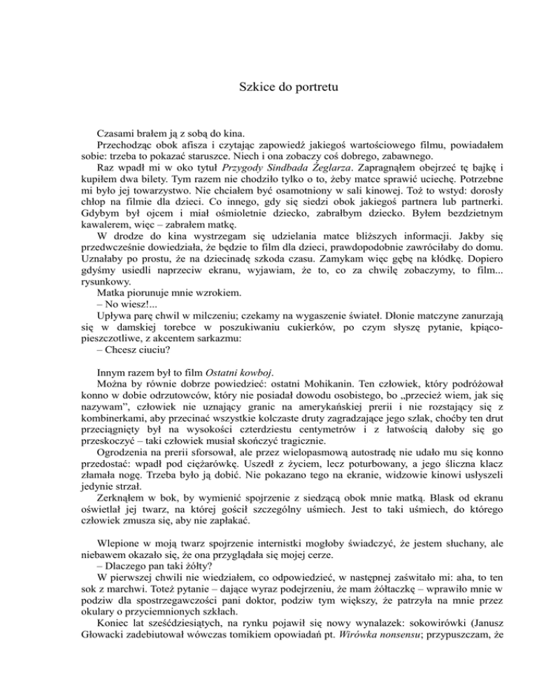 Szkice do portretu Czasami brałem ją z sobą do kina. Przechodząc obok afisza i czytając zapowiedź jakiegoś wartościowego filmu, powiadałem sobie: trzeba to pokazać staruszce. Niech i ona zobaczy coś dobrego, zabawnego. Raz wpadł mi w oko tytuł Przygody Sindbada Żeglarza. Zapragnąłem obejrzeć tę bajkę i kupiłem dwa bilety. Tym razem nie chodziło tylko o to, żeby matce sprawić uciechę. Potrzebne mi było jej towarzystwo. Nie chciałem być osamotniony w sali kinowej. Toż to wstyd: dorosły chłop na filmie dla dzieci. Co innego, gdy się siedzi obok jakiegoś partnera lub partnerki. Gdybym był ojcem i miał ośmioletnie dziecko, zabrałbym dziecko. Byłem bezdzietnym kawalerem, więc – zabrałem matkę. W drodze do kina wystrzegam się udzielania matce bliższych informacji. Jakby się przedwcześnie dowiedziała, że będzie to film dla dzieci, prawdopodobnie zawróciłaby do domu. Uznałaby po prostu, że na dziecinadę szkoda czasu. Zamykam więc gębę na kłódkę. Dopiero gdyśmy usiedli naprzeciw ekranu, wyjawiam, że to, co za chwilę zobaczymy, to film... rysunkowy. Matka piorunuje mnie wzrokiem. – No wiesz!... Upływa parę chwil w milczeniu; czekamy na wygaszenie świateł. Dłonie matczyne zanurzają się w damskiej torebce w poszukiwaniu cukierków, po czym słyszę pytanie, kpiącopieszczotliwe, z akcentem sarkazmu: – Chcesz ciuciu? Innym razem był to film Ostatni kowboj. Można by równie dobrze powiedzieć: ostatni Mohikanin. Ten człowiek, który podróżował konno w dobie odrzutowców, który nie posiadał dowodu osobistego, bo „przecież wiem, jak się nazywam”, człowiek nie uznający granic na amerykańskiej prerii i nie rozstający się z kombinerkami, aby przecinać wszystkie kolczaste druty zagradzające jego szlak, choćby ten drut przeciągnięty był na wysokości czterdziestu centymetrów i z łatwością dałoby się go przeskoczyć – taki człowiek musiał skończyć tragicznie. Ogrodzenia na prerii sforsował, ale przez wielopasmową autostradę nie udało mu się konno przedostać: wpadł pod ciężarówkę. Uszedł z życiem, lecz poturbowany, a jego śliczna klacz złamała nogę. Trzeba było ją dobić. Nie pokazano tego na ekranie, widzowie kinowi usłyszeli jedynie strzał. Zerknąłem w bok, by wymienić spojrzenie z siedzącą obok mnie matką. Blask od ekranu oświetlał jej twarz, na której gościł szczególny uśmiech. Jest to taki uśmiech, do którego człowiek zmusza się, aby nie zapłakać. Wlepione w moją twarz spojrzenie internistki mogłoby świadczyć, że jestem słuchany, ale niebawem okazało się, że ona przyglądała się mojej cerze. – Dlaczego pan taki żółty? W pierwszej chwili nie wiedziałem, co odpowiedzieć, w następnej zaświtało mi: aha, to ten sok z marchwi. Toteż pytanie – dające wyraz podejrzeniu, że mam żółtaczkę – wprawiło mnie w podziw dla spostrzegawczości pani doktor, podziw tym większy, że patrzyła na mnie przez okulary o przyciemnionych szkłach. Koniec lat sześćdziesiątych, na rynku pojawił się nowy wynalazek: sokowirówki (Janusz Głowacki zadebiutował wówczas tomikiem opowiadań pt. Wirówka nonsensu; przypuszczam, że na wybór takiego właśnie tytułu nie bez wpływu były owe nowości na ladach sklepów Argedu) i wyposażenie domowych gospodarstw wzbogaciło się o nowe utensylia. Matka zaczęła mi codziennie przyrządzać szklankę soku z marchwi. Troskliwość? Tak, ale może także bawiło ją takie pompowanie zdrowia w swoje dwudziestokilkuletnie dziecko. Miasto-ogród, wille wśród drzew, śnieg błyszczący w słońcu. Zatrzymaliśmy się na pustej ulicy, matka i ja. Stoimy w odległości piętnastu metrów od siebie, ot taka przerwa podczas spaceru. Bo i nie ma dokąd się śpieszyć. Pośpiech zbędny. Pięknie tu dookoła, stoimy zatem, rozglądamy się. Pożeramy wzrokiem na wpół leśny, słoneczny pejzaż zimowy. Ulicą przebiegł olbrzymi pies i w biegu otarł się niemal o matkę. Znikł. Uśmiecham się do swojej rodzicielki. Jeszcze przed chwilą wyobrażała sobie, że grozi jej niebezpieczeństwo, a teraz już wie, że nie było się czego bać. Gdy pies zbliżał się do niej, zachowała spokój, nie okazała strachu. A po zniknięciu psa postarała się nie okazać tej ulgi, jaką niewątpliwie odczuła. I stoi z miną „jakby nigdy nic”. Bawi mnie widok matczynej twarzy, więc patrzę na nią z gębą roześmianą od ucha do ucha. Ruszamy w dalszą drogę, ja na przedzie, matka parę metrów za mną. Widzi mnie od tyłu, zwraca uwagę na wystające spod palta nogawki spodni. Słońce i śnieg sprawiają, że widoczność w owym dniu jest wspaniała, toteż matka dostrzega u mnie coś, co zwykle umyka ludzkim oczom, coś, czego ja sam nie dostrzegłem u siebie. Otóż moje spodnie są już tak sfatygowane, że łydki przeświecają przez wytartą wełnianą tkaninę. Matka znajduje okazję, by się skwitować; przedtem ja śmiałem się z niej, teraz ona ze mnie. Ot dziad, łachmaniarz, obdartus. Matka wyśmiewa mnie bez najmniejszego skrępowania. Toć nie ma ona do czynienia z prawdziwym nędzarzem i zbyteczna tu jest jakakolwiek oględność. Toć jeszcze dzisiaj, po powrocie ze spaceru, mogę zajrzeć do naszej szafy i z zabranym stamtąd kuponem materiału udać się do krawca. Z tym kuponem, który ona, z myślą o swoim synu, nabyła. Niekiedy nachodziły ją wspomnienia i czuła chętkę opowiedzenia mi o czymś, na przykład o wakacjach na wsi, gdy opowiadająca miała 10 lat. Wiejskie powietrze tak dobrze na nią podziałało, tak wzmogło apetyt, że chuchro z dnia na dzień przybierało na wadze i ciotka musiała swojej podopiecznej poszerzać sukienki. W owych czasach nie istniała powszechna walka z nadwagą, nie znana była obsesja permanentnego odchudzania się; o osobie zażywnej mówiło się, że „dobrze wygląda”. Kłopoty z garderobą to nie jedyne, co zostało w pamięci. Poza tym – 