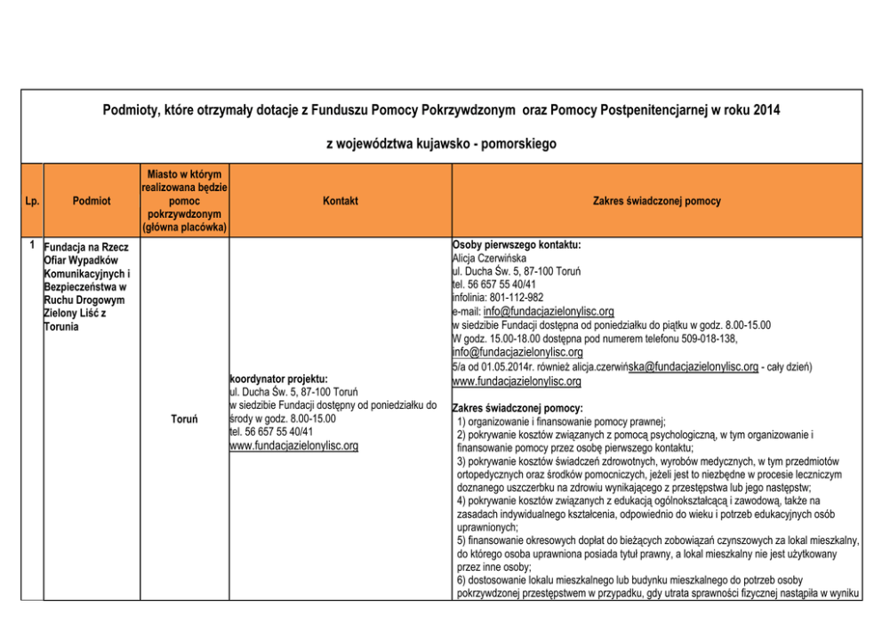 Podmioty, które otrzymały dotacje z Funduszu Pomocy Pokrzywdzonym oraz Pomocy Postpenitencjarnej w roku 2014 z województwa kujawsko - pomorskiego Lp. Podmiot Miasto w którym realizowana będzie pomoc pokrzywdzonym (główna placówka) Kontakt 1 Fundacja na Rzecz Ofiar Wypadków Komunikacyjnych i Bezpieczeństwa w Ruchu Drogowym Zielony Liść z Torunia Zakres świadczonej pomocy Osoby pierwszego kontaktu: Alicja Czerwińska ul. Ducha Św. 5, 87-100 Toruń tel. 56 657 55 40/41 infolinia: 801-112-982 e-mail: [email protected] w siedzibie Fundacji dostępna od poniedziałku do piątku w godz. 8.00-15.00 W godz. 15.00-18.00 dostępna pod numerem telefonu 509-018-138, [email protected] Toruń koordynator projektu: ul. Ducha Św. 5, 87-100 Toruń w siedzibie Fundacji dostępny od poniedziałku do środy w godz. 8.00-15.00 tel. 56 657 55 40/41 www.fundacjazielonylisc.org 5/a od 01.05.2014r. również alicja.czerwiń[email protected] - cały dzień) www.fundacjazielonylisc.org Zakres świadczonej pomocy: 1) organizowanie i finansowanie pomocy prawnej; 2) pokrywanie kosztów związanych z pomocą psychologiczną, w tym organizowanie i finansowanie pomocy przez osobę pierwszego kontaktu; 3) pokrywanie kosztów świadczeń zdrowotnych, wyrobów medycznych, w tym przedmiotów ortopedycznych oraz środków pomocniczych, jeżeli jest to niezbędne w procesie leczniczym doznanego uszczerbku na zdrowiu wynikającego z przestępstwa lub jego następstw; 4) pokrywanie kosztów związanych z edukacją ogólnokształcącą i zawodową, także na zasadach indywidualnego kształcenia, odpowiednio do wieku i potrzeb edukacyjnych osób uprawnionych; 5) finansowanie okresowych dopłat do bieżących zobowiązań czynszowych za lokal mieszkalny, do którego osoba uprawniona posiada tytuł prawny, a lokal mieszkalny nie jest użytkowany przez inne osoby; 6) dostosowanie lokalu mieszkalnego lub budynku mieszkalnego do potrzeb osoby pokrzywdzonej przestępstwem w przypadku, gdy utrata sprawności fizycznej nastąpiła w wyniku przestępstwa; 7) finansowanie przejazdów środkami komunikacji publicznej lub pokrywanie kosztów transportu związanych z uzyskiwaniem świadczeń i regulowaniem spraw określonych w pkt 1–7; 2 Terenowy Komitet Ochrony Praw Dziecka z Inowrocławia Inowrocław Koordynator projektu: poniedziałek – piątek godz. 8.00-12.00 Tel. 52 355 93 40 ul. Dworcowa 11 88-100 Inowrocław e-mail: [email protected] Osoby pierwszego kontaktu: Joanna Cicha Agnieszka Miklas poniedziałek-piątek godz. 8.00 – 18.00 tel. 52 355 93 40 ul. Dworcowa 11 88-100 Inowrocław e-mail: [email protected] (cały dzień) Dyżury specjalistów - Inowrocław Poniedziałek 15.00-18.00 Psycholog Wtorek 8.45-10.45 Psycholog 15.00-18.00 Prawnik Środa 8.45-9.45 Psycholog 11.00-14.00 Psycholog Grupa wsparcia 16.00-19.00 Czwartek 15.00-18.00 Prawnik 15.00-16.00 Mediator Piątek 15.00-18.00 Psycholog Punkty Pomocy dla Osób Pokrzywdzonych Przestępstwem: Jeziora Wielkie 36 Urząd Gminy zapisy osobiście lub pod nr tel. 52 318 72 20 wew.13 (pn-pt 7.30 – 15.30) Wtorek 10.00 – 13.00 Psycholog grupa wsparcia 13.00 – 15.00 Środa 14.00-17.00 Prawnik (co 2 tygodnie) Żnin ul. Gnieźnieńska 7 zapisy pod nr tel. 52 30 207 47 lub osobiście w godz. 8.00 – 16.00 (pn-pt) Czwartek (co 2 tygodnie naprzemiennie) Psycholog 15.00 – 18.00 Prawnik 15.00 – 18.00 Rojewo siedziba GOK zapisy osobiście lub pod nr tel. 533 322 504 pn-pt 7.30-15.30 Środa 15.00 – 18.00 Psycholog Piątek 16.00 – 19.00 Prawnik Miejsko-Gminny Ośrodek Pomocy Społecznej w Kruszwicy 88-150 Kruszwica ul. Rybacka 22 pok. 105 tel. stacjonarny 52 351 54 89 w. 105 Dyżur stacjonarny prawnika: poniedziałek w godz.16-19 Dyżur stacjonarny psychologa: środa w godz. 15,00-18,00 Sicienko ul. Bydgoska 6 siedziba ITK zapisy osobiście lub pod nr tel. 52 58 70 400 w godz.7.30-15.00 (pn-pt) Środa 15.00 – 18.00 Psycholog Czwartek 16.00 – 19.00 Prawnik Gnojno 33 siedziba świetlicy wiejskiej zapisy osobiście lub pod nr tel. 52 353 07 04 w godz. 15.00-19.00 (pn-pt) Środa 16.00 – 19.00 Prawnik Czwartek 15.00 – 18.00 Psycholog Nowa Wieś Wielka ul. Ogrodowa 2 A w siedzibie GOPS pok.4 zapisy osobiście lub pod nr tel. 52 3812 455 w.24 pn-pt 7.00 – 15.00; wt. 8.00-16.00 Środa 15.00 – 18.00 Prawnik Czwartek 16.00 – 19.00 Psycholog - dostęp do pracownika I kontaktu - porady prawne; - mediacje; - pomoc psychologiczna; - psychoterapia; - grupy wsparcia; - pomoc psychiatryczna; - pokrywanie kosztów świadczeń zdrowotnych, wyrobów medycznych, w tym przedmiotów ortopedycznych oraz środków pomocniczych, jeżeli jest to niezbędne w procesie leczniczym doznanego uszczerbku na zdrowiu wynikającego z przestępstwa lub jego następstw; - pokrywanie kosztów czasowego zakwaterowania lub udzielania schronienia; 3 poniedziałek- piątek godz. 8.00-16:00 tel: 56 657 58 61; fax: 56 657 58 62 mail: [email protected] Siedziba główna: 87-100 Toruń ul. Brzozowa 9 Osoby pierwszego kontakt: Siedziba główna: Toruń ul. Brzozowa 9 poniedziałek- piątek godz. 8.00-18.00 tel.: 56 657 58 61; fax: 56 657 58 62 mail: [email protected] Stowarzyszenie „AZYL” Na Rzecz Pomocy Kobietom i Dzieciom Ofiarom Przemocy z Torunia Toruń Filia Ośrodka we Włocławku ul. Okrzei 61 Środa 15:00-18:00 Czwartek 15:40-17:40 Piątek 15:30-18:30 tel.: 796 106 802 Filia Ośrodka w Chodczu ul. Waryńskiego 16 Poniedziałek 15:30-18:30 tel.: 796 106 802 Wtorek 15:30-20:30 Dyżury specjalistów: Siedziba główna: Toruń ul. Brzozowa 9 tel: 56 657 58 61; fax: 56 657 58 62 mail: [email protected] prawnik: poniedziałek: 10:19; wtorek 8:00-14:00; środa 10:00-19:00 psycholog: czwartek 14:00-20:00; piątek 14:00-20:00 Filia Ośrodka we Włocławku ul. Okrzei 61 mail: [email protected] - finansowanie okresowych dopłat do bieżących zobowiązań czynszowych za lokal mieszkalny, do którego osoba uprawniona posiada tytuł prawny, a lokal mieszkalny nie jest użytkowany przez inne osoby; - 