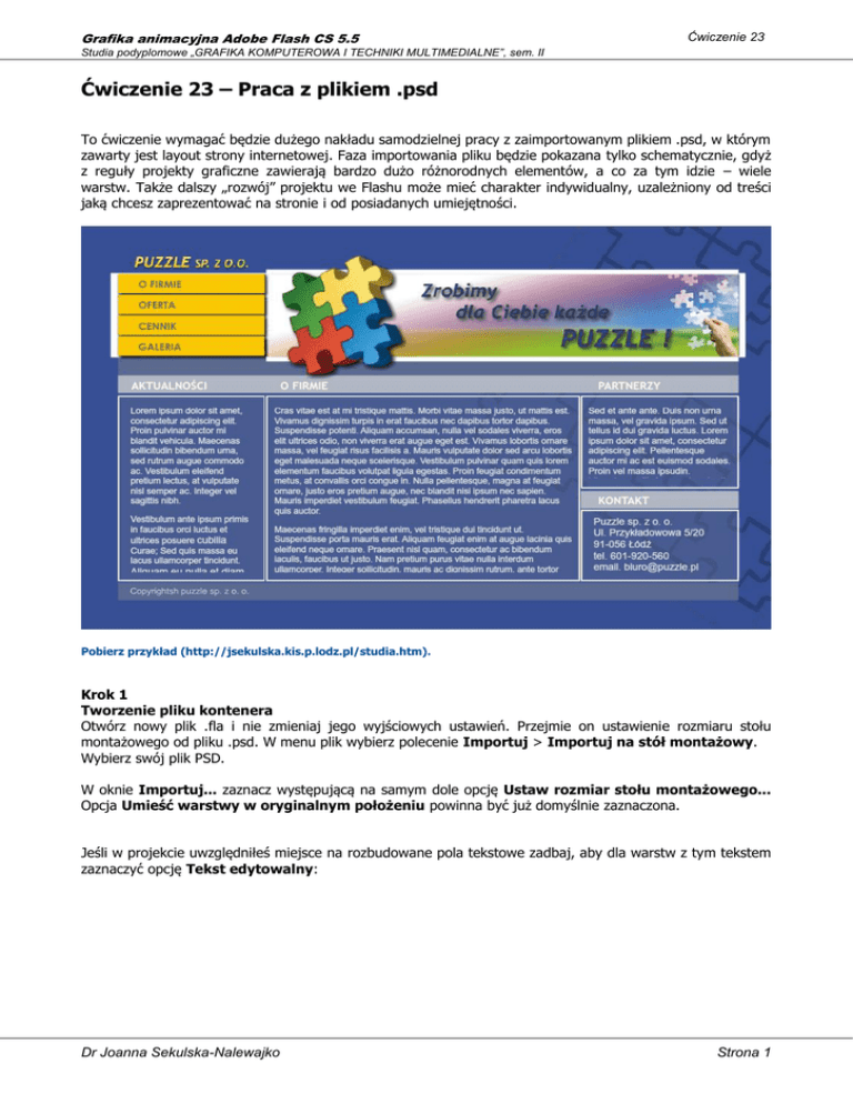 Grafika animacyjna Adobe Flash CS 5.5 Ćwiczenie 23 Studia podyplomowe „GRAFIKA KOMPUTEROWA I TECHNIKI MULTIMEDIALNE”, sem. II Ćwiczenie 23 – Praca z plikiem .psd To ćwiczenie wymagać będzie dużego nakładu samodzielnej pracy z zaimportowanym plikiem .psd, w którym zawarty jest layout strony internetowej. Faza importowania pliku będzie pokazana tylko schematycznie, gdyż z reguły projekty graficzne zawierają bardzo dużo różnorodnych elementów, a co za tym idzie – wiele warstw. Także dalszy „rozwój” projektu we Flashu może mieć charakter indywidualny, uzależniony od treści jaką chcesz zaprezentować na stronie i od posiadanych umiejętności. Pobierz przykład (http://jsekulska.kis.p.lodz.pl/studia.htm). Krok 1 Tworzenie pliku kontenera Otwórz nowy plik .fla i nie zmieniaj jego wyjściowych ustawień. Przejmie on ustawienie rozmiaru stołu montażowego od pliku .psd. W menu plik wybierz polecenie Importuj > Importuj na stół montażowy. Wybierz swój plik PSD. W oknie Importuj... zaznacz występującą na samym dole opcję Ustaw rozmiar stołu montażowego... Opcja Umieść warstwy w oryginalnym położeniu powinna być już domyślnie zaznaczona. Jeśli w projekcie uwzględniłeś miejsce na rozbudowane pola tekstowe zadbaj, aby dla warstw z tym tekstem zaznaczyć opcję Tekst edytowalny: Dr Joanna Sekulska-Nalewajko Strona 1 Grafika animacyjna Adobe Flash CS 5.5 Ćwiczenie 23 Studia podyplomowe „GRAFIKA KOMPUTEROWA I TECHNIKI MULTIMEDIALNE”, sem. II Także mniejsze pola tekstowe raczej powinny pozostać edytowalne, gdyż w ten sposób możemy z łatwością użyć ich na różnych podstronach naszego projektu i tylko wymienić tam ich treść: Dr Joanna Sekulska-Nalewajko Strona 2 Grafika animacyjna Adobe Flash CS 5.5 Ćwiczenie 23 Studia podyplomowe „GRAFIKA KOMPUTEROWA I TECHNIKI MULTIMEDIALNE”, sem. II Tekst dla przycisków także powinien pozostać edytowalny, jeśli chcemy zmienić jego kolor w różnych stanach. W zasadzie jednak przyciski raczej trzeba będzie przygotować od początku. Zastanów się teraz dla których elementów zechcesz użyć animacji lub filtrów – mogą to być napisy w haśle bannera, logo, obrazy na bannerze itp. Elementy graficzne musisz oznaczyć jako Obraz bitmapowy z edytowalnymi stylami warstwy, natomiast tekst do animacji oznaczamy jako Kontury wektorowe. Takie elementy zostaną zaimportowane do projektu flasha od razu w postaci klipów filmowych: Dr Joanna Sekulska-Nalewajko Strona 3 Grafika animacyjna Adobe Flash CS 5.5 Ćwiczenie 23 Studia podyplomowe „GRAFIKA KOMPUTEROWA I TECHNIKI MULTIMEDIALNE”, sem. II Pozostało nam wcisnąć OK i obejrzeć nasz projekt w środowisku edycyjnym Flasha. Jak widać pojawiło się wiele warstw. Jeśli w Photoshopie były one zgrupowane w folderach, tak samo będą zgrupowane we Flashu. Co dalej? 1. Animacje w klipach Jeśli pracujesz na naszym przykładowym pliku .psd to proponuję zająć się na początek animacjami wewnątrz klipów filmowych – są nimi napis na bannerze, obraz na bannerze i tekst logo – zauważ, że dla tych obiektów od razu z łatwością można dodać filtry. Dodaj więc filtr „cień” do obrazka na bannerze. Zrób także animację tego obiektu wewnątrz klipu – może to być „spadnięcie” obrazka z góry”: Listwa czasowa klipu: Dr Joanna Sekulska-Nalewajko Strona 4 Grafika animacyjna Adobe Flash CS 5.5 Ćwiczenie 23 Studia podyplomowe „GRAFIKA KOMPUTEROWA I TECHNIKI MULTIMEDIALNE”, sem. II Podobnie zrób z napisem-logo: Napis na bannerze też może mieć swoją animację, np. wjazd z lewej strony: Dr Joanna Sekulska-Nalewajko Strona 5 Grafika animacyjna Adobe Flash CS 5.5 Ćwiczenie 23 Studia podyplomowe „GRAFIKA KOMPUTEROWA I TECHNIKI MULTIMEDIALNE”, sem. II 2. Przyciski Przyciski trzeba będzie raczej wykonać od początku. Usuń dotychczasową grafikę (najlepiej na razie odsuń ją na bok). Utwórz nową warstwę i w miejscu, gdzie występowały wzory przycisków narysuj jednakowe prostokąty z wypełnieniem takim, jakie posiadały pierwowzory (możesz pobrać z nich kolor narzędziem pipety). Potem przekonwertuj je do osobnych przycisków (F8) i w wewnątrz każdego z nich dodaj tekst i zdefiniuj wygląd każdego stanu przycisku: 3. Nawigacja Przyciski muszą sterować wyświetlaniem podstron naszego projektu, muszą więc posiadać nazwy instancji (np. o_firmie_btn, oferta_btn, cennik_btn, galeria_btn). W tym prostym projekcie podstrony mogą być po prostu rozmieszczone na głównej listwie czasowej, tak jak na tym przykładzie: Widzimy tu dodatkowe nowe warstwy: akcje, stop i opis. Warstwa opis zawiera tylko etykiety klatek, które opisują daną podstronę i pozwalają rozróżnić treść w poszczególnych ujęciach. Etykiety przydadzą się także w skryptach, które obsługiwać będą nawigację. Warstwa stop zawiera tylko akcję stop(); w każdej klatce kluczowej. Warstwa akcje zawiera proste skrypty do nawigacji. Jak widać na poniższym przykładzie nasze przyciski są celem dla zdarzeń myszy i obsługują osobne funkcje. W funkcjach tych wykorzystywane są nasze etykiety klatek: Dr Joanna Sekulska-Nalewajko Strona 6 Grafika animacyjna Adobe Flash CS 5.5 Ćwiczenie 23 Studia podyplomowe „GRAFIKA KOMPUTEROWA I TECHNIKI MULTIMEDIALNE”, sem. II 4. Przygotowanie podstron Zauważ, że zawartość wielu warstw jest uniwersalna dla całego projektu i powinna występować na każdej podstronie. Inne elementy zaś mogą występują tylko na określonej podstronie. Musisz więc odpowiednio zrewidować i przygotować listwę czasową: Dr Joanna Sekulska-Nalewajko Strona 7 Grafika animacyjna Adobe Flash CS 5.5 Ćwiczenie 23 Studia podyplomowe „GRAFIKA KOMPUTEROWA I TECHNIKI MULTIMEDIALNE”, sem. II 5. Teksty Tekst w tej postaci może zostać zastąpiony tekstem właściwym. Można to zrobić lokalnie – po prostu wpisując tekst w ramki. Można także dla dłuższych tekstów zastosować technikę dynamic