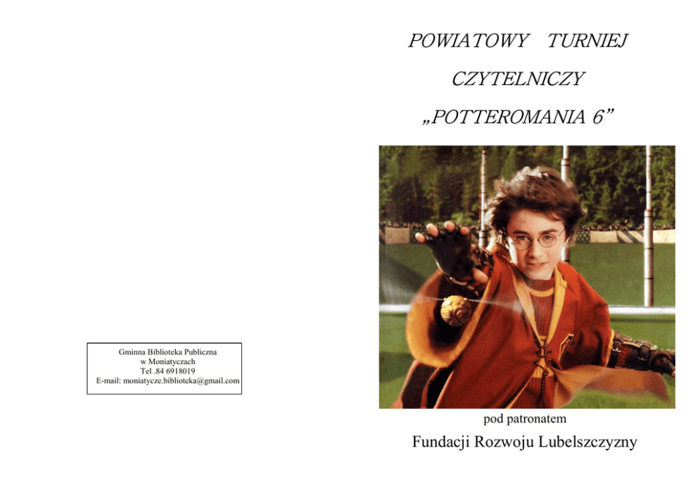 POWIATOWY TURNIEJ CZYTELNICZY „POTTEROMANIA 6” Gminna Biblioteka Publiczna w Moniatyczach Tel .84 6918019 E-mail: [email protected] pod patronatem Fundacji Rozwoju Lubelszczyzny Gminna Biblioteka Publiczna w Moniatyczach Gminny Ośrodek Kultury w Hrubieszowie z siedzibą w Wołajowicach Za s a d y uc ze s t ni c tw a : 1 . K o n k u r s p r ze z n a c z o n y j e s t d l a f a n ó w H a r r y’ e g o P o t t e r a z t e r e n u p o w i a t u h r u b i e s z o w s ki e g o . 2 . K a Ŝd y u c ze s t n i k p r z y g o t o w u j e s t r ó j p o s t a c i w ys t ę p u j ą c e j w H a r r y m P o t t e r z e w c e l u p r e ze n t a c j i n a k o n ku r s i e . ogłaszają 3 . O c e n y d o k o n a k o m i s j a p o w o ł a n a p r ze z o r ga n i za t o r a . 4 . L a u r e a c i o t r z y m a j ą n a gr o d y i p a mi ą t k o w e d yp l o m y . 5 . K a Ŝd a i n s t yt u c j a m o Ŝe z gł o s i ć d o w o l n a l i c zb ę POWIATOWY TURNIEJ CZYTELNICZY u c z e s t n i kó w 6 . Z gł o s ze n i a d o k o n k u r s u n a l e Ŝ y d o ko n a ć p i s e m n i e d o d n i a 8 m a j a 2 0 1 3 r o ku n a a d r e s : . G mi nny Ośrodek K ultury „POTTEROMANIA 6” Termin i miejsce przeprowadzenia konkursu: 16 MAJ 2013 r. godz. 9.00 w Gminnym Ośrodku Kultury w Wołajowicach w Wołajow icach 22– 500 Hrubieszów Konkurs składa się z dwóch etapów: I e t a p – u d zi a ł b i o r ą w s z ys c y u c ze s t n i c y — f o r ma p i s e m n a i o c e n a stroju. I I e t a p – u d zi a ł b i o r ą f i n a l i ś c i Li te r a tur a : 1. Joanne K. Ro wling- „ Harry Potter i ka mień filozoficzny”. 2. Joanne K. Ro wling- „ Harry Potter i komnata tajemnic”. Cele konkursu: 3. Joanne K. Ro wling- „ Harry Potter i więzień Azkabanu”. 4. Joanne K. Ro wling- „ Harry Potter i czara ognia”. 1. Rozbudzanie zainteresowań młodzieży literaturą fantastyczną. 2. Popularyzacja literatury obcej dla dzieci. 5. Joanne K. Ro wling- „ Harry Potter i Zakon Feniksa”. 6. Joanne K. Ro wling-”Harry P otter i KsiąŜę P ółkr wi” 7. Joanne K. Ro wling-”Harry P otter Insygnia śmierci” Szc zegółowe inform acje dot yc zące k onk ur su m oŜna uzysk ać w G BP w Moniat yc zac h, tel. (84) 691- 80- 19