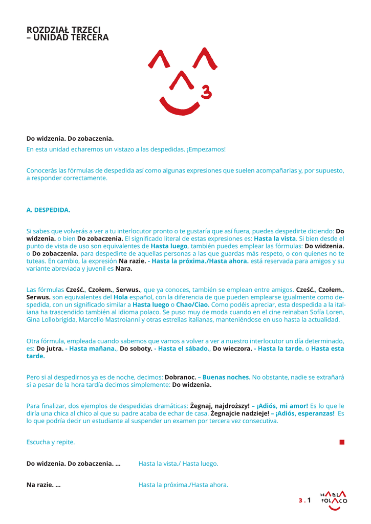 ROZDZIAŁ TRZECI – UNIDAD TERCERA Do widzenia. Do zobaczenia. En esta unidad echaremos un vistazo a las despedidas. ¡Empezamos! Conocerás las fórmulas de despedida así como algunas expresiones que suelen acompañarlas y, por supuesto, a responder correctamente. A. DESPEDIDA. Si sabes que volverás a ver a tu interlocutor pronto o te gustaría que así fuera, puedes despedirte diciendo: Do widzenia. o bien Do zobaczenia. El significado literal de estas expresiones es: Hasta la vista. Si bien desde el punto de vista de uso son equivalentes de Hasta luego, también puedes emplear las fórmulas: Do widzenia. o Do zobaczenia. para despedirte de aquellas personas a las que guardas más respeto, o con quienes no te tuteas. En cambio, la expresión Na razie. - Hasta la próxima./Hasta ahora. está reservada para amigos y su variante abreviada y juvenil es Nara. Las fórmulas Cześć., Czołem., Serwus., que ya conoces, también se emplean entre amigos. Cześć., Czołem., Serwus. son equivalentes del Hola español, con la diferencia de que pueden emplearse igualmente como despedida, con un significado similar a Hasta luego o Chao/Ciao. Como podéis apreciar, esta despedida a la italiana ha trascendido también al idioma polaco. Se puso muy de moda cuando en el cine reinaban Sofía Loren, Gina Lollobrigida, Marcello Mastroianni y otras estrellas italianas, manteniéndose en uso hasta la actualidad. Otra fórmula, empleada cuando sabemos que vamos a volver a ver a nuestro interlocutor un día determinado, es: Do jutra. - Hasta mañana., Do soboty. - Hasta el sábado., Do wieczora. - Hasta la tarde. o Hasta esta tarde. Pero si al despedirnos ya es de noche, decimos: Dobranoc. – Buenas noches. No obstante, nadie se extrañará si a pesar de la hora tardía decimos simplemente: Do widzenia. Para finalizar, dos ejemplos de despedidas dramáticas: Żegnaj, najdroższy! – ¡Adiós, mi amor! Es lo que le diría una chica al chico al que su padre acaba de echar de casa. Żegnajcie nadzieje! – ¡Adiós, esperanzas! Es lo que podría decir un estudiante al suspender un examen por tercera vez consecutiva. Escucha y repite. Do widzenia. Do zobaczenia. … Hasta la vista./ Hasta luego. Na razie. … Hasta la próxima./Hasta ahora. 3.1 Cześć. Czołem. Serwus. … Hasta luego./Chao./Ciao. Ciao. … Chao./Ciao. Do jutra. … Hasta mañana. Do soboty. … Hasta el sábado. Do wieczora. … Hasta la tarde./Hasta esta tarde. Dobranoc. … Buenas noches. Żegnaj, najdroższy! … ¡Adiós, mi amor! Żegnajcie nadzieje! … ¡Adiós, esperanzas! Para que nuestra despedida no suene excesivamente seca e impersonal, podremos añadir expresiones como: Wszystkiego dobrego! - ¡Que te vaya bien!, Przyjemnego weekendu! - ¡Que tengas un buen fin de semana!, Przyjemnej niedzieli! – ¡Buen domingo! Y ahora un poco de crueldad polaca. Puedes desearle Przyjemnej zabawy! - ¡Que te diviertas! o Baw się dobrze! - ¡Que lo pases bien! a un amigo que ha sido invitado a la boda de su ex novia. Por supuesto, estas expresiones también pueden emplearse en otras circunstancias. Por ejemplo: Przyjemnych wrażeń! - ¡Que lo disfrutes!, es lo que puedes desear a una persona que se dirige a un concierto o al cine. En cambio, dirás Powodzenia! – ¡Suerte! a un amigo pianista que está a punto de ofrecer su primer recital, de examinarse o de conocer al padre de su novia. O también, por qué no, a los hayan decidido empezar a estudiar polaco ;-) Escucha y repite. Wszystkiego dobrego! … ¡Que te vaya bien! Przyjemnego weekendu! … ¡Que tengas un buen fin de semana! Przyjemnej niedzieli! … ¡Buen domingo! Przyjemnej zabawy! … ¡Que te diviertas! Baw się dobrze! … ¡Que lo pases bien! Przyjemnych wrażeń! … ¡Que lo disfrutes! Powodzenia! … ¡Suerte! 3.2 Y ante tales manifestaciones hay que expresar cierto agradecimiento: Dziękuję. – Gracias., si lo dices en nombre de una persona, o Dziękujemy. – Gracias. para manifestar tu agradecimiento y el de al menos otra persona más. En tal caso también podemos añadir: Wzajemnie. – Y tú también./ Y usted también. Escucha y repite. Dziękuję. Gracias. (si lo dices en nombre de una persona =Yo te/le/os/les doy las gracias.) Dziękujemy. Gracias. (si lo dices en nombre de más de una persona = Nosotros te/le/os/les damos las gracias.) Wzajemnie. Y tú también./ Y usted también. B 1. DIÁLOGO. Escucha la conversación entre Adam y su compañera de clase en la universidad. Adam: Dzień dobry, Ewa. Ewa: Cześć, Adam. Co nowego? Adam: Wszystko w porządku. A u ciebie? Ewa: Dobrze. Przepraszam, mój autobus. Do jutra. Adam: Cześć. Reproduce el papel de Ewa. Adam: Dzień dobry, Ewa. Ewa: …........................... Adam: Wszystko w porządku. A u ciebie? Ewa: …........................... Adam: Cześć. 3.3 Y ahora representa el papel de Adam. Adam: …........................... Ewa: Cześć, Adam. Co nowego? Adam: …........................... Ewa: Dobrze. Przepraszam, mój autobus. Do jutra. Adam: …........................... B 2. DIÁLOGO. Escucha la conversación entre la Sra. Kowalska y el Sr. Nowak. Pan Nowak: Dzień dobry. Pani Kowalska: Dzień dobry. Pan Nowak: Jak się pani czuje? Pani Kowalska: Dziękuję, dobrze. A pan? Pan Nowak: Lepiej. O, przepraszam. Mój tramwaj. Do widzenia. Pani Kowalska: Do widzenia. Representa el papel de la Sra. Kowalska. Pan Nowak: Dzień dobry. Pani Kowalska: …........................... Pan Nowak: Jak się pani czuje? Pani Kowalska: …........................... Pan Nowak: Lepiej. O, przepraszam. Mój tramwaj. Do widzenia. Pani Kowalska: …........................... 3.4 Reproduce el papel del Sr. Nowak. Pan Nowak: …........................... Pani Kowalska: Dzień dobry. Pan Nowak: …........................... Pani Kowalska: Dziękuję, dobrze. A pan? Pan Nowak: …........................... Pani Kowalska: Do widzenia. En la cuarta unidad aprenderás a preguntar el nombre y el apellido de tu interloc