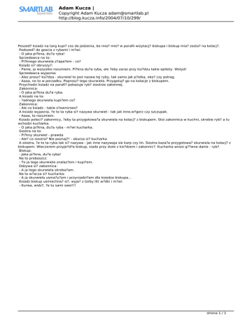 Adam Kucza | Copyright Adam Kucza [email protected] http://blog.kucza.info/2004/07/10/299/ Poszed? ksiadz na targ kupi? cos do jedzenia, bo mia? mie? w parafii wizytacj? biskupa i biskup mia? zosta? na kolacj?. Podszed? do goscia z rybami i m?wi: - O jaka pi?kna, du?a ryba! Sprzedawca na to: - Pi?knego skurwiela z?apa?em - co? Ksiadz si? obruszy?: - Panie, ja wszystko rozumiem. Pi?kna du?a ryba, ale ?eby zaraz przy ksi?dzu takie epitety. Wstyd! Sprzedawca wyjasnia: - Alez prosz? ksi?dza - skurwiel to jest nazwa tej ryby, tak samo jak p?otka, oko? czy pstrag. - Aaaa, no to w porzadku. Poprosz? tego skurwiela. Przygotuj? go na kolacje z biskupem. Przychodzi ksiadz na parafi? pokazuje ryb? siostrze zakonnej. Zakonnica: - O jaka pi?kna du?a ryba. A ksiadz na to: - ?adnego skurwiela kupi?em co? Zakonnica: - Ale co ksiadz - takie s?ownictwo? A ksiadz wyjasnia, ?e to ta ryba si? nazywa skurwiel - tak jak inne,w?gorz czy szczupak. - Aaaa, to rozumiem. Ksiadz poleci? zakonnicy, ?eby ta przygotowa?a skurwiela na kolacj? z biskupem. Stoi zakonnica w kuchni, skrobie ryb? a tu wchodzi kucharka. - O jaka pi?kna, du?a ryba - m?wi kucharka. Siostra na to: - Pi?kny skurwiel - prawda - Ale? co siostra? Nie poznaj?! - oburza si? kucharka A siostra, ?e to ta ryba tak si? nazywa - jak inne nazywaja sie karp czy lin. Siostra kaza?a przygotowa? skurwiela na kolacj? z biskupem. Wieczorem przyje?d?a biskup, siada przy stole z ksi?dzem i zakonnic?. Kucharka wnosi g??wne danie - ryb?. Biskup: - Jaka pi?kna, du?a ryba! Na to proboszcz: - To ja tego skurwiela znalaz?em i kupi?em. Odzywa si? zakonnica: - A ja tego skurwiela skroba?am. Na to w?acza si? kucharka: - A ja skurwiela usma?y?am i przyrzadzi?am dla ksiedza biskupa... Ksiadz biskup usmiechna? si?, wyja? z torby litr w?dki i m?wi: - Kurwa, widz?, ?e tu sami swoi!!! strona 1 / 1