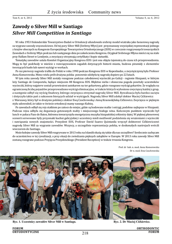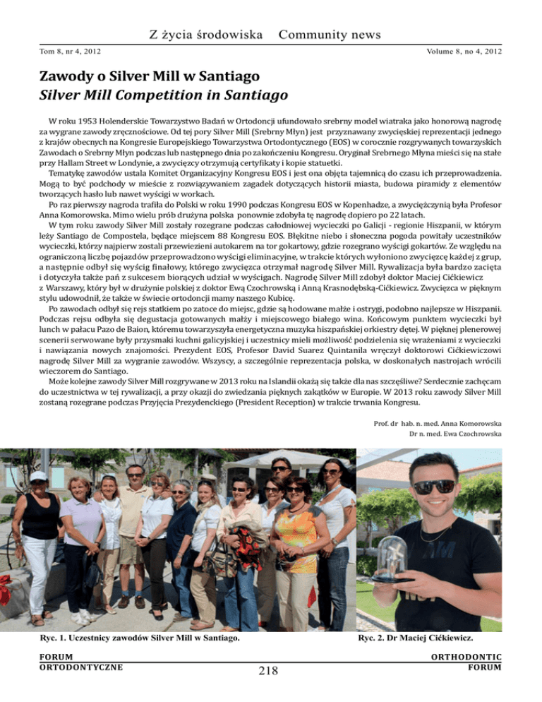 Z życia środowiska Community news Tom 8, nr 4, 2012 Volume 8, no 4, 2012 Zawody o Silver Mill w Santiago silver Mill Competition in santiago W roku 1953 Holenderskie Towarzystwo Badań w Ortodoncji ufundowało srebrny model wiatraka jako honorową nagrodę za wygrane zawody zręcznościowe. Od tej pory Silver Mill (Srebrny Młyn) jest przyznawany zwycięskiej reprezentacji jednego z krajów obecnych na Kongresie Europejskiego Towarzystwa Ortodontycznego (EOS) w corocznie rozgrywanych towarzyskich Zawodach o Srebrny Młyn podczas lub następnego dnia po zakończeniu Kongresu. Oryginał Srebrnego Młyna mieści się na stałe przy Hallam Street w Londynie, a zwycięzcy otrzymują certyfikaty i kopie statuetki. Tematykę zawodów ustala Komitet Organizacyjny Kongresu EOS i jest ona objęta tajemnicą do czasu ich przeprowadzenia. Mogą to być podchody w mieście z rozwiązywaniem zagadek dotyczących historii miasta, budowa piramidy z elementów tworzących hasło lub nawet wyścigi w workach. Po raz pierwszy nagroda trafiła do Polski w roku 1990 podczas Kongresu EOS w Kopenhadze, a zwyciężczynią była Profesor Anna Komorowska. Mimo wielu prób drużyna polska ponownie zdobyła tę nagrodę dopiero po 22 latach. W tym roku zawody Silver Mill zostały rozegrane podczas całodniowej wycieczki po Galicji - regionie Hiszpanii, w którym leży Santiago de Compostela, będące miejscem 88 Kongresu EOS. Błękitne niebo i słoneczna pogoda powitały uczestników wycieczki, którzy najpierw zostali przewiezieni autokarem na tor gokartowy, gdzie rozegrano wyścigi gokartów. Ze względu na ograniczoną liczbę pojazdów przeprowadzono wyścigi eliminacyjne, w trakcie których wyłoniono zwycięzcę każdej z grup, a następnie odbył się wyścig finałowy, którego zwycięzca otrzymał nagrodę Silver Mill. Rywalizacja była bardzo zacięta i dotyczyła także pań z sukcesem biorących udział w wyścigach. Nagrodę Silver Mill zdobył doktor Maciej Cićkiewicz z Warszawy, który był w drużynie polskiej z doktor Ewą Czochrowską i Anną Krasnodębską-Cićkiewicz. Zwycięzca w pięknym stylu udowodnił, że także w świecie ortodoncji mamy naszego Kubicę. Po zawodach odbył się rejs statkiem po zatoce do miejsc, gdzie są hodowane małże i ostrygi, podobno najlepsze w Hiszpanii. Podczas rejsu odbyła się degustacja gotowanych małży i miejscowego białego wina. Końcowym punktem wycieczki był lunch w pałacu Pazo de Baion, któremu towarzyszyła energetyczna muzyka hiszpańskiej orkiestry dętej. W pięknej plenerowej scenerii serwowane były przysmaki kuchni galicyjskiej i uczestnicy mieli możliwość podzielenia się wrażeniami z wycieczki i nawiązania nowych znajomości. Prezydent EOS, Profesor David Suarez Quintanila wręczył doktorowi Cićkiewiczowi nagrodę Silver Mill za wygranie zawodów. Wszyscy, a szczególnie reprezentacja polska, w doskonałych nastrojach wrócili wieczorem do Santiago. Może kolejne zawody Silver Mill rozgrywane w 2013 roku na Islandii okażą się także dla nas szczęśliwe? Serdecznie zachęcam do uczestnictwa w tej rywalizacji, a przy okazji do zwiedzania pięknych zakątków w Europie. W 2013 roku zawody Silver Mill zostaną rozegrane podczas Przyjęcia Prezydenckiego (President Reception) w trakcie trwania Kongresu. Prof. dr hab. n. med. Anna Komorowska Dr n. med. Ewa Czochrowska Ryc. 1. Uczestnicy zawodów Silver Mill w Santiago. FORUM ORTODONTYCZNE Ryc. 2. Dr Maciej Cićkiewicz. 218 ORTHODONTIC FORUM