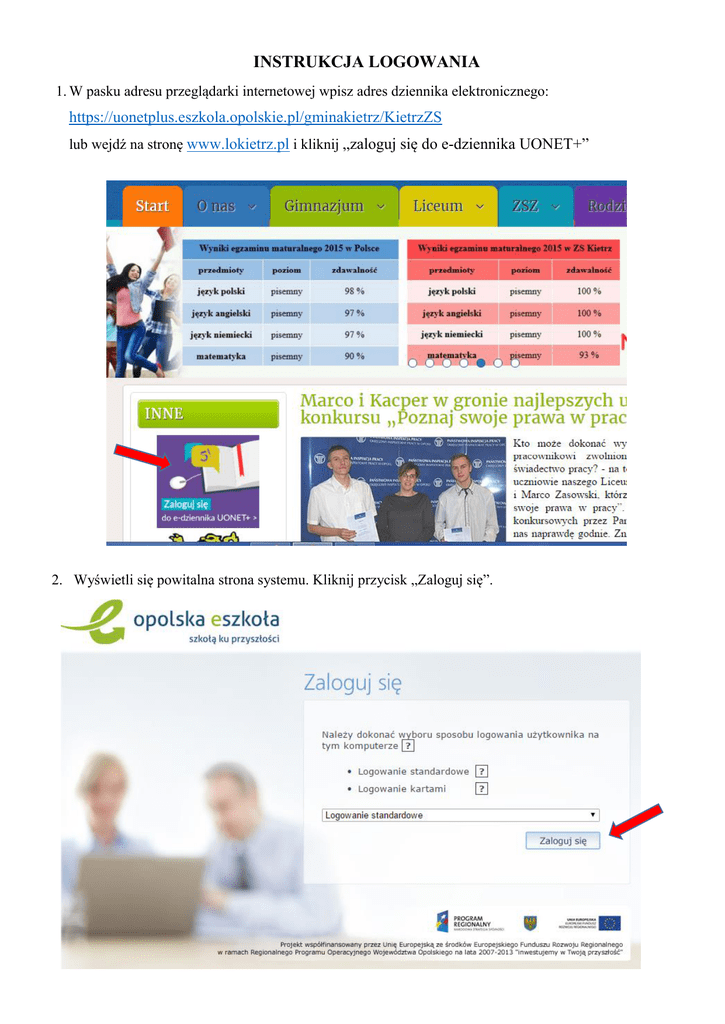 INSTRUKCJA LOGOWANIA 1. W pasku adresu przeglądarki internetowej wpisz adres dziennika elektronicznego: https://uonetplus.eszkola.opolskie.pl/gminakietrz/KietrzZS lub wejdź na stronę www.lokietrz.pl i kliknij „zaloguj się do e-dziennika UONET+” 2. Wyświetli się powitalna strona systemu. Kliknij przycisk „Zaloguj się”. 3. W następnym oknie klikamy na link „Przywracanie dostępu do konta” 4. W polu „E-mail, PESEL lub login” wpisujemy adres e-mail lub PESEL, który został podany wychowawcy i klikamy na przycisk „NIE JESTEM ROBOTEM”, a następnie klikamy przycisk „Wyślij wiadomość” 5. Zostanie wyświetlony komunikat o wysłaniu wiadomości na Państwa e-mail: 6. W mailu otrzymają Państwo informację o swoim loginie, a także link aktywacyjny pozwalający zdefiniować hasło 7. Wpisujemy hasło w obydwa pola i klikamy „Nie jestem robotem”, a następnie „Ustaw nowe hasło” 8. Zostaniemy poinformowani o pomyślnym zapisaniu hasła. Logowanie 9. Wejdź na stronę www.lokietrz.pl i kliknij „zaloguj się do e-dziennika UONET+” 10. Zostaniemy przekierowani na stronę logowania i klikamy „Zaloguj się” 11. Na następnej stronie w polu Nazwa użytkownika wpisujemy login, który otrzymaliśmy w mailu a w polu hasło, hasło które sobie ustawiliśmy i klikamy „zaloguj się”. 12. Zostaniesz przekierowany na swoją stronę startową, która zawiera komplet informacji dedykowanych dla Ciebie. Ze strony startowej możesz uruchomić moduły do których masz dostęp. 13. Witrynę ucznia i rodzica uruchamia się ze strony startowej za pomocą przycisku „Uczeń” 14. Jeśli jesteś rodzicem kilku uczniów i Twój adres e-mail został wpisany w kartotece każdego dziecka to z poziomu Witryny Ucznia i rodzica możesz przeglądać informacje dotyczące każdego dziecka. Wyboru dokonuje się za pomocą selektora „Uczeń” 15. Informacje na temat poruszania się w programie znajdziesz w zakładce „Pomoc” Proszę nie zapominać o wylogowaniu się po skorzystaniu z dziennika!!!