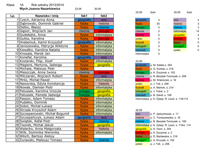Klasa 1A Rok szkolny 2013/2014 Wych.Joanna Nazarkiewicz 23.09 30.09 23.09 Lp. 1 2 3 4 5 6 7 8 9 10 11 12 13 14 15 16 17 18 19 20 21 22 23 24 25 26 27 28 29 30 31 32 33 Nazwisko i imię Czech, Adrianna Anna Dąbrowski, Dominik Gabriel Detko, Błażej Gąsior, Wojciech Jan Gudełajtis, Anna Gutka, Karolina Hrebeniuk, Kamil Krzysztof Janiszewska, Patrycja Wiktoria Kawałko, Karolina Natalia Knosala, Marek Jan Konefał, Karolina Koziarski, Filip, Józef Magiera, Martyna, Jadwiga Michala, Mateusz Piotr Mieszczak, Anna Iwona Milczarski, Wojciech Robert Mróz, Michał Paweł Naworska, Edyta Konstancja Nowak, Damian Piotr Palussek, Karolina Urszula Palussek, Pamela Jadwiga Passon, Adam Tomasz Pudełko, Dominik Sobol, Michał Łukasz Strzała Krzysztof Adam Szczepanowski, Michał Bogumił Szczepańczyk, Łukasz Adam Świętek, Rafał Piotr Tworek, Michał Jakub Walecko, Anna Małgorzata Wilk, Dominika Weronika Włoch, Bartosz Aleksy Żurawski, Mateusz Tomasz fak1 geografia fizyka fizyka chemia fizyka fizyka geografia fizyka fizyka fizyka geografia fizyka fizyka fizyka chemia fizyka fizyka fizyka fizyka biologia biologia fizyka fizyka fizyka fizyka fizyka geografia fizyka fizyka fizyka fizyka fizyka fizyka fak2 wos historia chemia biologia informatyka biologia informatyka informatyka informatyka informatyka wos informatyka geografia biologia wos informatyka historia informatyka geografia geografia informatyka informatyka informatyka informatyka informatyka wos chemia geografia historia informatyka chemia geografia fizyka biologia chemia historia polski fizykaB biologiaK chemiaS informatyka ilość 30.09 4 25 2 2 0 0 0 0 0 0 ilość wos historia chemia informatyka geografia biologia fizyka biologiaT polski 23.09 geografia fizyka biologia chemia historia polski fizykaB biologiaK chemiaS informatyka p. M. Kaleta s. 204 p. G. Korbaś, s. 216 p. K. Duczmal, s. 102 p. B. Besztak-Tomiczak, s. 209 p. M. Wietrzniok, s. 16 p. J. Toll, s. 206 p. A. Mamok, s. 214 p. J. Tokar, s. 2 p. B. Sokół, s. 109 p. K. Żyta/p. R. Lisoń, s. 116/114 30.09 wos historia chemia informatyka geografia biologia fizyka biologiaT polski p. P. Jędrychowsk, s. 17 p. C. Tomaszewska, s. 16 p. B. Besztak-Tomiczak, s. 109 p. K. Zyta/p. R. Lisoń, s. 116/s. 114 p. K. Ozon, s. 204 p. K. Duczmal, s. 2 p. D. Bacławska, s. 216 p. A. Kruczek, s. 102 p. J. Toll, s. 206 4 3 3 14 4 3 0 0 0