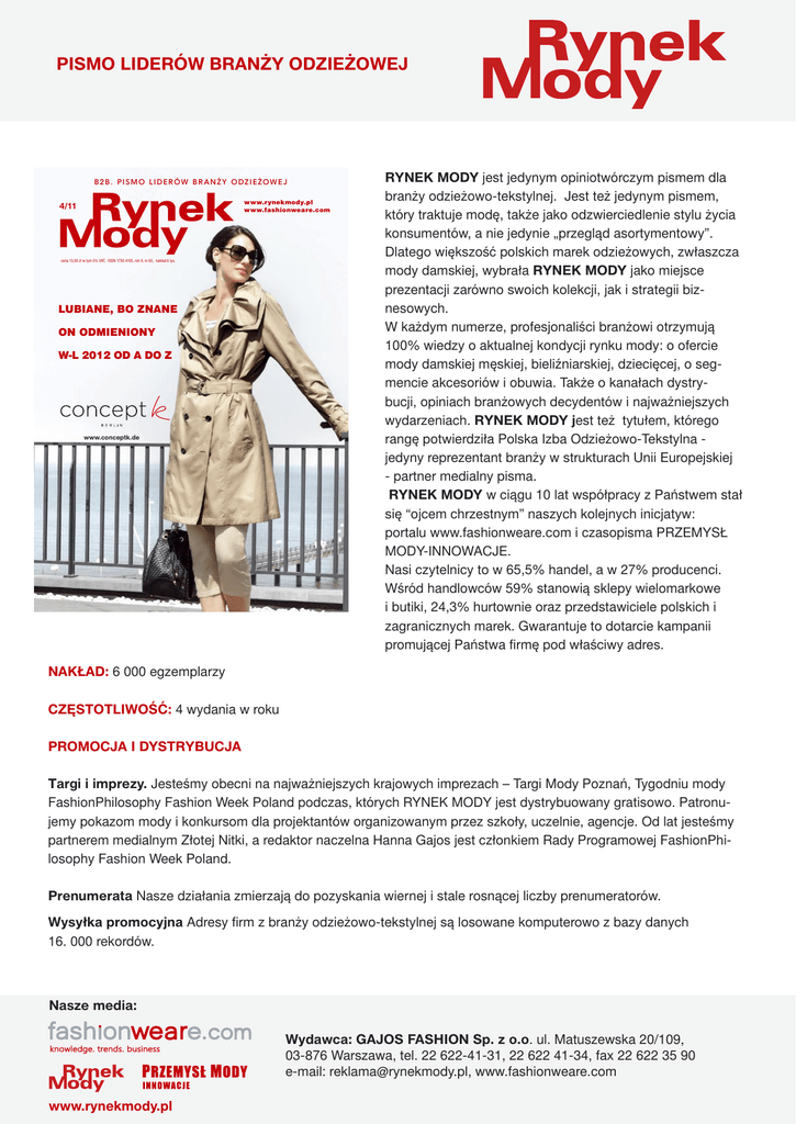 PISMO LIDERÓW BRANŻY ODZIEŻOWEJ � � � � � � � � � � � � � � � � � � � � � � � � � � � �� � � � � � � � ���������������� �������������������� ���� �������������������������������������������������������������������������� ����������������� ������������� ������������������ � ��������������� RYNEK MODY jest jedynym opiniotwórczym pismem dla branży odzieżowo-tekstylnej. Jest też jedynym pismem, który traktuje modę, także jako odzwierciedlenie stylu życia konsumentów, a nie jedynie „przegląd asortymentowy”. Dlatego większość polskich marek odzieżowych, zwłaszcza mody damskiej, wybrała RYNEK MODY jako miejsce prezentacji zarówno swoich kolekcji, jak i strategii biznesowych. W każdym numerze, profesjonaliści branżowi otrzymują 100% wiedzy o aktualnej kondycji rynku mody: o ofercie mody damskiej męskiej, bieliźniarskiej, dziecięcej, o segmencie akcesoriów i obuwia. Także o kanałach dystrybucji, opiniach branżowych decydentów i najważniejszych wydarzeniach. RYNEK MODY jest też tytułem, którego rangę potwierdziła Polska Izba Odzieżowo-Tekstylna jedyny reprezentant branży w strukturach Unii Europejskiej - partner medialny pisma. RYNEK MODY w ciągu 10 lat współpracy z Państwem stał się “ojcem chrzestnym” naszych kolejnych inicjatyw: portalu www.fashionweare.com i czasopisma PRZEMYSŁ MODY-INNOWACJE. Nasi czytelnicy to w 65,5% handel, a w 27% producenci. Wśród handlowców 59% stanowią sklepy wielomarkowe i butiki, 24,3% hurtownie oraz przedstawiciele polskich i zagranicznych marek. Gwarantuje to dotarcie kampanii promującej Państwa firmę pod właściwy adres. NAKŁAD: 6 000 egzemplarzy CZĘSTOTLIWOŚĆ: 4 wydania w roku PROMOCJA I DYSTRYBUCJA Targi i imprezy. Jesteśmy obecni na najważniejszych krajowych imprezach – Targi Mody Poznań, Tygodniu mody FashionPhilosophy Fashion Week Poland podczas, których RYNEK MODY jest dystrybuowany gratisowo. Patronujemy pokazom mody i konkursom dla projektantów organizowanym przez szkoły, uczelnie, agencje. Od lat jesteśmy partnerem medialnym Złotej Nitki, a redaktor naczelna Hanna Gajos jest członkiem Rady Programowej FashionPhilosophy Fashion Week Poland. Prenumerata Nasze działania zmierzają do pozyskania wiernej i stale rosnącej liczby prenumeratorów. Wysyłka promocyjna Adresy firm z branży odzieżowo-tekstylnej są losowane komputerowo z bazy danych 16. 000 rekordów. Nasze media: Wydawca: GAJOS FASHION Sp. z o.o. ul. Matuszewska 20/109, 03-876 Warszawa, tel. 22 622-41-31, 22 622 41-34, fax 22 622 35 90 e-mail: [email protected], www.fashionweare.com www.rynekmody.pl PISMO LIDERÓW BRANŻY ODZIEŻOWEJ FORMATY I CENY REKLAM 210x297mm Okładki: I 7.000,00 zł II 6. 800,00 zł III 6. 600,00 zł IV. 7. 000,00 zł * plus 5 mm spadu po każdej stronie 1/1 strony A4: 4. 880,00 zł 1/2 strony A4 2. 750,00 zł WRZUTKI A4 (INSERT) 91x270mm 3. 500, 00 zł (cały nakład 6 tys. egzemplarzy) 186x133mm 1/3 strony A4 2. 125,00 zł 1/4 strony A4 1. 250,00 zł 62x270mm 91x133mm 186x66mm 186x62mm TERMINY WYDAŃ W 2012 ROKU termin nadsyłania materiałów zdjęciowych i reklam Nr 1/2012 Nr 2/2012 Nr 3/ 2012 Nr 4/ 2012 01 luty 01 kwiecień 06 sierpień 01 listopad 27 luty 18 kwiecień 04 wrzesień 25 listopad 43x270mm dodatkowa dystrybucja NEXT SEASON Poznań dodatkowa dystrybucja FashionPhilosophy Fashion Week Poland dodatkowa dystrybucja NEXT SEASON Poznań dodatkowa dystrybucja FashionPhilosophy Fashion Week Poland SPOSÓB DOSTARCZANIA MATERIAŁÓW REKLAMOWYCH • e-mail: [email protected] • FTP: ftp.gajosfashion.nazwa.pl login: gajosfashion_klient password: klientRynekmody1@ Nasze media: Wydawca: GAJOS FASHION Sp. z o.o. ul. Matuszewska 20/109, 03-876 Warszawa, tel. 22 622-41-31, 22 622 41-34, fax 22 622 35 90 e-mail: [email protected], www.fashionweare.com www.rynekmody.pl PISMO LIDERÓW BRANŻY ODZIEŻOWEJ KAŻDY NUMER RYNKU MODY TO STAŁE DZIAŁY: MODA główne rubryki: •� SHOWROOM – redakcyjny odpowiednik showroomu firmowego. Powstał na życzenie oferentów wiodących marek, mających spójne trendowe kolekcje i strategię zgodną z ich sposobem docierania do konsumentów, także poprzez formy kontaktowania się z handlem, np. sklepy franczyzowe albo program tworzenia takich sklepów. Showroom wzmacnia pozycję marki i jest zaproszeniem do showroomu w siedzibie firmy. •� �PANORAMA MAREK odtwarzenie słowem i obrazem struktury sklepu multibrandowego. Sugestia dla handlowców jak korzystając z oferty różnych marek stworzyć spójną kolekcje handlową. Jeśli chcesz ułatwić decyzję i kontraktacje swojemu klientowi zaprezentuj się w Panoramie Marek. � •� �ALFABET TRENDÓW sezonowy koncentrat wiedzy o najnowszych trendach sezonu – tkaniny, kolory, linie, w formie niezbędnika dla handlowca, producenta, projektanta. •� �HIT SEZONU Jeśli firma oferuje jeden określony asortyment, np. bluzki czy swetry ma możliwość zaprezentowania ofert w rubryce ściśle asortymentowej, ilustującej modne tendencje dotyczące tej grupy. BIZNES informacje o koniunkturze branży w formie opracowań statystycznych i publicystycznych. Relacje z imprez kontraktacyjnych. Portrety firm i ludzi, dla których moda jest nie tylko pasją, ale także dobrym interesem. specjalne rubryki: •� �MODA TO BIZNES prezentacja modeli biznesowych firm, strategii marek, itd. Programy działania i inicjatywy zrzeszające przedsiębiorców przemysłu mody. •� �WWW.FASHIONWEARE.COM. Rubryka, w której informujemy o możliwościach zaprezentowania realnych dokonań w przestrz
