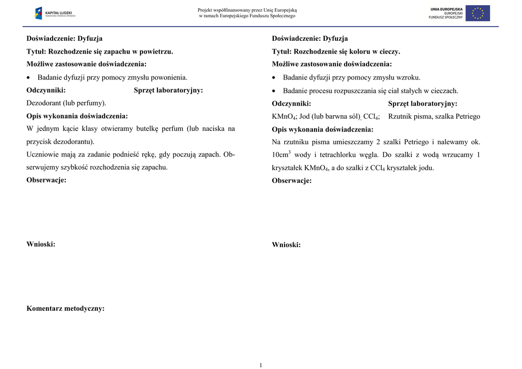 Projekt współfinansowany przez Unię Europejską w ramach Europejskiego Funduszu Społecznego Doświadczenie: Dyfuzja Doświadczenie: Dyfuzja Tytuł: Rozchodzenie się zapachu w powietrzu. Tytuł: Rozchodzenie się koloru w cieczy. Możliwe zastosowanie doświadczenia: Możliwe zastosowanie doświadczenia: • • Badanie dyfuzji przy pomocy zmysłu wzroku. • Badanie procesu rozpuszczania się ciał stałych w cieczach. Badanie dyfuzji przy pomocy zmysłu powonienia. Odczynniki: Sprzęt laboratoryjny: Dezodorant (lub perfumy). Odczynniki: Sprzęt laboratoryjny: Opis wykonania doświadczenia: KMnO4; Jod (lub barwna sól), CCl4; Rzutnik pisma, szalka Petriego W jednym kącie klasy otwieramy butelkę perfum (lub naciska na Opis wykonania doświadczenia: przycisk dezodorantu). Na rzutniku pisma umieszczamy 2 szalki Petriego i nalewamy ok. Uczniowie mają za zadanie podnieść rękę, gdy poczują zapach. Ob- 10cm3 wody i tetrachlorku węgla. Do szalki z wodą wrzucamy 1 serwujemy szybkość rozchodzenia się zapachu. kryształek KMnO4, a do szalki z CCl4 kryształek jodu. Obserwacje: Obserwacje: Wnioski: Wnioski: Komentarz metodyczny: 1 Projekt współfinansowany przez Unię Europejską w ramach Europejskiego Funduszu Społecznego Doświadczenie: Dyfuzja Doświadczenie: Dyfuzja Tytuł: Rozchodzenie się koloru w cieczy. Tytuł: Rozchodzenie się koloru. Możliwe zastosowanie doświadczenia: Możliwe zastosowanie doświadczenia: • • Badanie dyfuzji przy pomocy zmysłu wzroku. Badanie dyfuzji przy pomocy zmysłu wzroku. Odczynniki: Sprzęt laboratoryjny: • Badanie zjawiska błon półprzepuszczalnych. CuSO4r-r, inna barwna sól zlewka 25, krążek z korka, bagietka • Reakcja charakterystyczna dla skrobii. Opis wykonania doświadczenia: Odczynniki: Sprzęt laboratoryjny: Do zlewki nalewamy ok. 100 cm roztworu siarczanu(VI) miedzi(II). Kleik skrobiowy; jodyna; Zlewka na 250 cm3, woreczek z polietylenu Następnie na powierzchni cieczy kładziemy krążek z korka i delikat- Opis wykonania doświadczenia: 3 3 nie, po bagietce, nalewamy 100cm wody. W zlewce rozpuszczamy roztwór kleiku skrobiowego, do woreczka z Obserwacje: polietylenu nalewamy roztwór jodyny a następnie wkładamy woreczek do zlewki z kleikiem. Obserwacje: Wnioski: Wnioski: Równanie reakcji chemicznej: Komentarz metodyczny: Komentarz metodyczny: 2 Projekt współfinansowany przez Unię Europejską w ramach Europejskiego Funduszu Społecznego Doświadczenie: Dyfuzja Doświadczenie: Dyfuzja Tytuł: Rozchodzenie się koloru w powietrzu. Tytuł: Rozchodzenie się smaku. Możliwe zastosowanie doświadczenia: Możliwe zastosowanie doświadczenia: • Badanie dyfuzji przy pomocy zmysłu wzroku. • • Sublimacja i resublimacja. Odczynniki: Sprzęt laboratoryjny: Bezbarwna galaretka, sok. Rzutnik pisma, szalka Petriego, kor- Odczynniki: Sprzęt laboratoryjny: J Zlewka (500), szkiełko zegarkowe, palnik Badanie dyfuzji przy pomocy zmysłu smaku. kobór, mała łyżeczka (Mc) Opis wykonania doświadczenia: Opis wykonania doświadczenia: Na dnie zlewki umieszczamy kilka kryształków. Zlewkę nakrywamy W zastygniętej galaretce (w szalce Petriego) w centrum, wycinamy szkiełkiem zegarkowym i ogrzewamy palnikiem. korkoborem otwór, w który wlewamy sok. Po chwili sprawdzamy Obserwacje: smak galaretki w różnych odległościach od centrum. Obserwacje: Wnioski: Wnioski: Komentarz metodyczny: Komentarz metodyczny: 3 Projekt współfinansowany przez Unię Europejską w ramach Europejskiego Funduszu Społecznego Doświadczenie: Dyfuzja Doświadczenie: Promieniotwórczość. Tytuł: Rozchodzenie się smaku. Tytuł: Wykrywanie promieniowania jonizującego. Możliwe zastosowanie doświadczenia: Możliwe zastosowanie doświadczenia: • Badanie dyfuzji przy pomocy zmysłu smaku. • • Badanie procesu rozpuszczania się ciał stałych w cieczach. Odczynniki: Odczynniki: Sprzęt laboratoryjny: cukier Szklanka, słomki do picia Badanie promieniotwórczości. Sprzęt laboratoryjny: 1. zegarek z samoświecącą tarczą, lupa; 2. koszulka żarowa do lampy campingowej, papier fotograficzny, pudełko. Opis wykonania doświadczenia: Opis wykonania doświadczenia: 1. W zaciemnionym pomieszczeniu przypatrujemy się tarczy samoświecącego zegarka. 2. W zaciemnionym pomieszczeniu wkładamy do pudełka papier fotograficzny i wkładamy na niego koszulkę żerową. Następnie pudełko zamykamy i wstawiamy do szafy, którą również zamykamy. Po 3-6 tygodniach wywołujemy zdjęcie. Obserwacje: Do szklanki nalewamy wody i wsypujemy 2-3 łyżeczki cukru. Po chwili sprawdzamy smak wody na różnej wysokości. Obserwacje: 1. 2. Możemy zaobserwować błyski światła. Koszulka żarowa zaczerniła papier fotograficzny. Wnioski: Wnioski: 1. 2. Komentarz metodyczny: 1. Samoświecące tarcze mają “farbę świecącą” składającą się z siarczku cynku oraz radioaktywnego związku trytu. Siarczek cynku produkowany według specjalnej metody posiada właściwości wysyłania światła pod wpływem promieniowania jonizującego. Każdy błysk światła jest rezultatem jest następstwem bombardowania ZnS przez promieniowanie. 2. Odbicie wywołane jest przez naturalnie promieniotwórczy azotan(V) toru. Papier fotograficzny może służyć do wykrywania obecności promieniowania jonizującego (np. minerałów). Równanie reakcji chemicznej: Komentarz metodyczny: 4 Projekt współfinansowany przez Unię Europejską w ramach Europejskiego Funduszu Społecznego Doświadczenie: Dyfuzja Tytuł: Rozchodzenie się gazów w powietrzu. Możliwe zastosowanie doświadczenia: • Badanie dyfuzji przy pomocy zmysłu wzroku (mierzenie szybkości dyfuzji). • Reakcja w fazie gazowej. • Otrzymywanie soli (sól + sól). • “Ciekawe” doświadczenia (magiczna sztuczka) - (4,5). Odczynniki: Sprzęt laboratoryjny: Stęż. HCl, 1. Szklana rurka + 2 lejki + 2 węże gumowe, linijka; stęż. NH3 aq. 2. 2 małe zlewki (50), 1 duża (500); 3. Szeroka szklana rurka, 2 korki z h