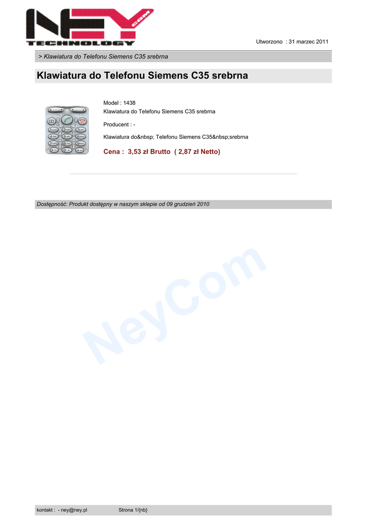 Utworzono : 31 marzec 2011 > Klawiatura do Telefonu Siemens C35 srebrna Klawiatura do Telefonu Siemens C35 srebrna Model : 1438 Klawiatura do Telefonu Siemens C35 srebrna Producent : Klawiatura do Telefonu Siemens C35 srebrna Cena : 3,53 zł Brutto ( 2,87 zł Netto) Dostępność: Produkt dostępny w naszym sklepie od 09 grudzień 2010 C y m o e N kontakt : - [email protected] Strona 1/{nb}