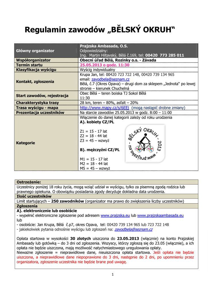 Regulamin zawodów „BĚLSKÝ OKRUH“ Główny organizator Współorganizator Termin startu Klasyfikacja wyścigu Kontakt, zgłoszenia Start zawodów, rejestracja Charakterystyka trasy Trasa wyścigu - mapa Prezentacja uczestników Kategorie Prajzska Ambasada, O.S. Odpowiedzialny: Ing. Martin Hiltavský, Bělá č.169, tel: 00420 773 285 011 Obecní úřad Bělá, Rozinky o.s. - Závada 25.05.2013 o godz. 11:30 Wyścig indywidualny Krupa Jan, tel: 00420 723 722 148, 00420 739 134 965 email: [email protected] Bělá, č.7 (Okres Opava) – drugi dom za sklepem „Jednota“ po lewej stronie – kierunek Chuchelná Obec Bělá – teren boiska TJ Sokol Bělá 11:30 28 km, teren – 80%, asfalt – 20% http://www.mapy.cz/s/6EEj (mogą nastąpić drobne zmiany) Na starcie zawodów 25.05.2013 w godz. 8:00 – 11:00 Włączenie do danej kategorii zależy od roku urodzenia A). kobiety CZ/PL Z1 = 15 - 17 lat Z2 = 18 - 44 lat Z3 = 45 – wzwyż B). mężczyźni CZ/PL M1 = 15 - 17 lat M2 = 18 - 44 lat M5 = 45 – wzwyż Ostrzeżenie: Uczestnicy poniżej 18 roku życia, mogą wziąć udział w wyścigu, tylko za pisemną zgodą rodzica lub prawnego opiekuna. O obowiązku posiadania zgody decyduje dokładna data urodzenia. Ilość uczestników Limit startujących – 250 zawodników (organizator ma prawo do zwiększenia liczby uczestników) Zgłoszenia A). elektronicznie lub osobiście - wypełnić elektroniczne zgłoszenie pod adresem www.prajzska.eu lub www.prajzskaambasada.eu lub - osobiście: Jan Krupa, Bělá č.p7, okres Opava, tel: 00420 739 134 965 lub 723 722 148 - jakiekolwiek pytania odnośnie wyścigu lub zgłoszeń na: [email protected] Opłata startowa w wysokości 30 zlotych uiszczona do 23.05.2013 (włącznie) na konto Prajzskiej Ambasady lub gotówką – do 3 dni od zgłoszenia. Wszyscy, którzy zgłoszą się do 23.05 (włącznie), a ich opłata nie będzie uiszczona, mają możliwość natychmiastowego uregulowania opłaty. Nieważne zgłoszenie = nieprawidłowe dane, nieuiszczona opłata startowa. Jeśli opłata nie będzie uiszczona, a nieprawidłowe dane niepoprawione do 3 dni, następnie do 2 dni, po upomnieniu przez organizatora, zgłoszenie uczestnika nie będzie brane pod uwagę. 1 B). zgłoszenie w dzień wyścigu Zgłoszenia w dzień wyścigu, tj. 25.05.2013 na miejscu zawodów z podwyższoną opłatą startową 40 zlotych. Zgłoszenie jest ważne dopiero po uiszczeniu opłaty startowej!!! 25.05.2013 zgłoszenia osób zainteresowanych będą rozpatrywane indywidualnie (organizator zastrzega sobie prawo do zmiany postępowania wynikającego z danej sytuacji) Opłata startowa i jej uiszczenie Opłatę startową należy uiścić: a). przelewem na konto organizatora: 43-9307820207/0100 (dane do przelewu zostaną automatycznie przesłane na adres mailowy, po odesłaniu zgłoszenia) b). gotówką bezpośrednio organizatorowi – zostanie wystawione potwierdzenie płatności. W przypadku odwołania wyścigu (z przyczyn niezależnych od organizatora np. bardzo niekorzystna pogoda) opłata startowa nie będzie zwracana. W przypadku odwołania wyścigu bez podania przyczyny, opłata będzie zwrócona wszystkim uczestnikom, a sponsorom – wszystkie ufundowane nagrody. W przypadku niestawienia się na wyścigu opłata nie będzie zwracana. Opłata startowa w dzień wyścigu 40 zlotych. Start i meta wyścigu Start wyścigu: 25.05.2013 teren TJ Sokol Bělá 11:30. Zegar zacznie mierzyć czas po przejechaniu przez uczestnika specjalnej bramki. Pojawianie się: 8:30 – 11:00 Meta wyścigu: teren TJ Sokol Bělá. Po przejechaniu bramki na mecie, zegar zatrzyma się. Organizator zastrzega sobie prawo do: 1. Zmiany terminu wyścigu z powodu niesprzyjających warunków atmosferycznych lub przyczyn niezależnych od organizatora. 2. Modyfikacji trasy przejazdu o +/- 2 km. Limit czasu dojazdu do mety: 3 godziny. Mierzenie czasu i wyniki W obszarze startu umieszczony będzie czasomierz (każdy zawodnik otrzyma elektroniczny czip). Wyniki wyścigu, po jego ukończeniu zostaną przesłane na adresy mailowe uczestników. Lista końcowa będzie do wglądu na stronach internetowych: www.prajzska.eu lub www.prajzskaambasada.eu Nagrody dla zwycięzców: nagrody rzeczowe dla pierwszych trzech osób w każdej kategorii. Główna nagroda będzie rozlosowana spośród wszystkich uczestników, którzy ukończą wyścig (dojadą do mety). Warunki uczestnictwa: Kask ochronny – zalecany. Wyścig odbywa się w normalnym ruchu drogowym. Każdy uczestnik zobowiązany jest przestrzegać zasad ruchu drogowego. Każdy uczestniczy na własną odpowiedzialność. Wypełniając zgłoszenie on-line lub własnoręcznym podpisem na zgłoszeniu każdy uczestnik potwierdza oświadczenie: „Tym oto zgłoszeniem zgadzam się z wyżej przedstawionymi zasadami uczestnictwa w wyścigu, uczestnicząc w nim na własną odpowiedzialność. Zaznajomiłem (-am) się z zasadami bezpieczeństwa i zasadami ruchu drogowego, które zobowiązuję się przestrzegać. Oświadczam, że jestem świadomy (-a), że ponoszę wszelką odpowiedzialność za szkody materialne i fizyczne, wyrządzone przeze mnie - sobie, organizatorowi i osobom trzecim przed, w trakcie czy po wyścigu. Będę przestrzegał zasad fair-play, zaoferuję pomoc drugiemu człowiekowi, nawet za cenę utraty pierwszego miejsca. W czasie wyścigu nie będę naruszał środowiska i rzeczy osób trzecich.” Zalecamy odbycie badania lekarskiego, a także posiadanie ubezpieczenia zdrowotnego, a także ubezpieczenie za szkody w stosunku do osób trzecich (ubezpieczenie odpowiedzialności cywilnej). Dla uczestników przewidziany jest poczęstunek Gry i zabawy dla dzieci. Więcej informacji na www.prajzska.eu lub na www.prajzskaambasada.eu 2
