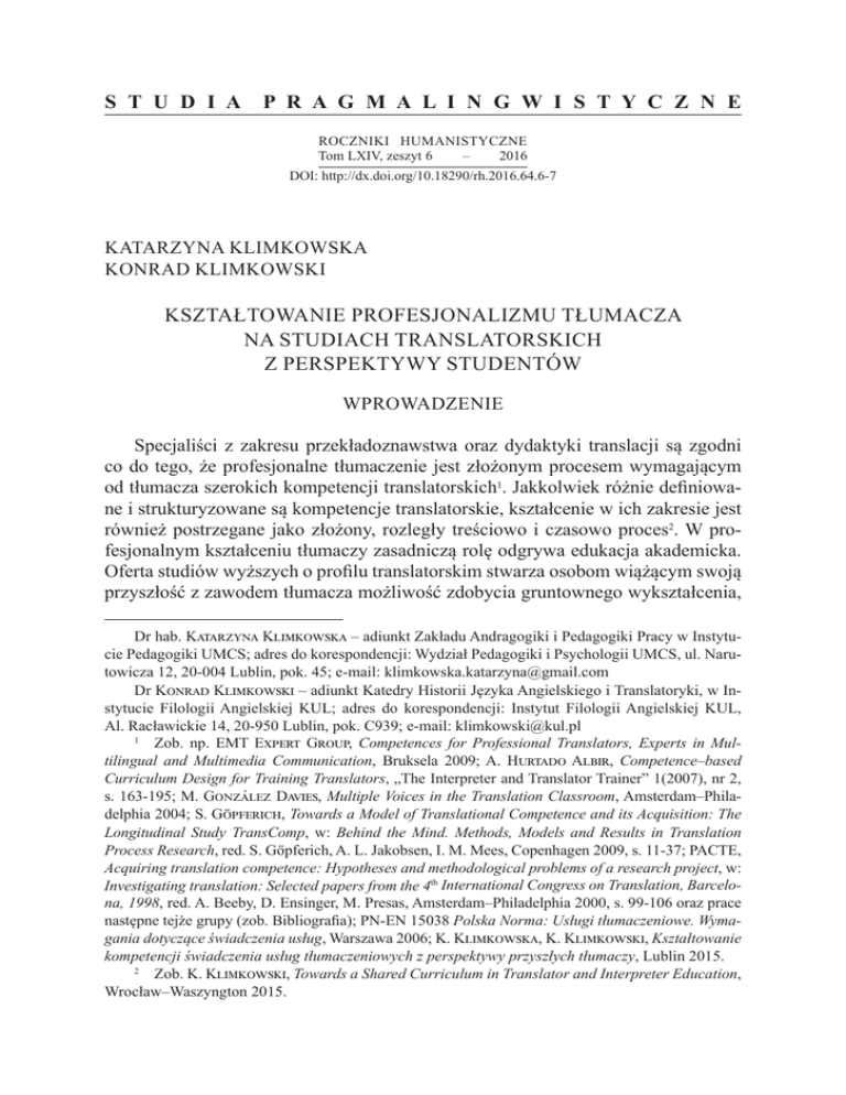 S T U D I A P R A G M A L I N G W I S T Y C Z N E ROCZNIKI HUMANISTYCZNE Tom LXIV, zeszyt 6 – 2016 DOI: http://dx.doi.org/10.18290/rh.2016.64.6-7 KATARZYNA KLIMKOWSKA KONRAD KLIMKOWSKI KSZTAŁTOWANIE PROFESJONALIZMU TŁUMACZA NA STUDIACH TRANSLATORSKICH Z PERSPEKTYWY STUDENTÓW WPROWADZENIE Specjaliści z zakresu przekładoznawstwa oraz dydaktyki translacji są zgodni co do tego, że profesjonalne tłumaczenie jest złożonym procesem wymagającym od tłumacza szerokich kompetencji translatorskich1. Jakkolwiek różnie definiowane i strukturyzowane są kompetencje translatorskie, kształcenie w ich zakresie jest również postrzegane jako złożony, rozległy treściowo i czasowo proces2. W profesjonalnym kształceniu tłumaczy zasadniczą rolę odgrywa edukacja akademicka. Oferta studiów wyższych o profilu translatorskim stwarza osobom wiążącym swoją przyszłość z zawodem tłumacza możliwość zdobycia gruntownego wykształcenia, Dr hab. Katarzyna Klimkowska – adiunkt Zakładu Andragogiki i Pedagogiki Pracy w Instytucie Pedagogiki UMCS; adres do korespondencji: Wydział Pedagogiki i Psychologii UMCS, ul. Narutowicza 12, 20-004 Lublin, pok. 45; e-mail: [email protected] Dr Konrad Klimkowski – adiunkt Katedry Historii Języka Angielskiego i Translatoryki, w Instytucie Filologii Angielskiej KUL; adres do korespondencji: Instytut Filologii Angielskiej KUL, Al. Racławickie 14, 20-950 Lublin, pok. C939; e-mail: [email protected] 1 Zob. np. EMT Expert Group, Competences for Professional Translators, Experts in Multilingual and Multimedia Communication, Bruksela 2009; A. Hurtado Albir, Competence–based Curriculum Design for Training Translators, „The Interpreter and Translator Trainer” 1(2007), nr 2, s. 163-195; M. González Davies, Multiple Voices in the Translation Classroom, Amsterdam–Philadelphia 2004; S. Göpferich, Towards a Model of Translational Competence and its Acquisition: The Longitudinal Study TransComp, w: Behind the Mind. Methods, Models and Results in Translation Process Research, red. S. Göpferich, A. L. Jakobsen, I. M. Mees, Copenhagen 2009, s. 11-37; PACTE, Acquiring translation competence: Hypotheses and methodological problems of a research project, w: Investigating translation: Selected papers from the 4th International Congress on Translation, Barcelona, 1998, red. A. Beeby, D. Ensinger, M. Presas, Amsterdam–Philadelphia 2000, s. 99-106 oraz prace następne tejże grupy (zob. Bibliografia); PN-EN 15038 Polska Norma: Usługi tłumaczeniowe. Wymagania dotyczące świadczenia usług, Warszawa 2006; K. Klimkowska, K. Klimkowski, Kształtowanie kompetencji świadczenia usług tłumaczeniowych z perspektywy przyszłych tłumaczy, Lublin 2015. 2 Zob. K. Klimkowski, Towards a Shared Curriculum in Translator and Interpreter Education, Wrocław–Waszyngton 2015. 118 KATARZYNA KLIMKOWSKA, KONRAD KLIMKOWSKI na które składają się – w myśl Krajowych Ram Kwalifikacji – wiedza, umiejętności i kompetencje społeczne odnoszące się do danej dziedziny. Dbałość o jakość tego kształcenia na studiach wyższych wymaga ustawicznego monitorowania i ewaluacji procesów i zjawisk na nie się składających. Do takich analiz należą między innymi badania różnych aspektów funkcjonowania edukacyjno-zawodowego studentów. Aby móc nie tyle oceniać „twarde” efekty kształcenia, ale rozumieć „stawanie się profesjonalnymi tłumaczami” studentów, ważne jest, w przekonaniu autorów niniejszego opracowania, prowadzenie badań interdyscyplinarnych, łączących perspektywę kształcenia tłumaczy z psychopedagogicznym punktem widzenia. Przeprowadzone dotychczas przez autorów eksploracje wybranych aspektów funkcjonowania przyszłych tłumaczy – m.in. ich orientacji na sukces zawodowy, proaktywności, przedsiębiorczości, jak również ich potrzeb i oczekiwań odnośnie do zajęć translatorskich3 czy przekonań na temat kształcenia kompetencyjnego na studiach translatorskich4, pozwoliły poznać badaną młodzież akademicką jako zbiorowości młodych dorosłych w znaczniej mierze zaangażowanych w swój rozwój, edukację, kształtowanie własnego profesjonalizmu. Ujawniły również istotne obszary trudności, niepewności i niezdecydowania, które w perspektywie tranzycji na rynek pracy można traktować jako niosące ryzyko porażki, a w perspektywie edukacji akademickiej jako zidentyfikowane potrzeby i zadania dla organizacji procesu kształcenia. Wyniki tych badań, realizowanych w paradygmacie ilościowym, pozwoliły na szerszy ogląd badanych kwestii, przy czym przyjęta optyka metodologiczna pociągnęła za sobą ryzyko trudnych do uniknięcia uproszczeń, a jednocześnie ukazała potrzebę pogłębionych badań jakościowych odnośnie do autokreacji zawodowej przyszłych tłumaczy. Dlatego autorzy postanowili, stosując metodologię jakościową, oddać głos mniejszym grupom, w których można było usłyszeć pojedyncze osoby. W świetle wskazanych wyżej, zrelacjonowanych i zinterpretowanych badań nad akademickim kształceniem tłumaczy autorzy zidentyfikowali obszar funkcjonowania edukacyjno-zawodowego studentów, który był trudno dostępny bądź niemal 3 Zob. K. Klimkowska, Orientacja na sukces zawodowy studentów kończących studia translatorskie, Lublin 2013; K. Klimkowska, Cognitive Proactivity of Translators-to-be, “Language and Literary Studies of Warsaw” 4(2014), s. 223-237; K. Klimkowska, Education for Success in Translation Courses as Assessed by Translators-to-be, w: Challenges of Contemporary Education – Theoretical and Empirical Contexts, red. A. Dudak, A. Kanios, O. Karpenko, Drochobych 2014, s. 193204; K. Klimkowska, Entrepreneurial Potential of the Students of Applied Linguistics Programme majoring in translation, „Academic Journal of Modern Philology” 3(2014), s. 18-26; K. Klimkowski, Towards a Shared Curriculum; K. Klimkowski, Specjalista językowy jako przedsiębiorca, w: Nauczanie języków 