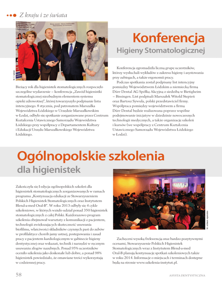 Z kraju i ze świata Konferencja fot. E. Ładziak Higieny Stomatologicznej Bieżący rok dla higienistek stomatologicznych rozpoczęło szczególne wydarzenie – konferencja „Zawód higienistki stomatologicznej niezbędnym elementem systemu opieki zdrowotnej”, której towarzyszyło podpisanie listu intencyjnego. 8 stycznia, pod patronatem Marszałka Województwa Łódzkiego w Urzędzie Marszałkowskim w Łodzi, odbyło się spotkanie zorganizowane przez Centrum Kształcenia Ustawicznego Samorządu Województwa Łódzkiego przy współpracy z Departamentem Kultury i Edukacji Urzędu Marszałkowskiego Województwa Łódzkiego. Konferencja zgromadziła liczną grupę uczestników, którzy wysłuchali wykładów z zakresu higieny i asystowania przy zabiegach, a także ergonomii pracy. Podczas spotkania został podpisany list intencyjny pomiędzy Województwem Łódzkim a niemiecką firmą Dürr Dental AG Spółką Akcyjną z siedzibą w Bietigheim – Bissingen. List podpisali Marszałek Witold Stępień oraz Bartosz Sywula, polski przedstawiciel firmy. Współpraca pomiędzy województwem a firmą Dürr Dental będzie realizowana poprzez wspólne podejmowanie inicjatyw w dziedzinie nowoczesnych technologii medycznych, a także organizację szkoleń i kursów (we współpracy z Centrum Kształcenia Ustawicznego Samorządu Województwa Łódzkiego w Łodzi). Ogólnopolskie szkolenia Zakończyła się I edycja ogólnopolskich szkoleń dla higienistek stomatologicznych zorganizowanych w ramach programu „Kontynuacja edukacji ze Stowarzyszeniem Polskich Higienistek Stomatologicznych oraz Instytutem Blend-a-med Oral-B”. W roku 2013 odbyły się 4 cykle szkoleniowe, w których wzięło udział ponad 350 higienistek stomatologicznych z całej Polski. Każdorazowo program szkolenia obejmował warsztaty z komunikacji z pacjentem, technologii zwiększających skuteczność usuwania biofilmu, właściwości składników czynnych past do zębów w profilaktyce chorób jamy ustnej, postępowania i zasad pracy z pacjentem kardiologicznym w gabinecie higieny dentystycznej oraz wskazań, technik i narzędzi w ręcznym usuwaniu złogów nazębnych. Ponad 95% uczestników oceniło szkolenia jako doskonałe lub dobre, a ponad 98% higienistek powiedziało, że omawiane treści wykorzystają w codziennej pracy. 58 fot. archiwum organizatora dla higienistek Zachęceni wysoką frekwencją oraz bardzo pozytywnymi ocenami, Stowarzyszenie Polskich Higienistek Stomatologicznych wraz z Instytutem Blend-a-med Oral-B planują kontynuację spotkań szkoleniowych także w roku 2014. Informacje o miejscach i terminach dostępne będą na stronie www.szkolenia-instytut.pl. ASYSTA DENTYSTYCZNA